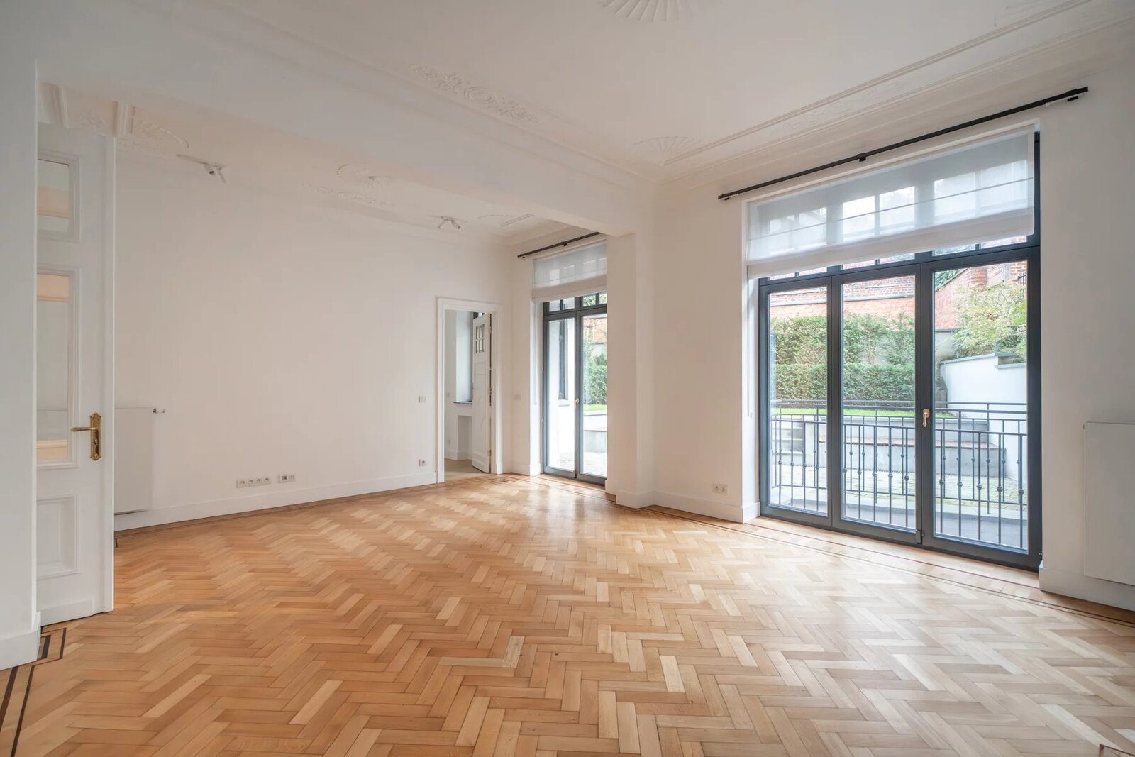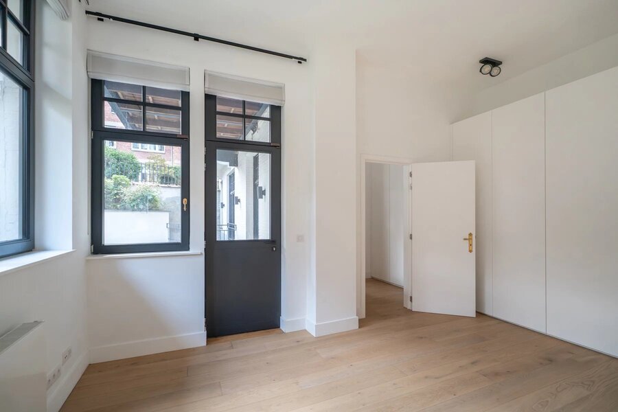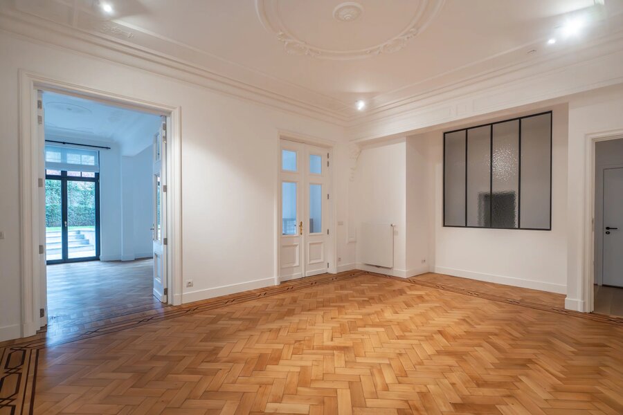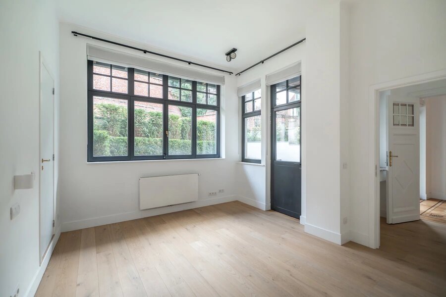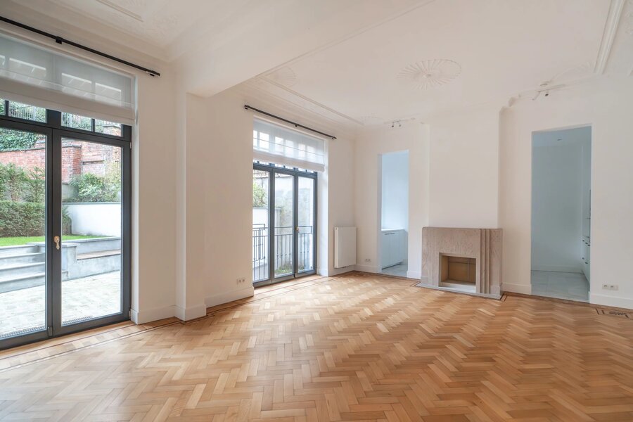 In een gebouw uit 1930, volledig gerenoveerd in 2021, op een steenworp afstand van Place Stéphanie en dicht bij winkels en openbaar vervoer, begane grond drie slaapkamers met een oppervlakte van ± 250m², met een tuin en een terras. Entree, hal met garderobe en gastentoilet, een grote woonkamer en eetkamer met toegang tot het terras en de tuin, een volledig uitgeruste en halfopen keuken, twee slaapkamers, elk met een eigen badkamer met douche, op de benedenverdieping, een prachtige ouderslaapkamer met kleedkamer en eigen badkamer. De flat biedt verschillende opslagruimtes. Hoge plafonds, eerste bewoning na renovatie, parketvloer, wasruimte, kelder, alarm, mogelijkheid om een garage te huren