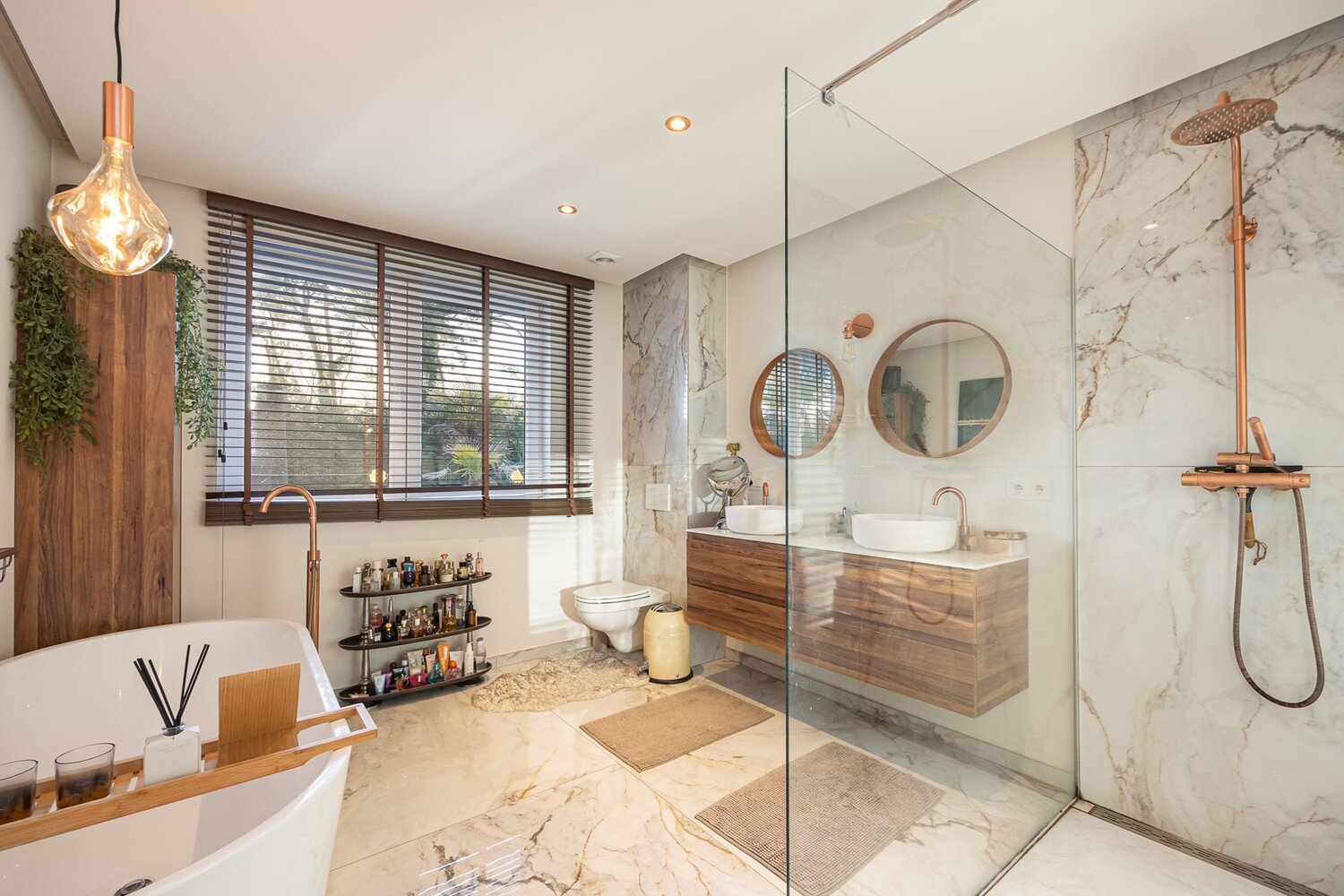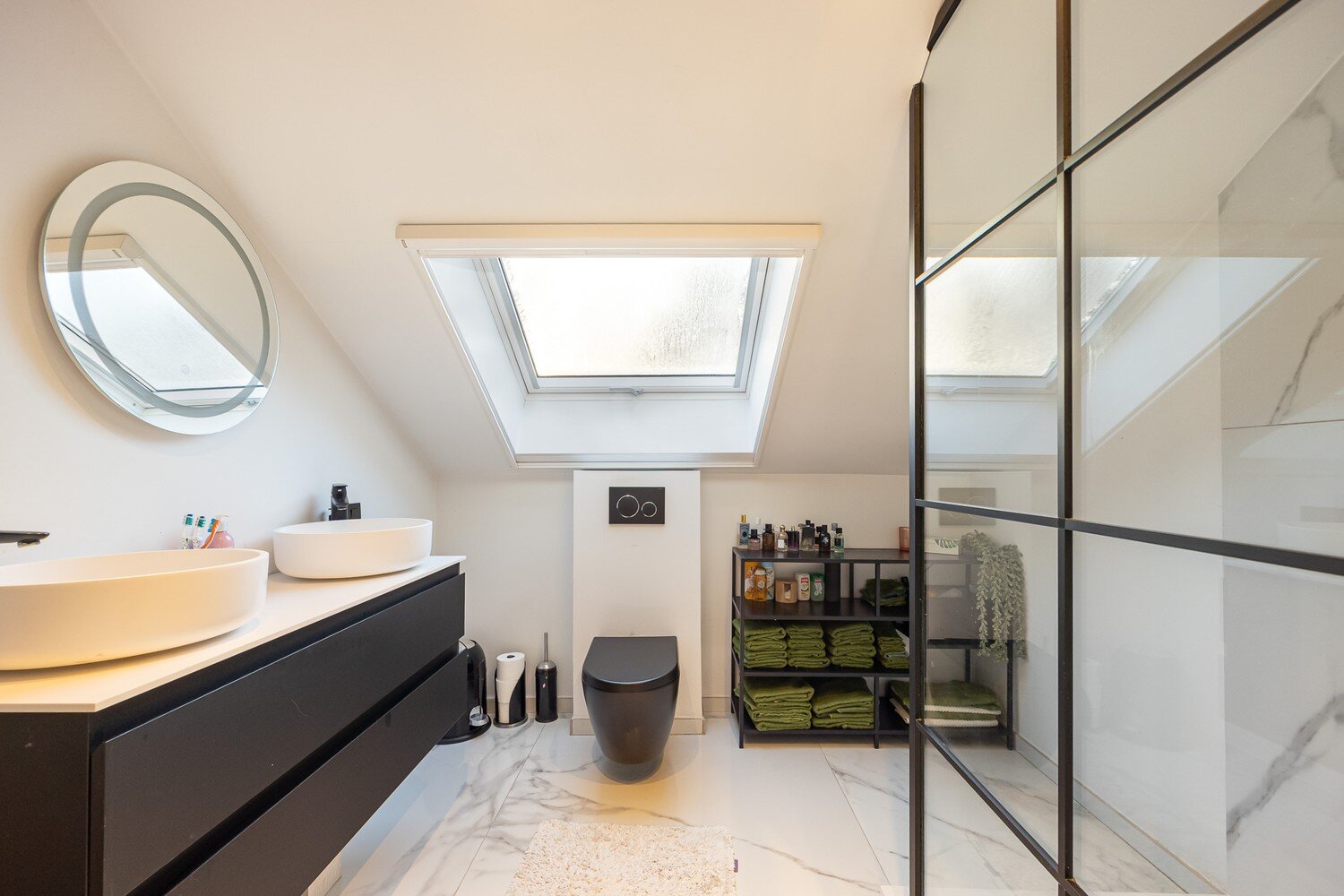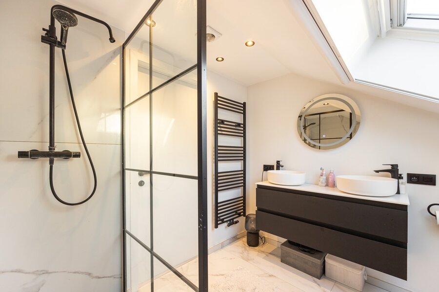 Ook praktisch en comfortabel zit alles goed: er zijn op de gelijkvloerse verdieping 2slaapkamers waarvan 1 met eigen dressing, een volledig ingerichte aparte dressing en een zeer moderne badkamer met bad, inloopdouche, dubbel lavabomeubel en als leuke extra indirecte verlichting. Wat deze eigendom écht uniek maakt, is de indeling met drie volledig aparte units. Op de verdieping bevinden zich namelijk twee identieke, volledig ingerichte units, elk met eigen badkamer, keuken, dressing en salon/woonkamer. Daardoor leent dit huis zich uitzonderlijk goed als kangoeroewoning, of voor wie wonen graag combineert met een zelfstandige invulling, extra privacy of ruimte voor familie.