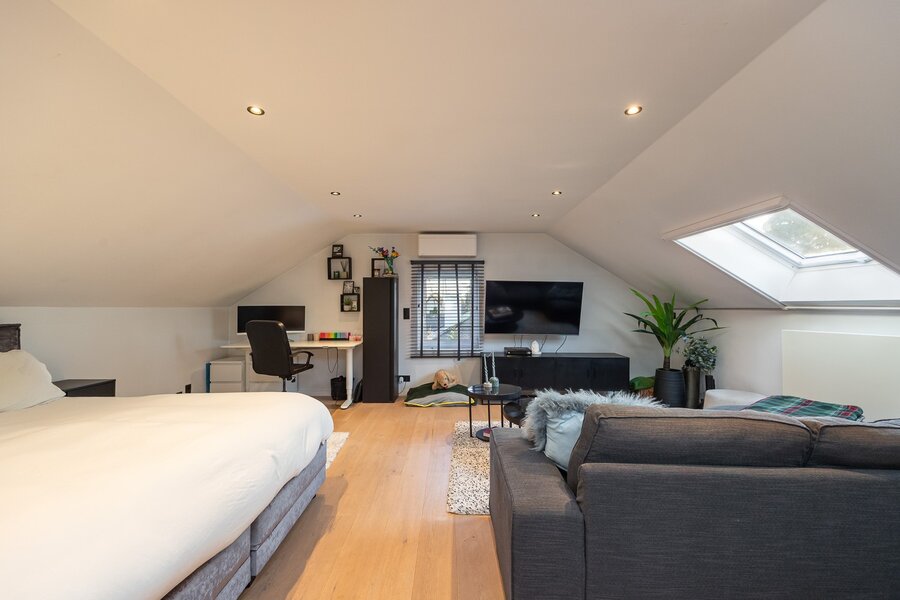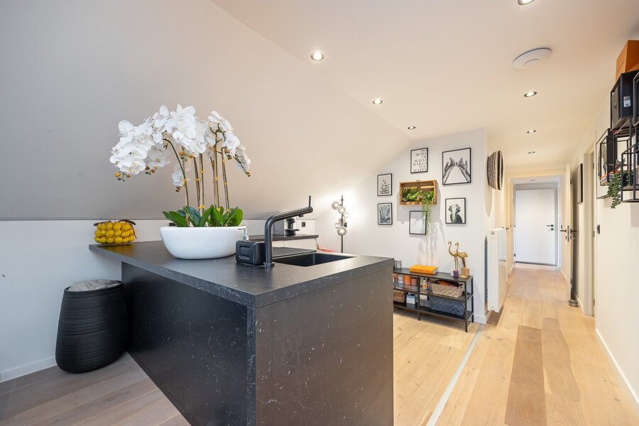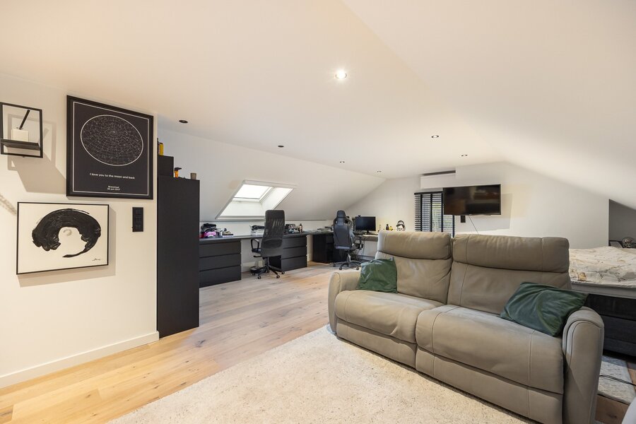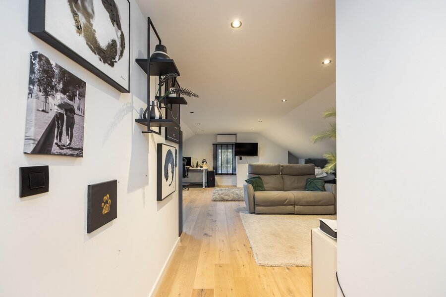 Binnen wordt je ontvangen door een woning die met zorg is ingericht en waarin elke ruimte klopt. Op het gelijkvloers vloeien eetkamer en salon mooi in elkaar over, met als sfeervol middelpunt een prachtige open haard. In de opkamer bevindt zich een gezellig tv-salon: een fijne hoek om je even terug te trekken met een film, een boek of gewoon een glas wijn.