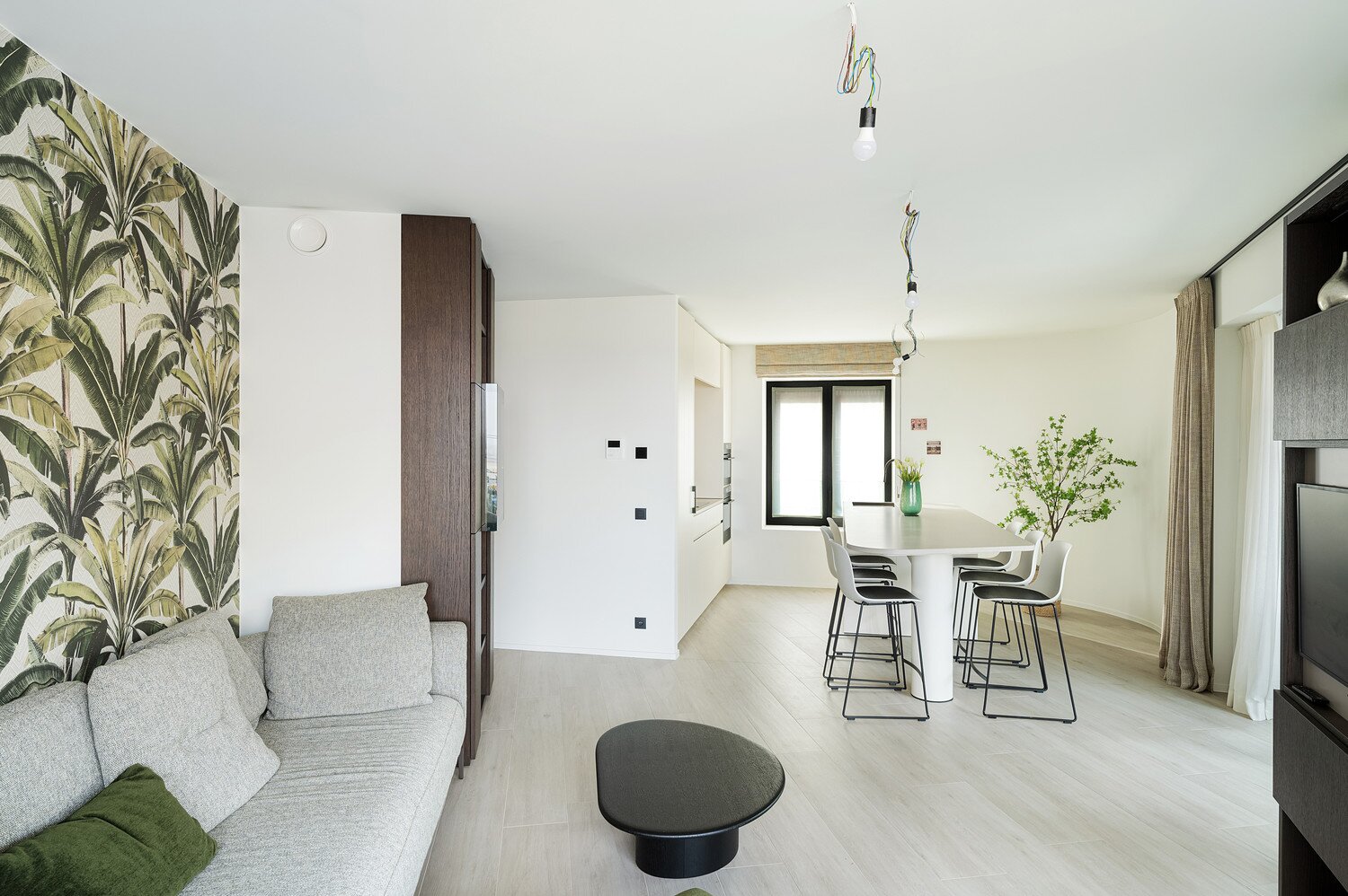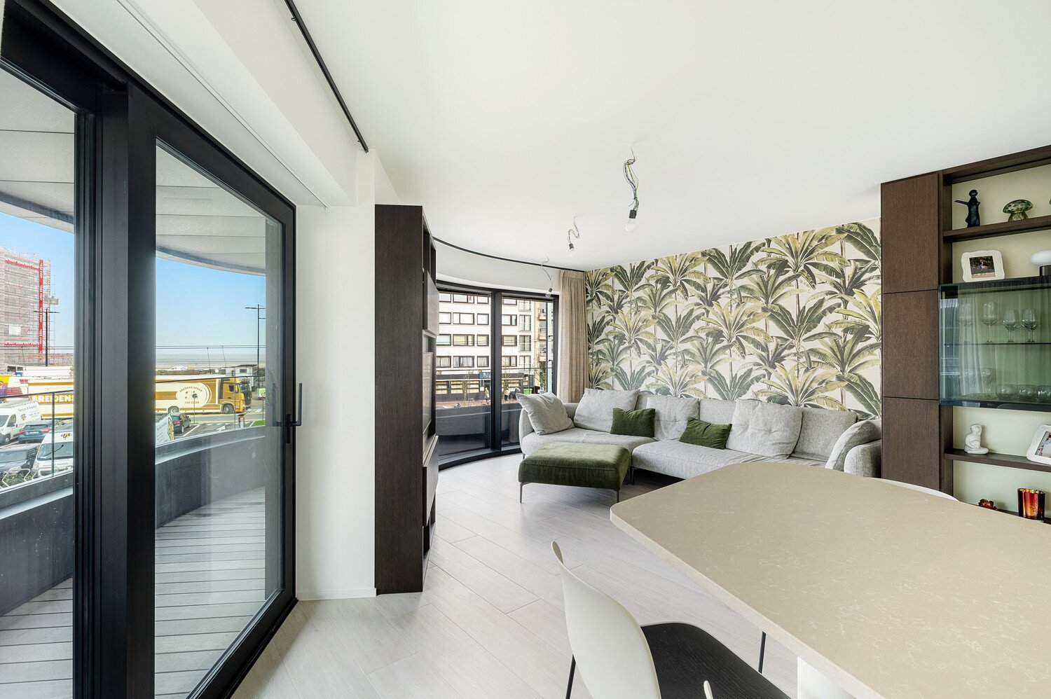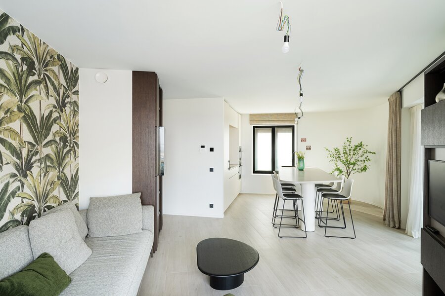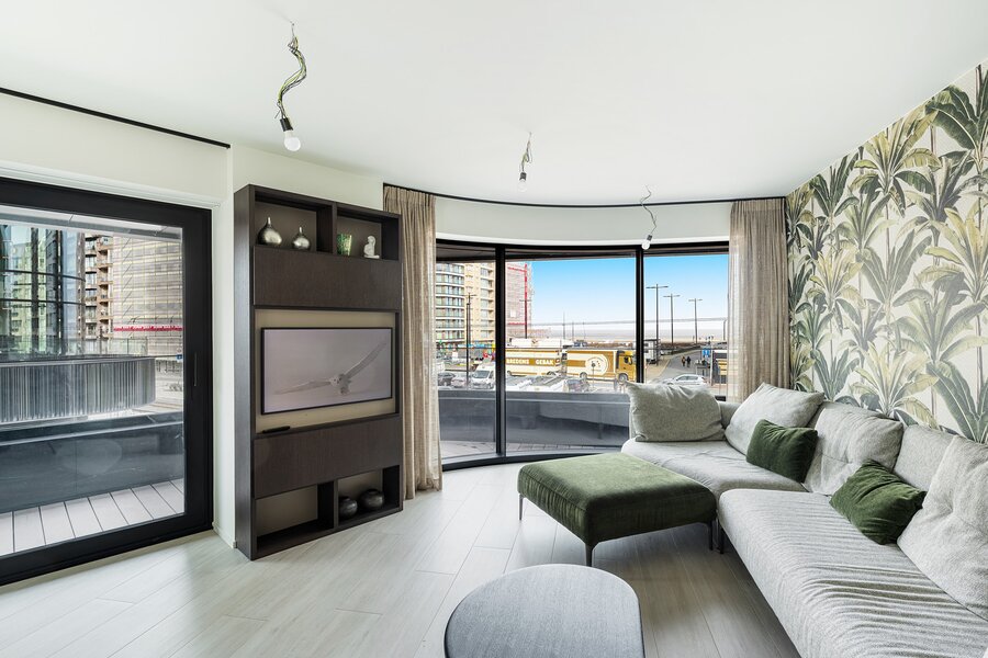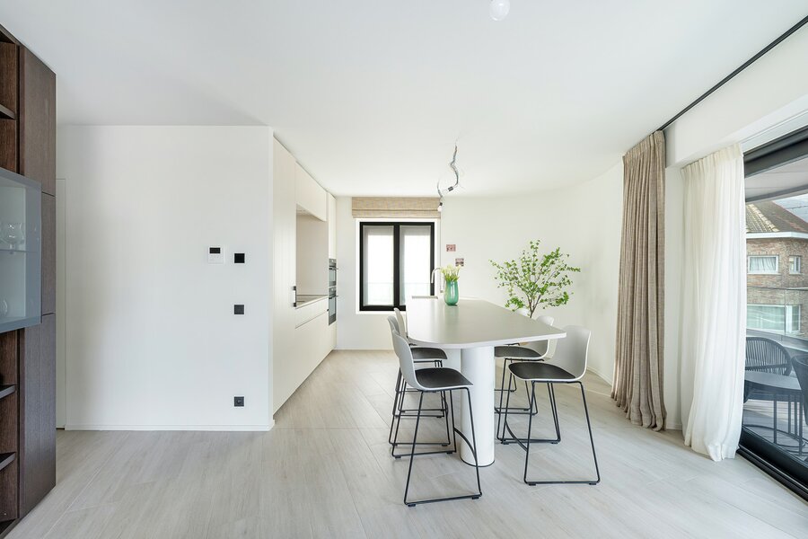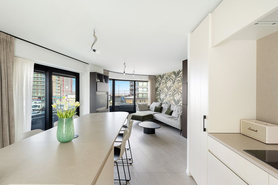 De leefruimte met open keuken is ruim en lichtrijk dankzij de grote raampartijen. Vanuit de woonkamer geniet je van een open zicht richting zee. Het aansluitende terras biedt voldoende plaats om comfortabel buiten te zitten.