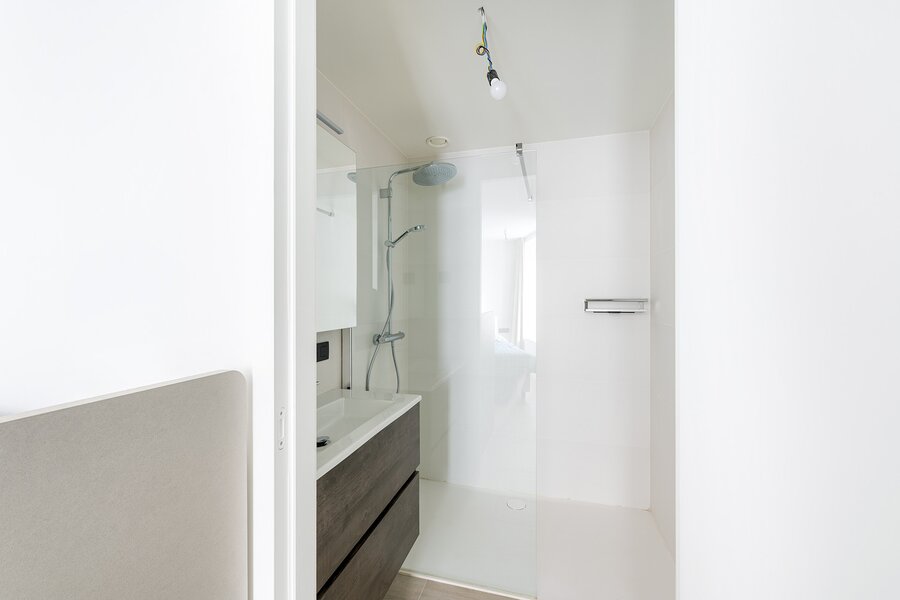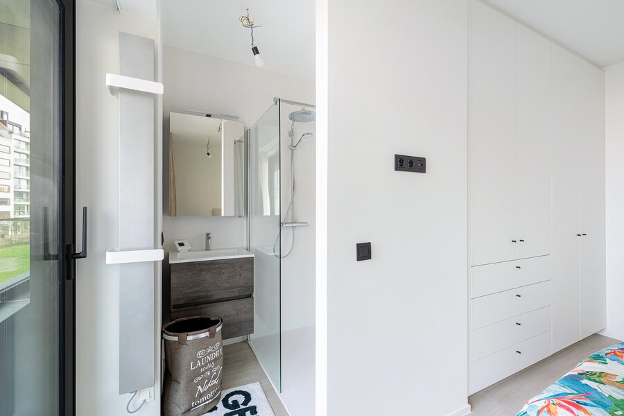 Het appartement beschikt over twee volwaardige slaapkamers, elk met een eigen douchekamer voorzien van lavabomeubel en inloopdouche. Daarnaast is er een apart toilet en zijn er twee praktische bergingen, wat zorgt voor extra gebruiksgemak.