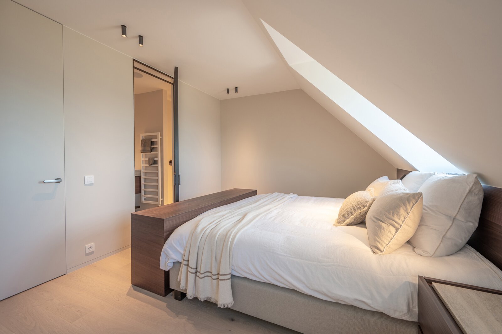 Master suite met ingemaakte kasten en luxueuze badkamer (inloopdouche, dubbele lavabo en wc).