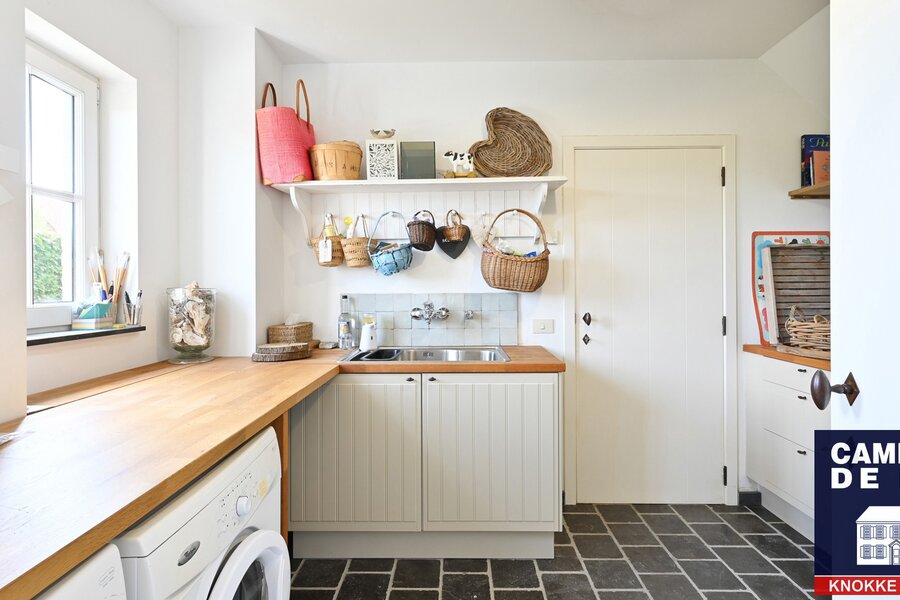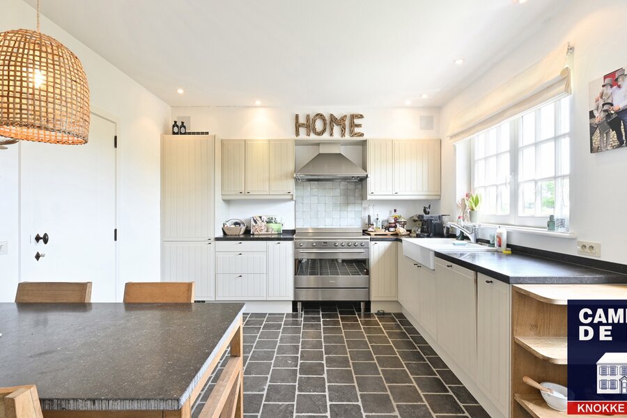 indeling : inkomhal, toilet, living met houthaard van M design, eetkamer, keuken met ontbijthoek, bijkeuken, dubbele garage,