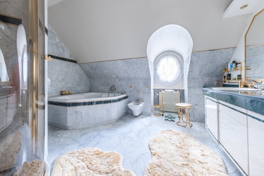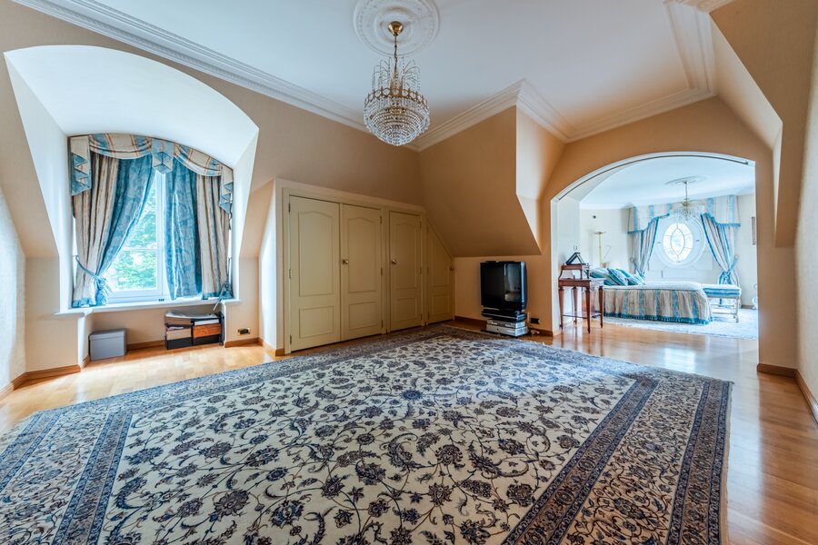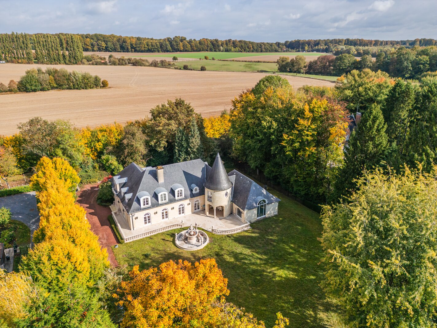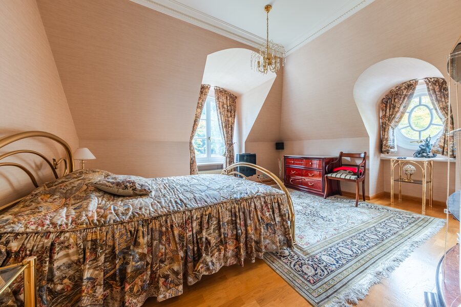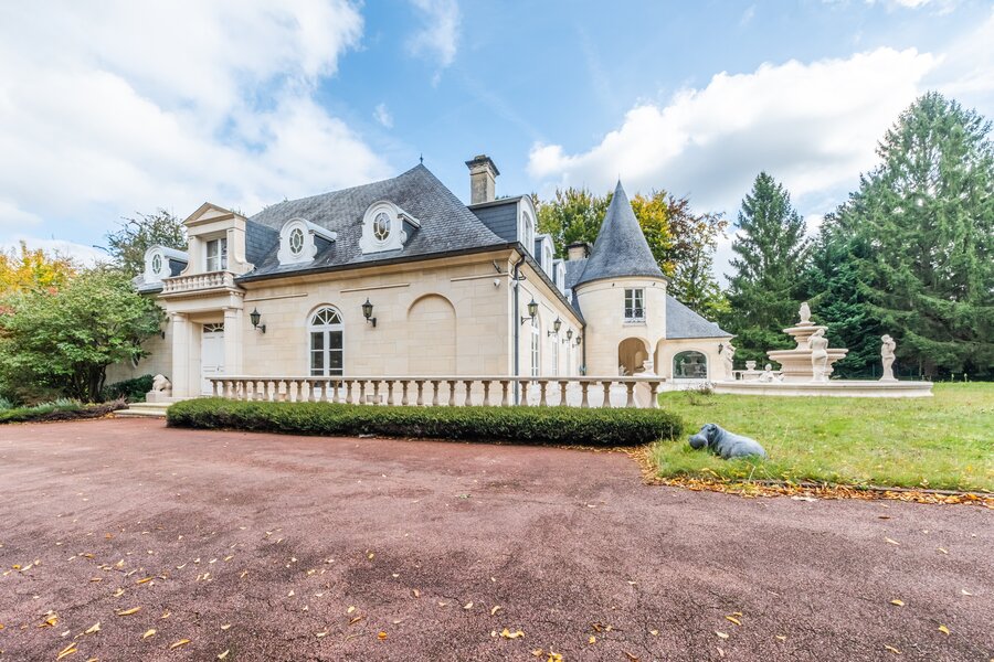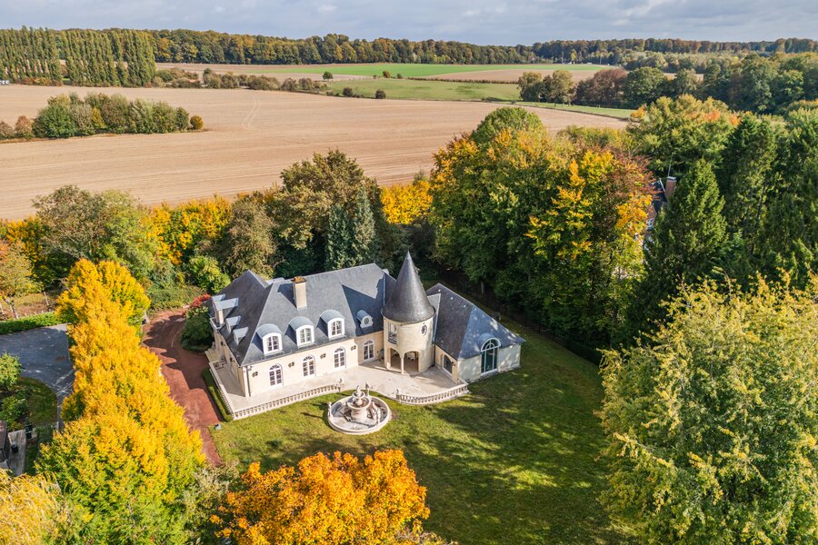 Op de eerste verdieping verdeelt de grote overloop een eerste slaapkamer van ±19,5 m² met en-suite badkamer, een suite met dressing, badkamer en slaapkamer van ±16 m², een andere slaapkamer van ±20 m² met en-suite doucheruimte die toegang geeft tot de ruime zolder, omgevormd tot een maatwerkdressing van ±47 m², een was- en linnenkamer, een vierde slaapkamer van ±16 m² met en-suite doucheruimte, evenals de ouderlijke vleugel met een dressingruimte (of slaapkamer) van ±20 m² en een ronde slaapkamer van ±15 m² met volledige en-suite badkamer.