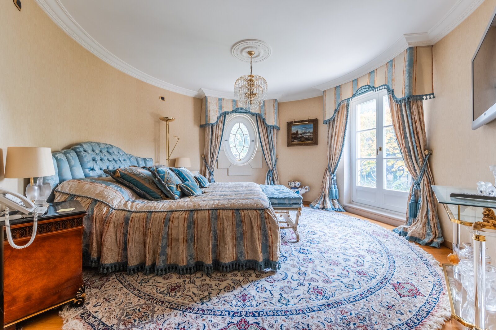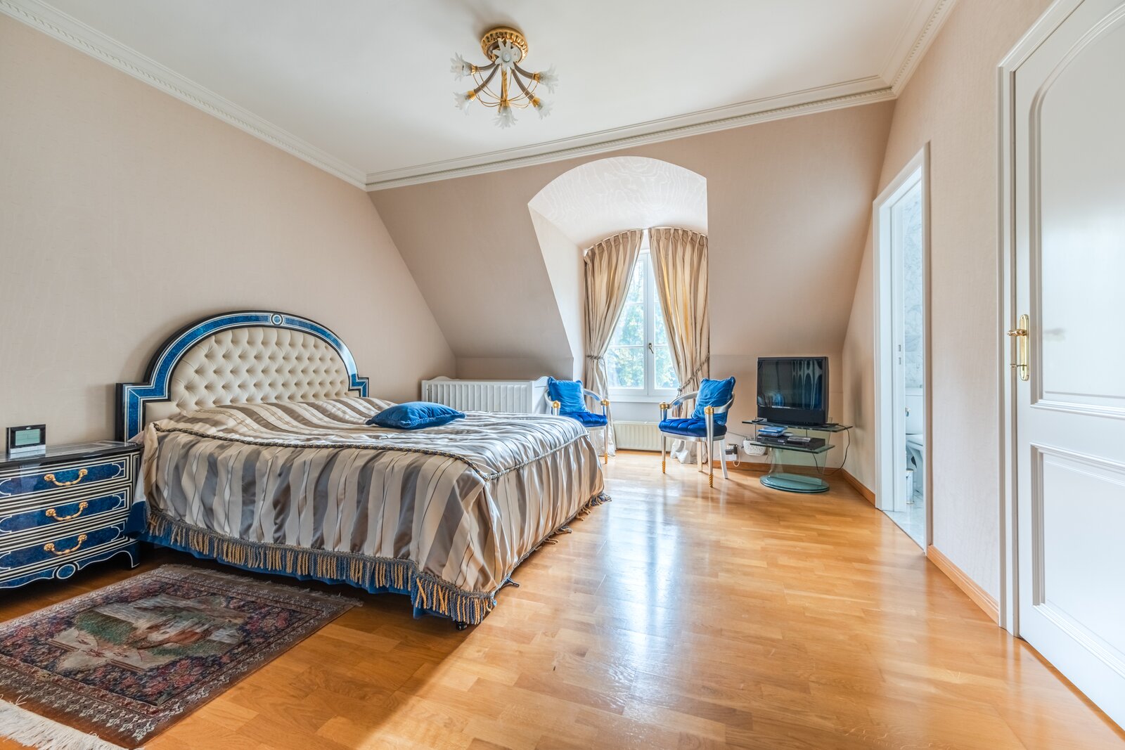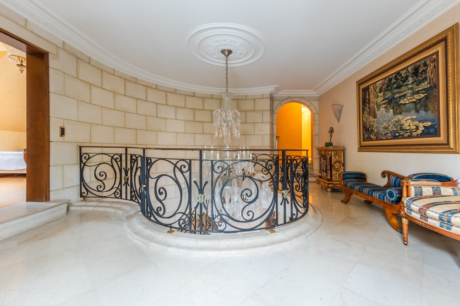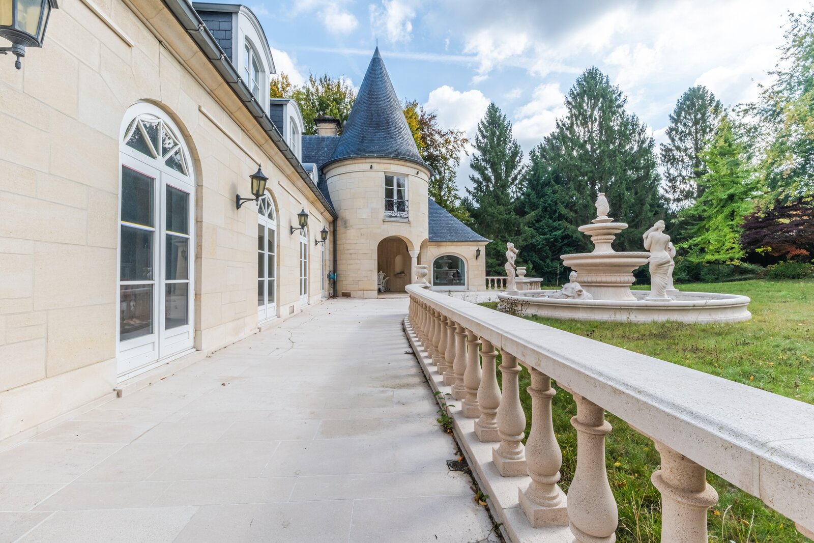 Op de eerste verdieping verdeelt de grote overloop een eerste slaapkamer van ±19,5 m² met en-suite badkamer, een suite met dressing, badkamer en slaapkamer van ±16 m², een andere slaapkamer van ±20 m² met en-suite doucheruimte die toegang geeft tot de ruime zolder, omgevormd tot een maatwerkdressing van ±47 m², een was- en linnenkamer, een vierde slaapkamer van ±16 m² met en-suite doucheruimte, evenals de ouderlijke vleugel met een dressingruimte (of slaapkamer) van ±20 m² en een ronde slaapkamer van ±15 m² met volledige en-suite badkamer.