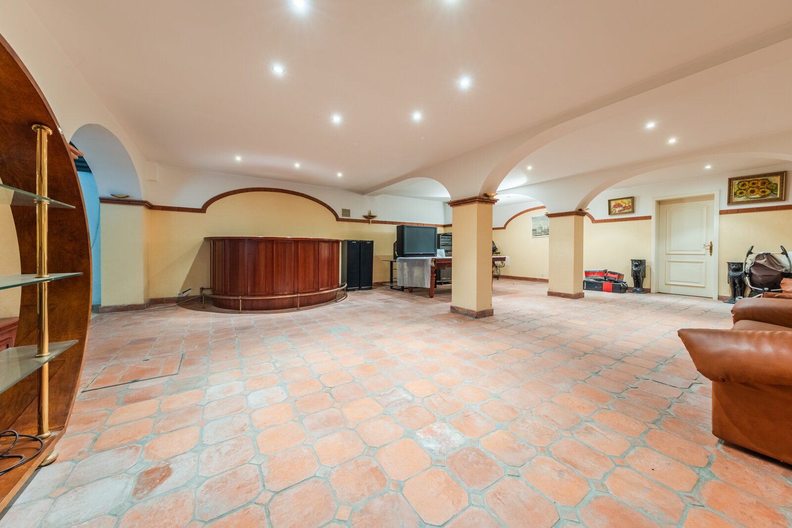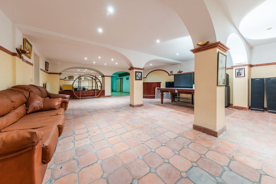 De ruime kelderverdieping omvat een leefruimte (feestzaal), een conciërgewoning en een keldergedeelte. De conciërgewoning, met aparte ingang, omvat een salon, een slaapkamer met badkamer en een kleine keuken. De grote garage van ±80 m², de wijnkelder, de technische kelder, de stookruimte op mazout en verschillende voorraadkelders vervolledigen dit niveau.