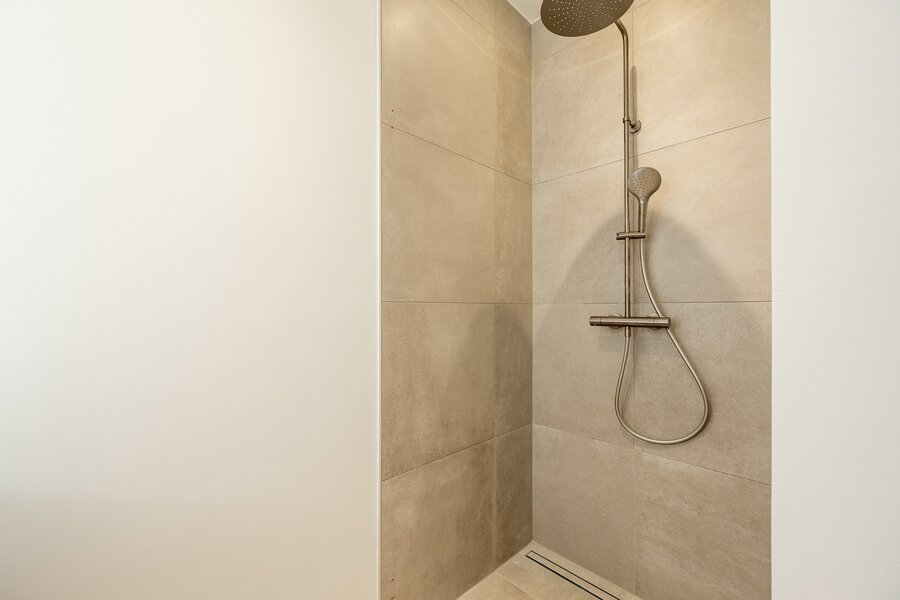 Indeling: inkomhal met vestiaire en gastentoilet. Ruime en lichtrijke woon- en eetkamer met toegang tot het zonnige terras. Open, volledig uitgeruste keuken. Praktische berging met aansluiting voor wasmachine en droogkast. Twee volwaardige slaapkamers, elk met een eigen badkamer. Fietsenberging aanwezig.