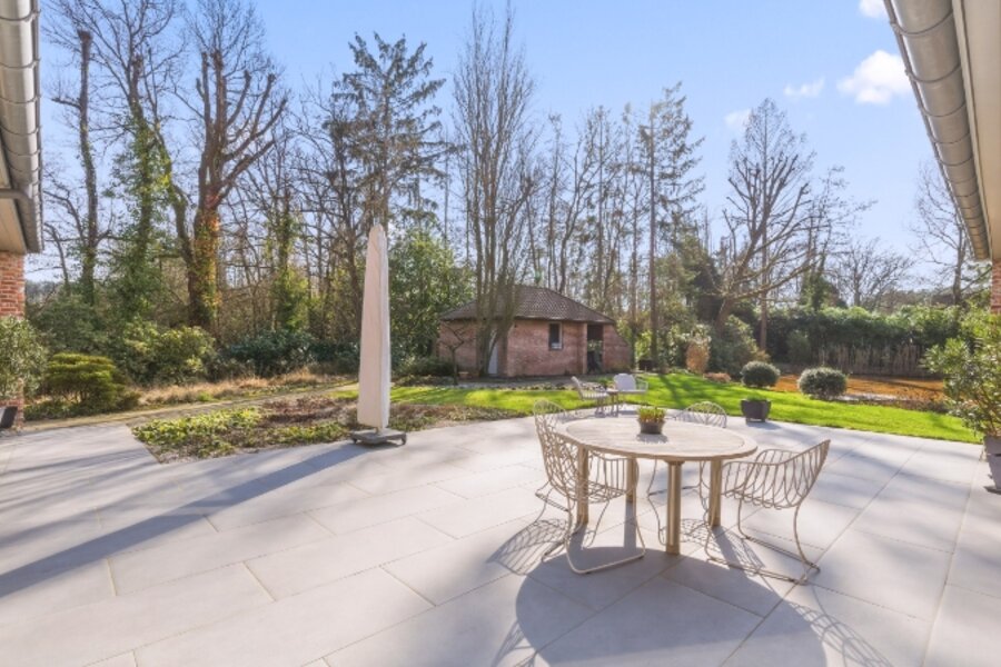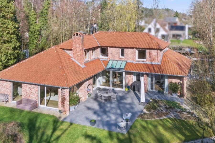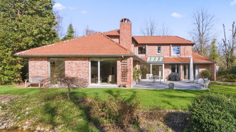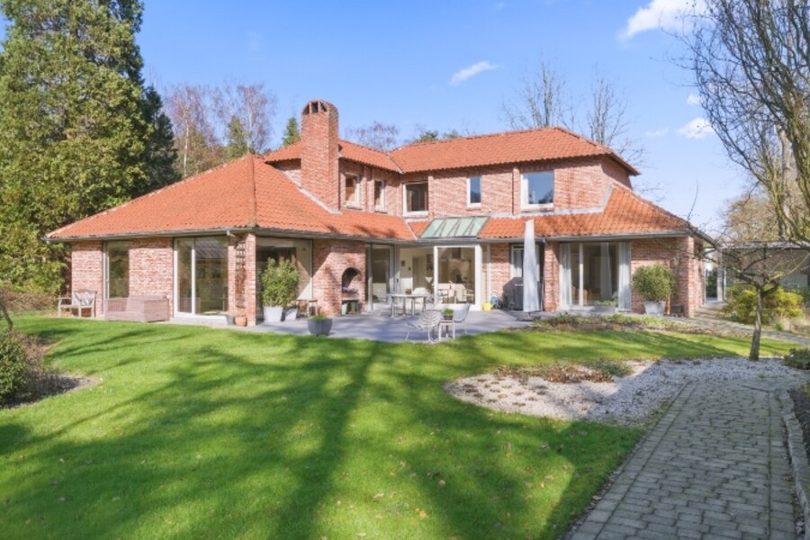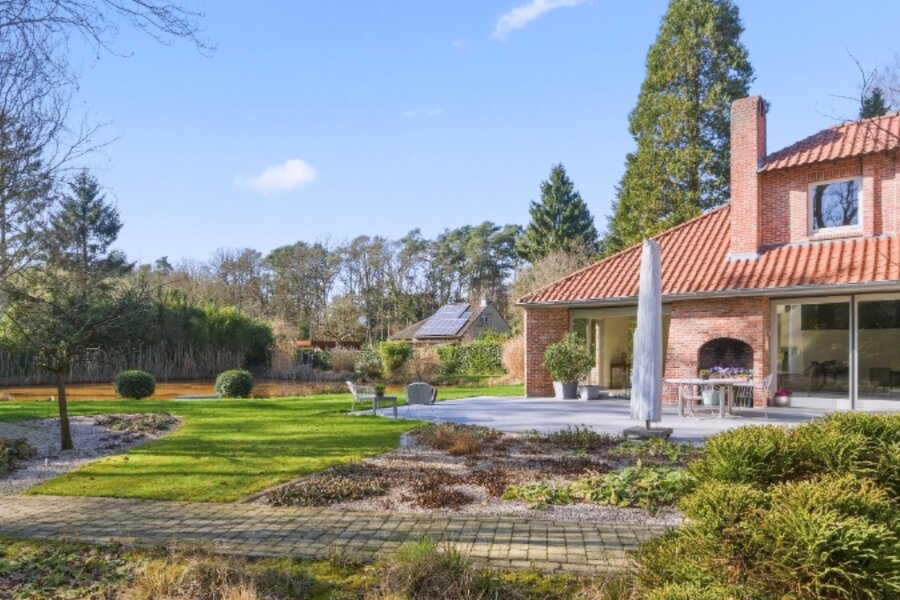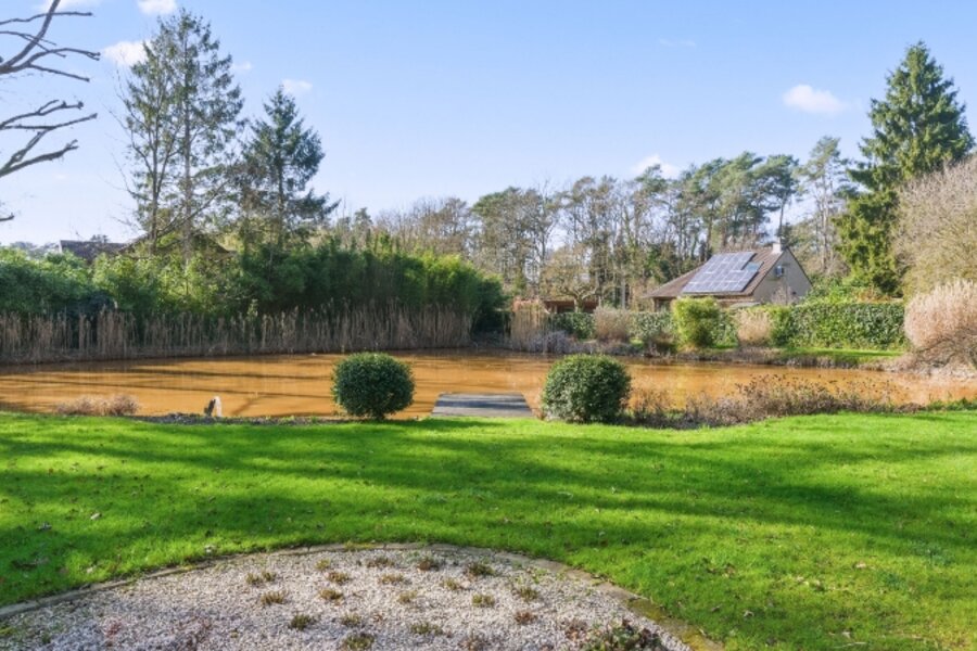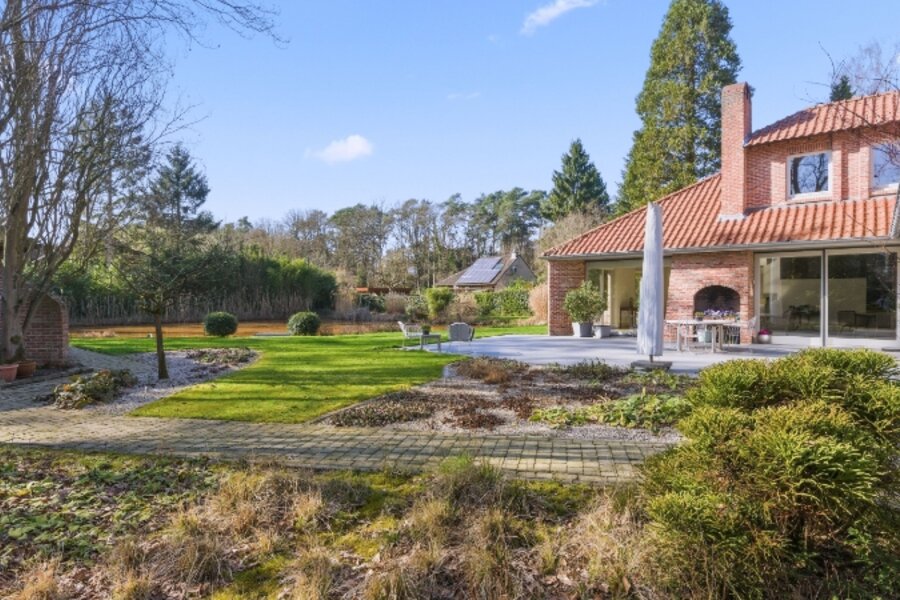 Zeer rustig en uitzonderlijk gelegen villa op een achterliggend perceel van 30 are 48 ca met private toegangsweg, grote vijver en zeer mooie aangelegde tuin.