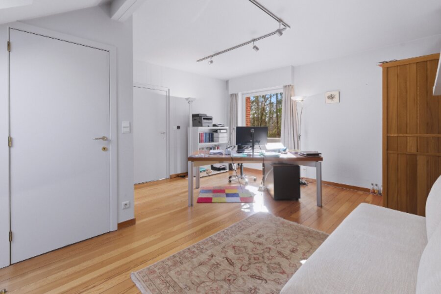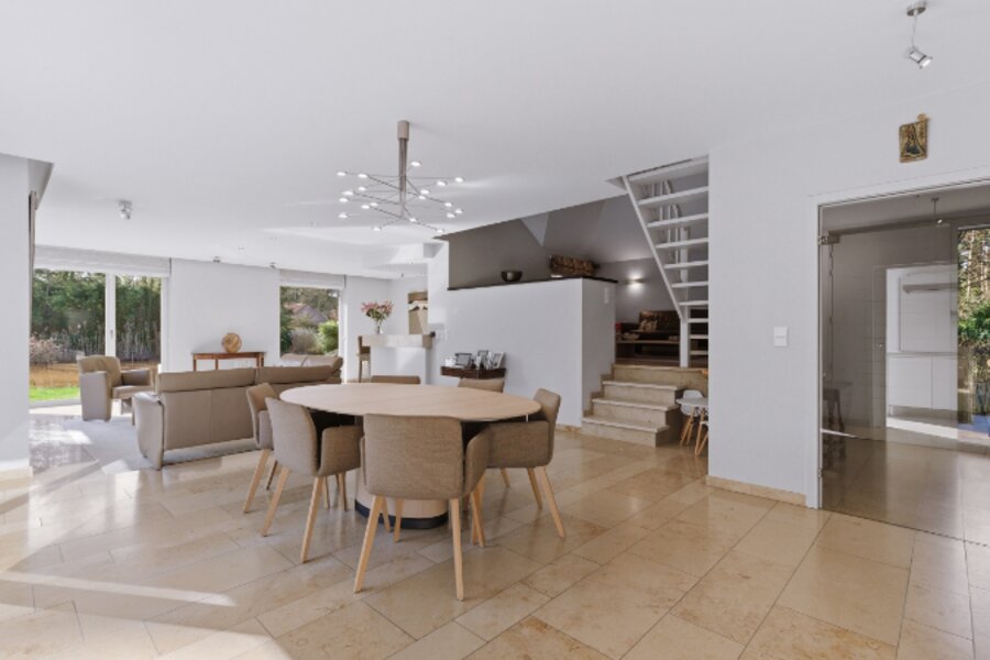 Omvat: inkomhal, wc, zeer ruime zonnige living met mezzanine-bureel-tv-hoek en inbouwhaard, volledig ingerichte keuken met eethoek, koele berging, garage + carport, 3 bad-of douchekamers, 4 slaapkamers (waarvan 2 slaapkamers en 1 badkamer op gelijkvloers), dressing. Bijgebouw: homeoffice en tuinberging.