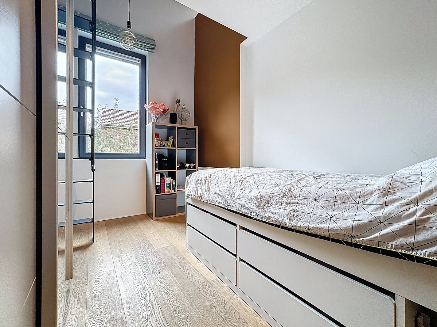De tuinverdieping verrast met een lichtrijke leefruimte bestaande uit een bureau/speelkamer van ±16 m², een salon van ±40 m² met een elegante gashaard en een keuken/eetruimte van ±12 m², allemaal met toegang tot de tuin via grote schuiframen. Een technische ruimte, een apart toilet en een berging vervolledigen dit niveau.