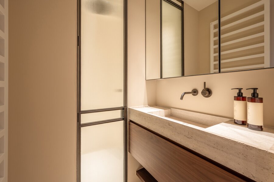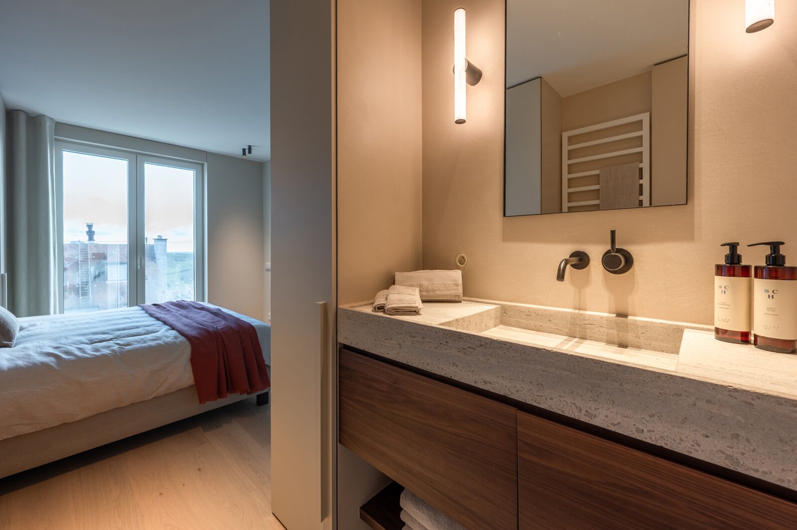 Drie volwaardige slaapkamers, elk met een luxueuze en suite bad- of douchekamer in natuursteen, voorzien van maatmeubilair.