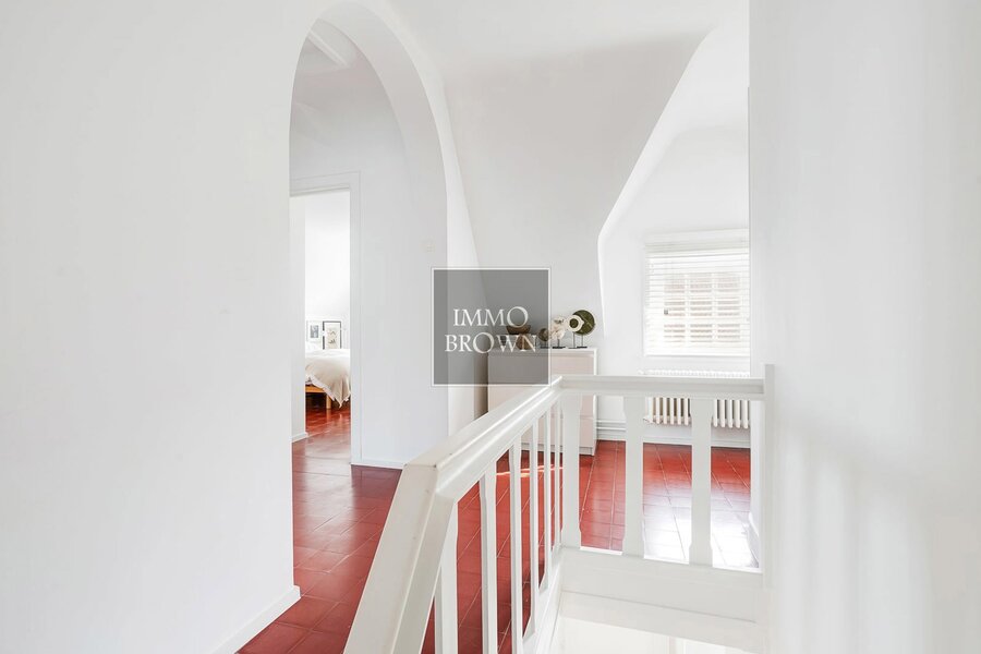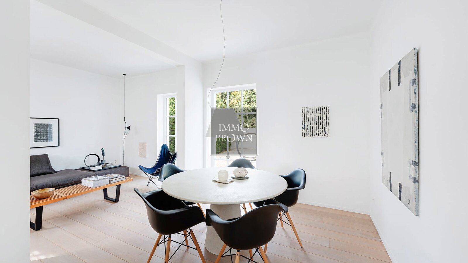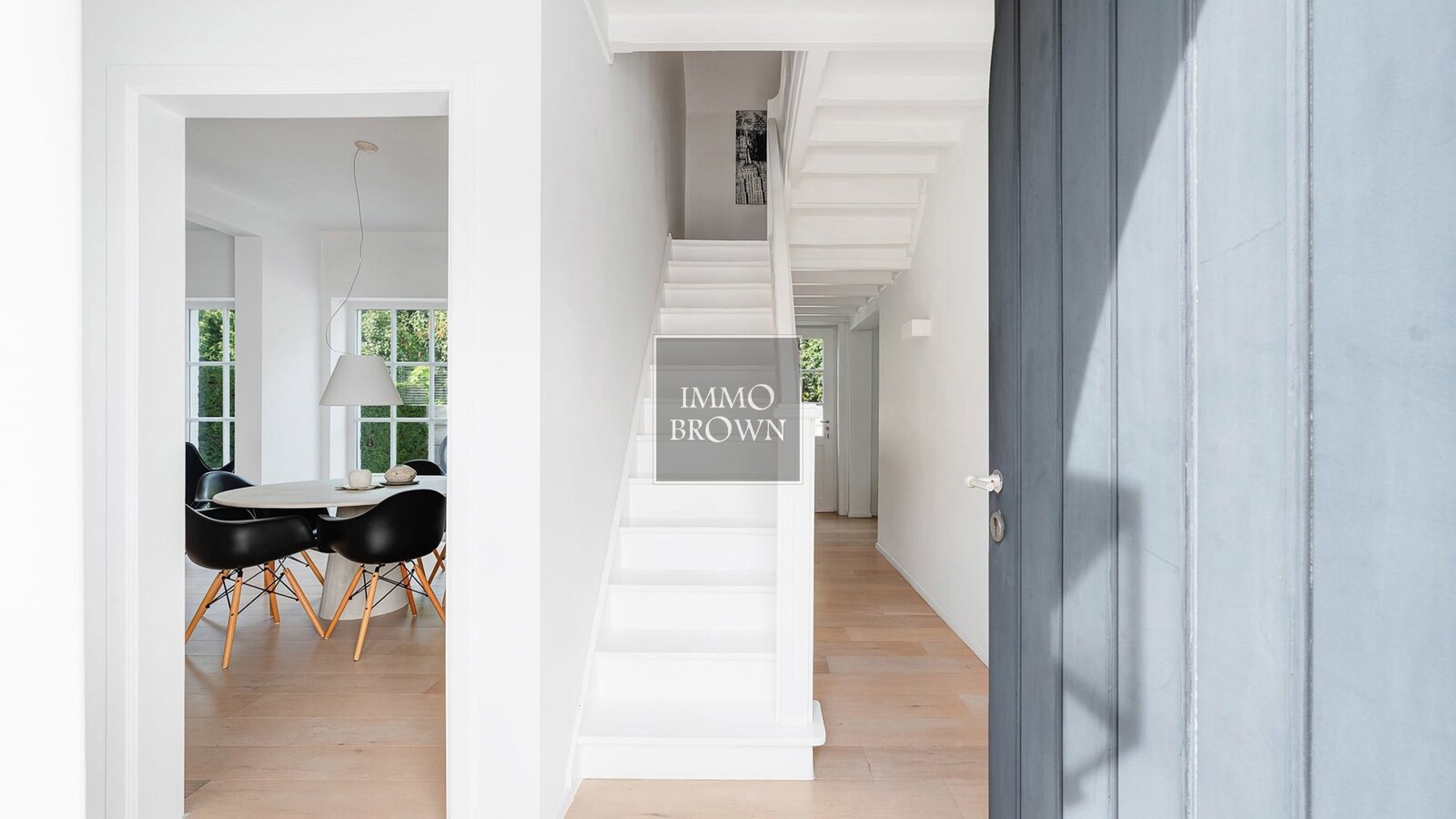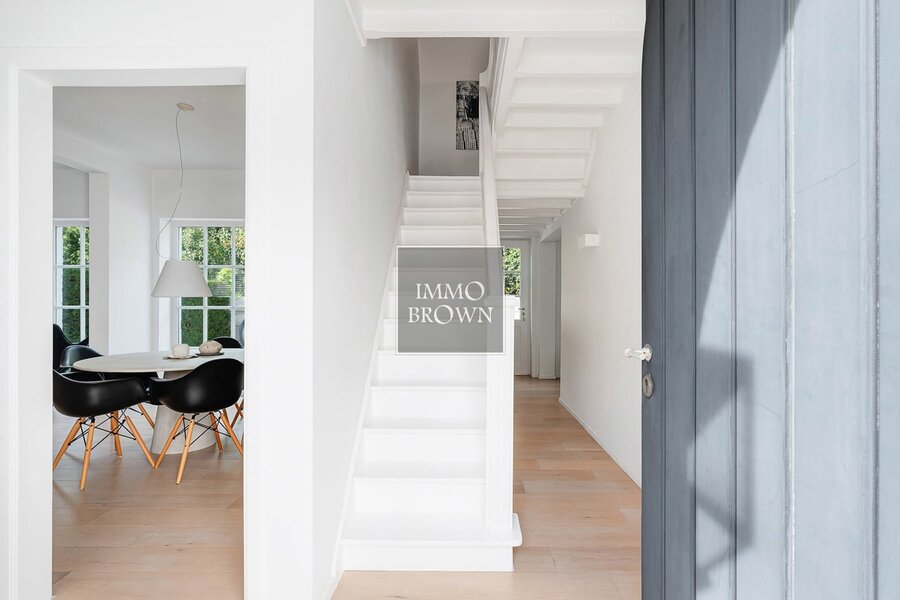 De inkomhal met stijlvolle trap verwelkomt u in een lichtrijke leefruimte met directe toegang tot het terras. Aansluitend bevinden zich een aparte eetkamer en een tweede, gezellige zithoek – ideaal voor familie of bezoekers.