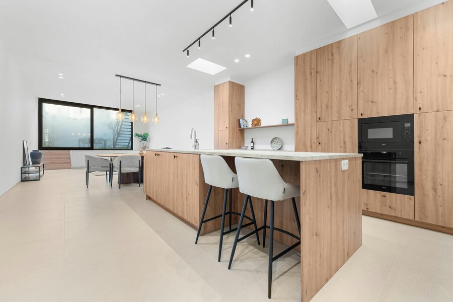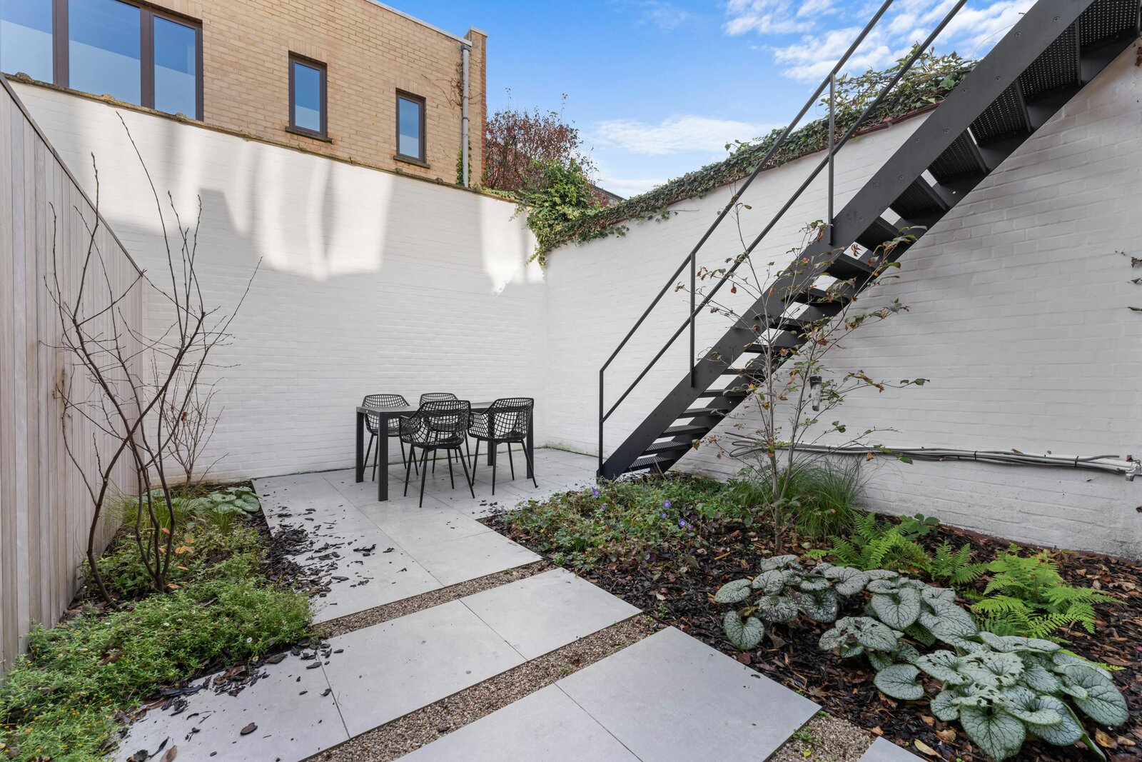 Gelijkvloers: Ruime inkomhal - berging - apart toilet - lichtrijke woonkamer met open keuken, voorzien van alle toestellen en eiland - aangrenzende berging - stadstuin met terras en trap naar het zonneterras op de eerste verdieping.