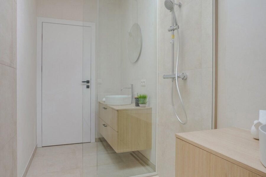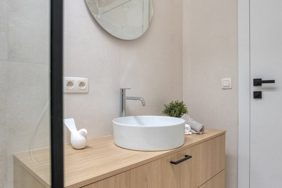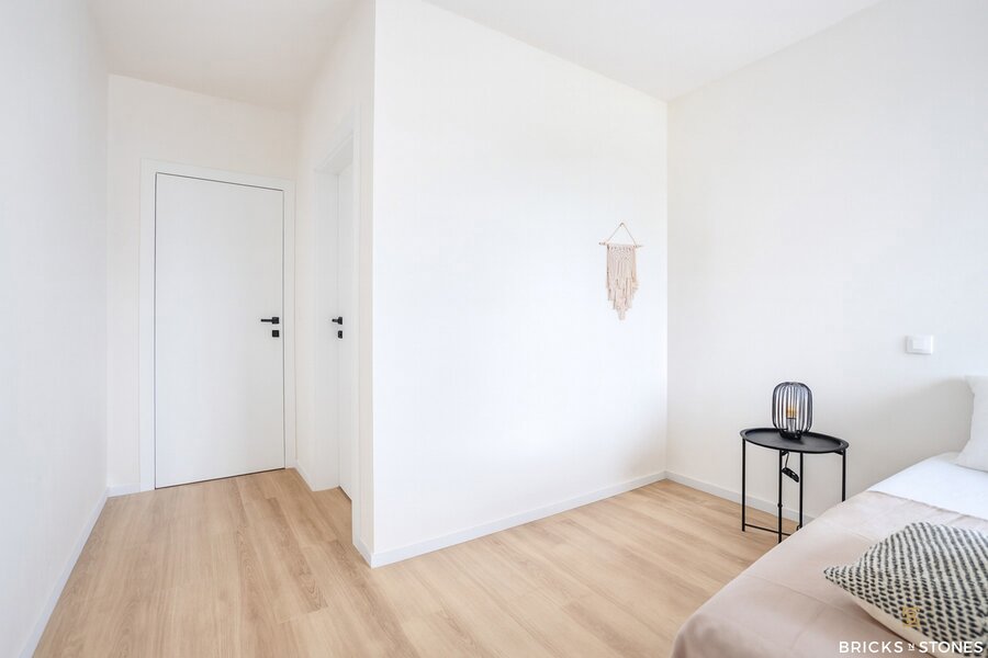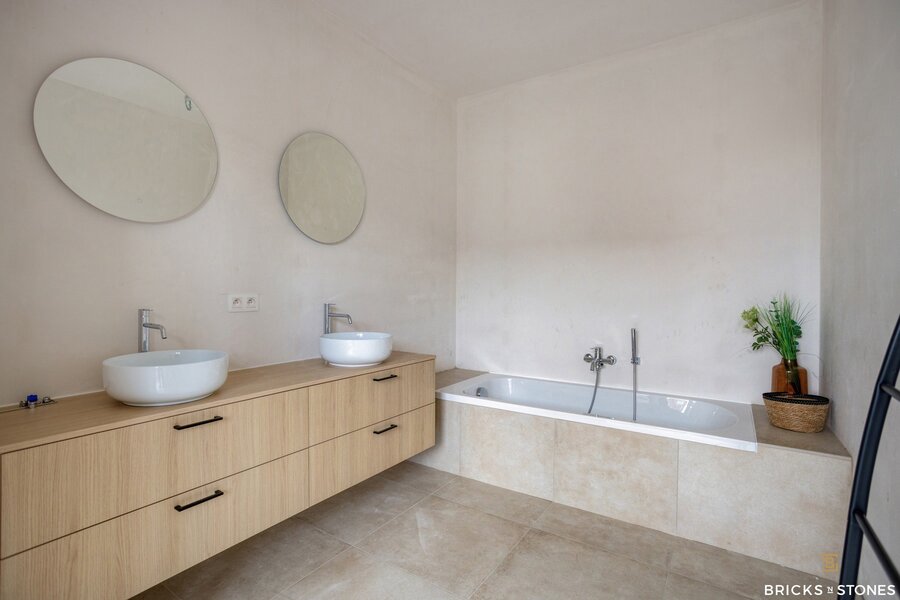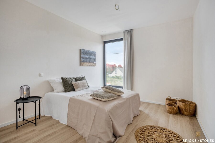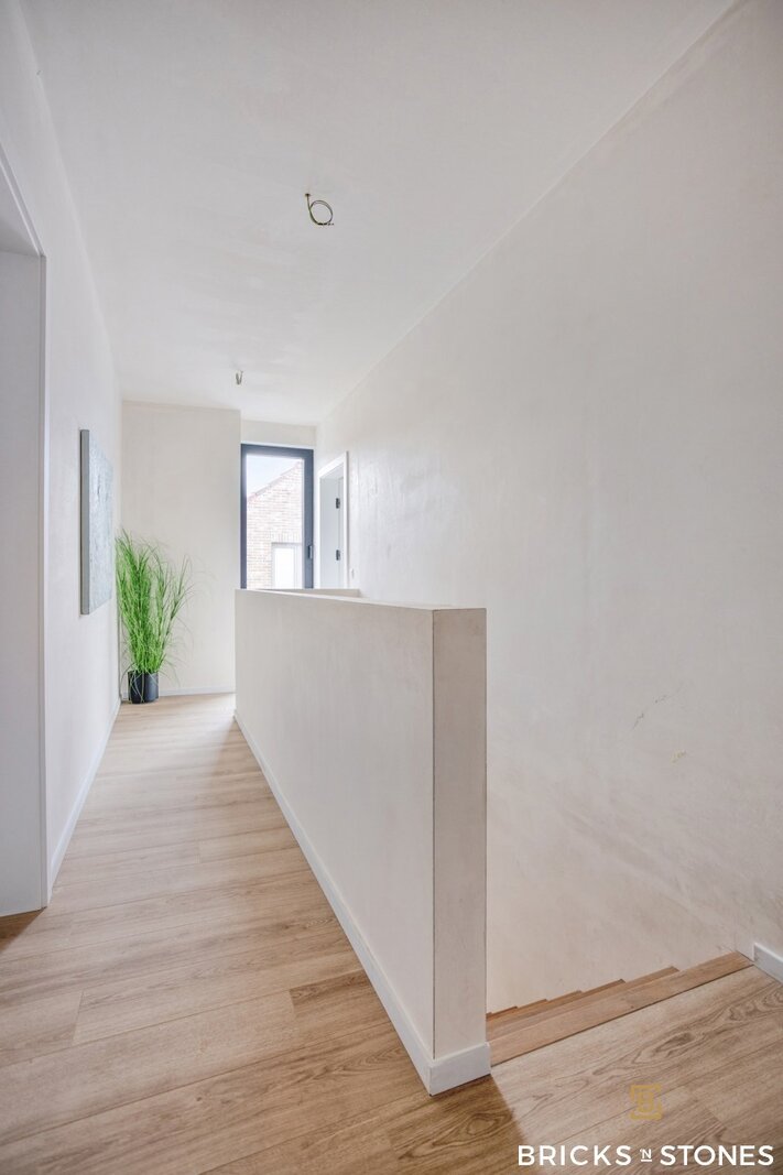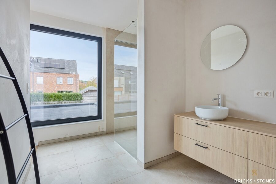 Op de eerste verdieping bevinden zich drie royale slaapkamers. De master bedroom (ca. 17 m²) beschikt over een eigen badkamer met dubbele wastafel, bad en douche. De twee bijkomende kamers, van elks 12m², zijn eveneens volwaardig en delen een tweede badkamer. Deze werd slim ingedeeld: elke kamer heeft er een eigen wastafel, terwijl de douche gedeeld wordt – ideaal voor kinderen of logees.