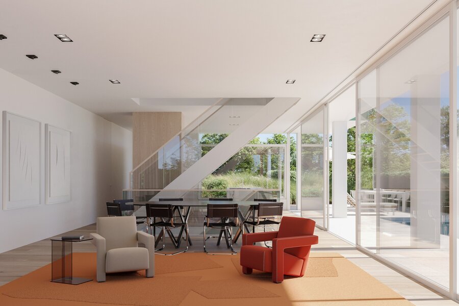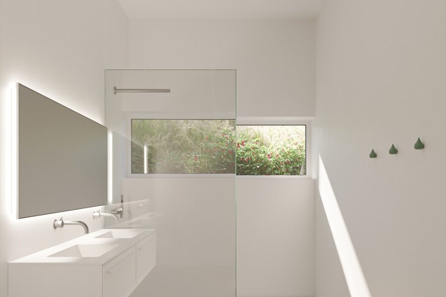 Bij het binnenkomen van Villa H wordt u verwelkomd in een lichte leefruimte met open keuken en eetplaats. Grote raampartijen brengen de zon binnen en verbinden de leefruimte met het zuidwestgerichte terras en de aangelegde tuin. De masterbedroom met eigen badkamer bevindt zich eveneens op het gelijkvloers – een troef voor wie gelijkvloers wonen op prijs stelt.