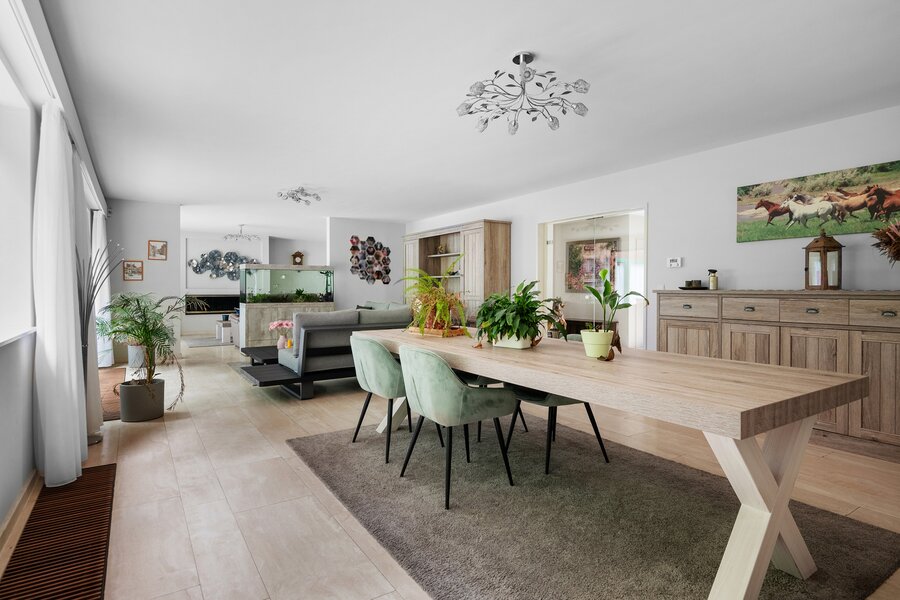 De royale leefruimte van maar liefst 73 m² is ingedeeld in een gezellige tv-hoek, een zithoek en een eetgedeelte. De keuken werd vernieuwd in 2022 en is uitgerust met hoogwaardige toestellen, waaronder een stoomoven, combioven, Amerikaanse koelkast, inductiekookplaat, spoelbak met Quooker-kraan en ingebouwde vaatwasser. Aansluitend bevindt zich de eveneens in 2022 vernieuwde bijkeuken, voorzien van een extra vaatwasser en aansluitingen voor wasmachine en droogkast. Verder is er nog een aparte berging.