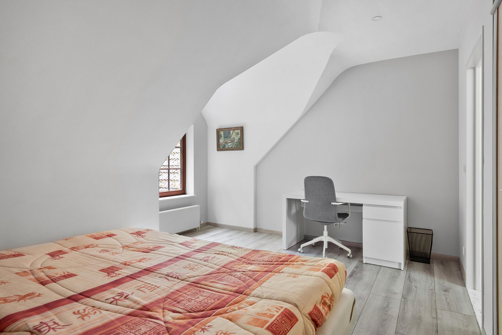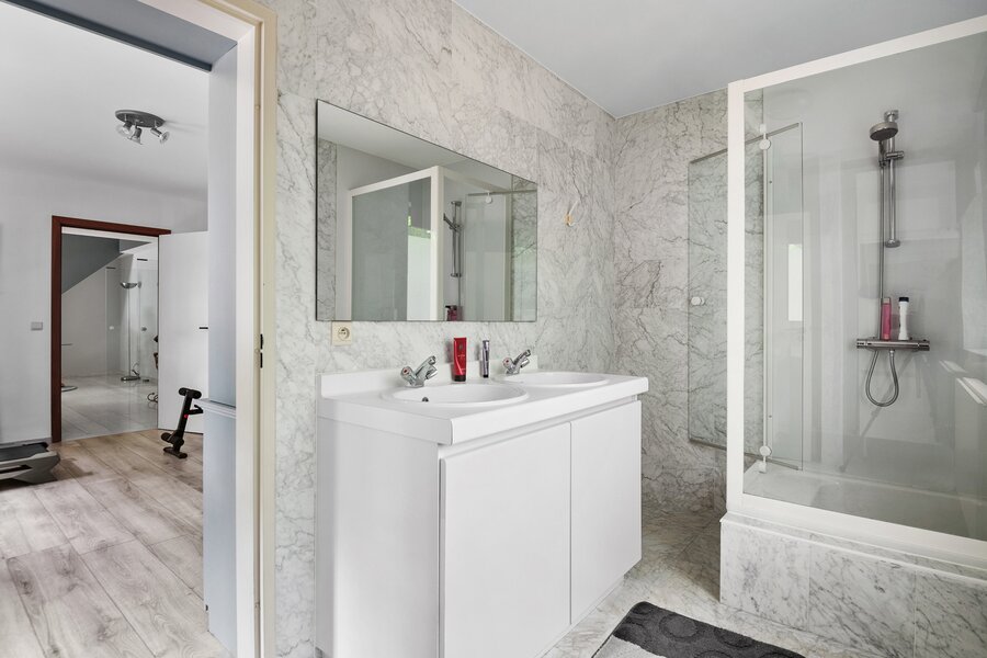 Via de nachthal op de eerste verdieping bereiken we de hoofdslaapkamer met eigen dressing en een ensuite badkamer met bad, douche, dubbele lavabo en toilet. Daarnaast zijn er nog twee ruime slaapkamers, elk met een eigen badkamer ensuite, en een aparte bureauruimte.