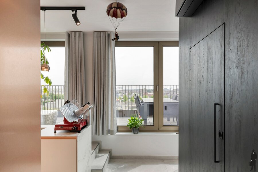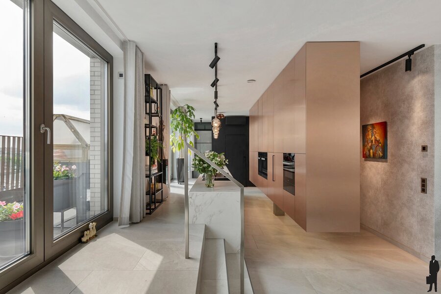 Deze uitzonderlijke penthouse bevindt zich op een toplocatie in Antwerpen, waar comfort, technologie en design naadloos samenkomen. Gelegen op de Binnenvaartstraat 33, biedt deze woonparel een verfijnde leefomgeving met hoogwaardige materialen, slimme technologieën en twee riante terrassen met een ideale oriëntatie op het oosten, zuiden en westen. Bij het betreden van de penthouse valt meteen de open leefkeuken op, uitgerust met absolute topapparatuur van MIELE – waaronder een heteluchtoven, stoomoven, combi-stoomoven, warmhoudlades, wijnkoeler en een inductiekookplaat met downdraft afzuiging. Deze keuken is zonder twijfel een grote troef voor culinaire liefhebbers.