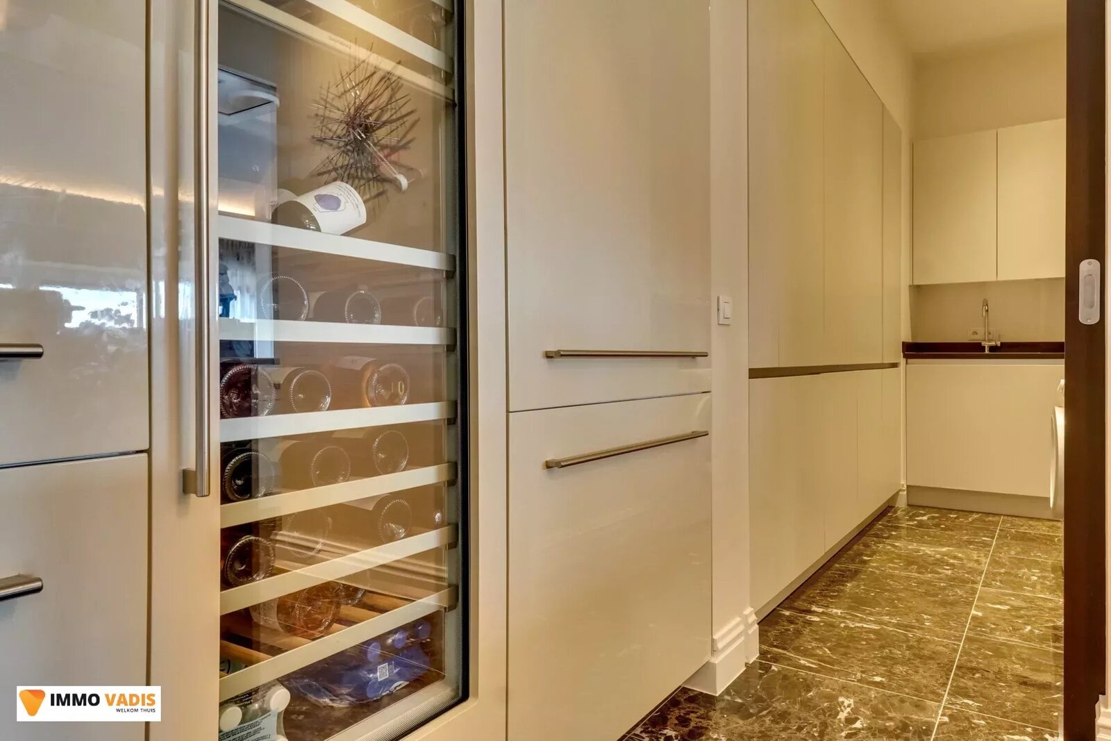 - Luxueuze, hyperuitgeruste keuken ( 35 m²) met marmeren vloer, voorzien van natuurstenen werkbladen, 3 spoelbakken, inductiekookplaat, Atag inbouwtoestellen en ingebouwde wijnkoelkast en 2 ovens met warmhoudlades.