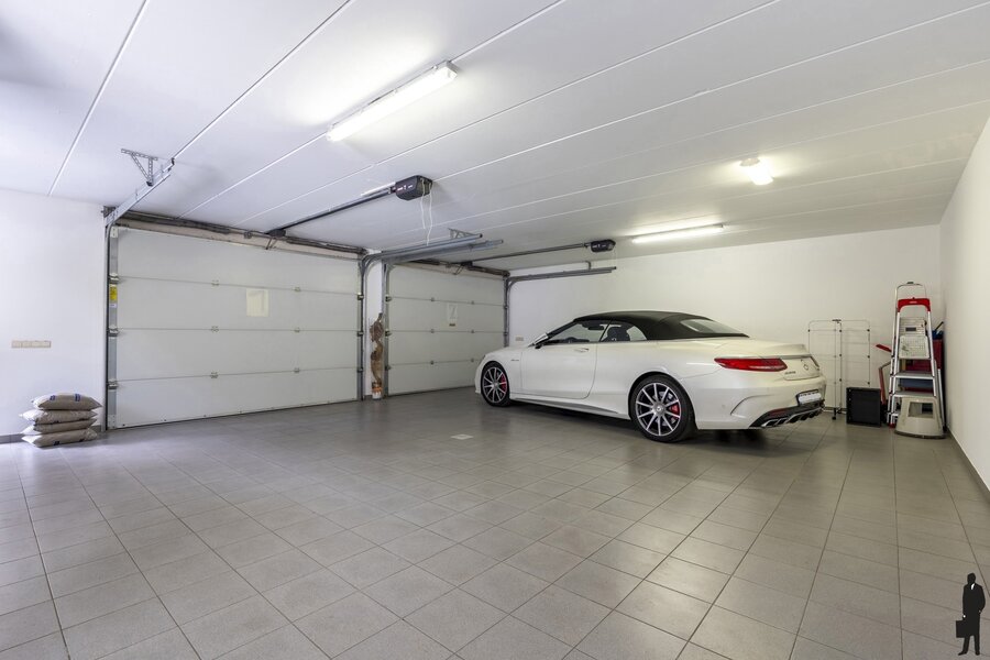 De woning heeft een oprit met automatische poort aan de zijkant en tevens een riant garagebouw (min. 2 standplaatsen) met daarnaast een bovenverdieping (multifunctionele werkruimte, thuiskantoor of 'mancave'). De voor-, zij- en achtertuin zijn stijlvol aangelegd en omgeven door metershoge hagen die privacy garanderen. De tuin is volledig afgesloten en omheind.