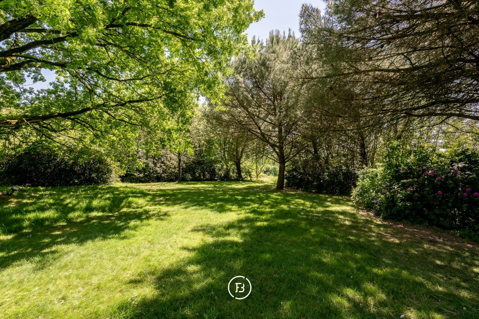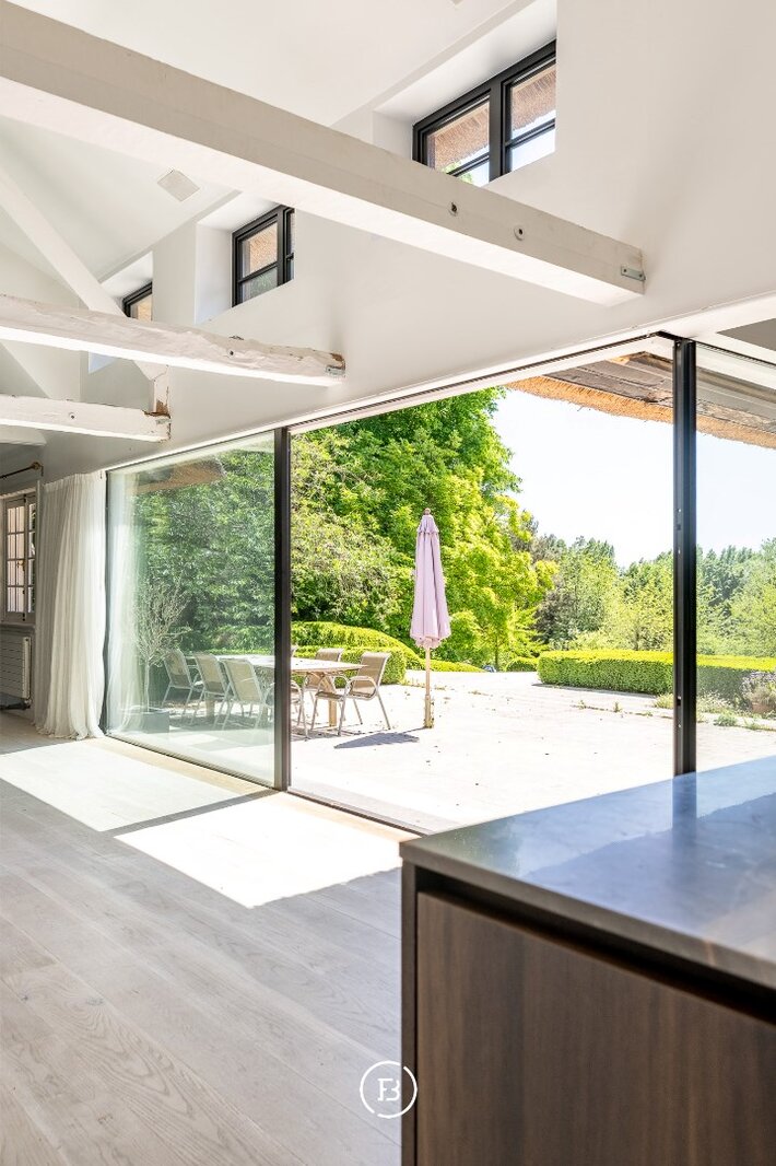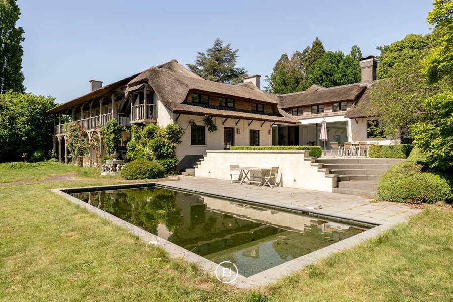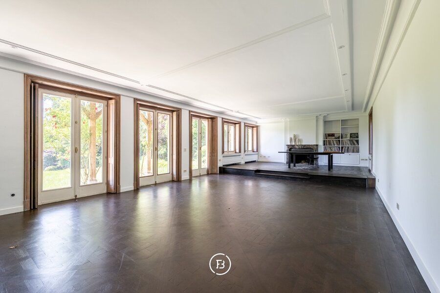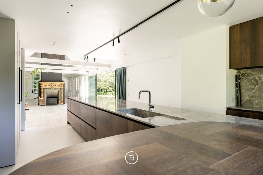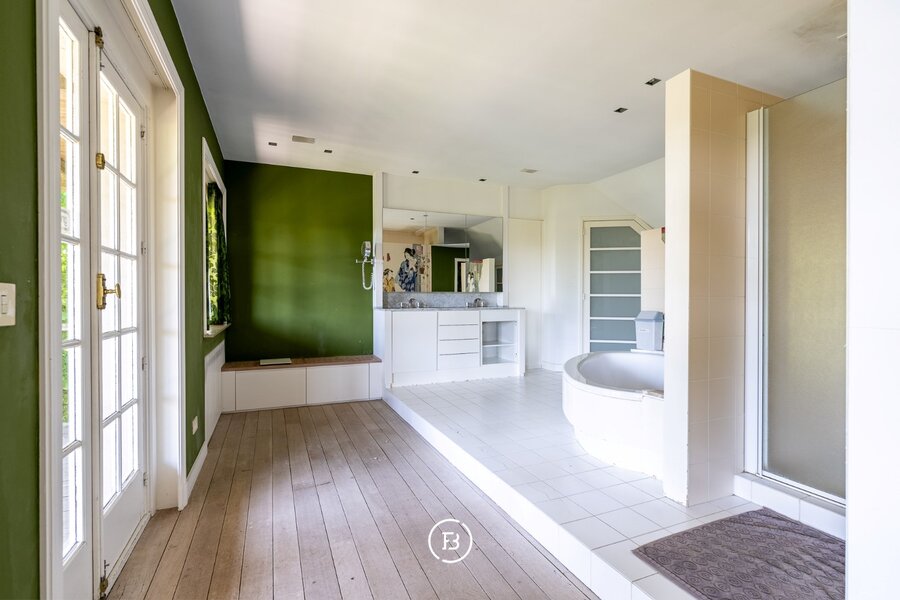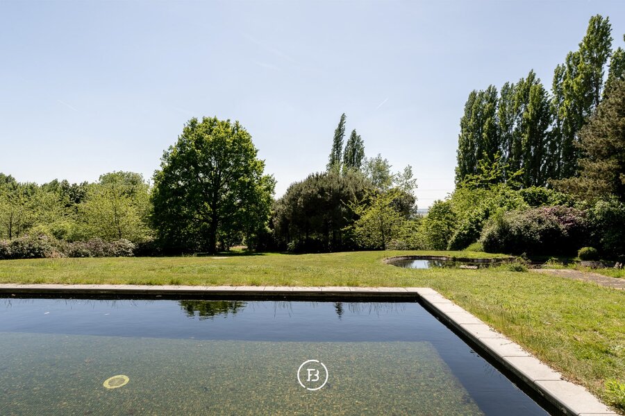 De imposante inkomhal, afgewerkt met marmeren vloeren en een massief eiken trap, vormt het hart van de woning. Rechts leidt een open doorgang naar de eerste leefruimte met zicht op tuin en terras, met daaraan verbonden een vestiaire en gastentoilet. Verder op het gelijkvloers bevinden zich een kinderkamer of bureauruimte, een badkamer en een extra slaapkamer. Aan de linkerzijde van de inkom ligt de nieuwe keuken, naadloos verbonden met de eetplaats en een tweede, lichtrijke leefruimte met een charmante rondboogerker en uitzicht op de tuin. Een centrale houthaard scheidt eetplaats en salon op sfeervolle wijze. Zowel de keuken als eetruimte geven uit op het ruime terras en het zwembad, met prachtig zicht op de tuin.
