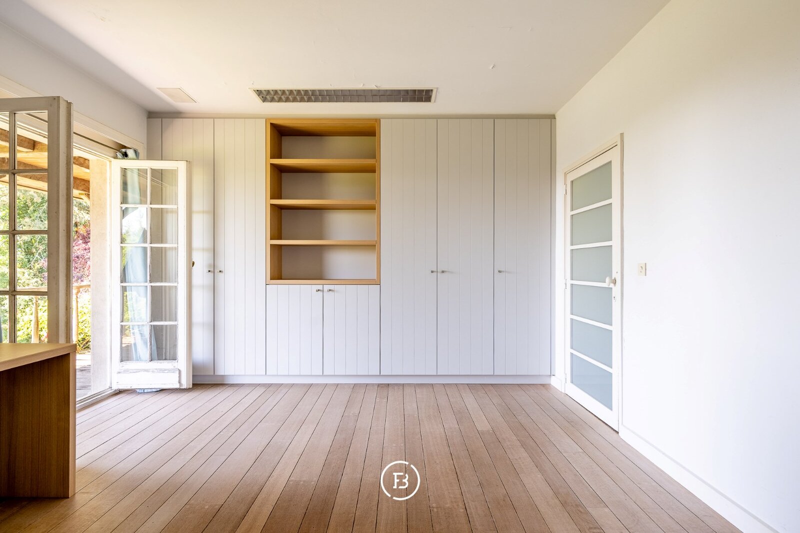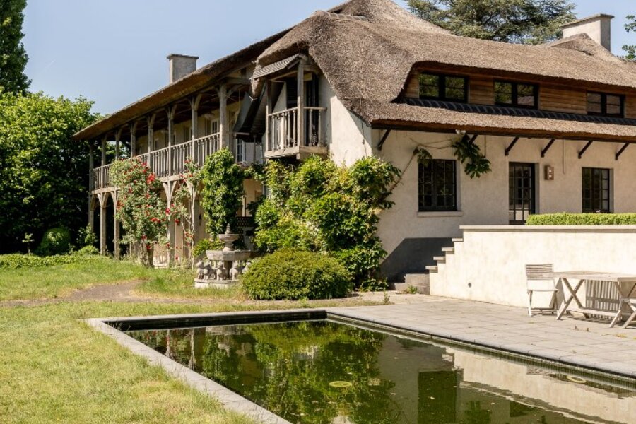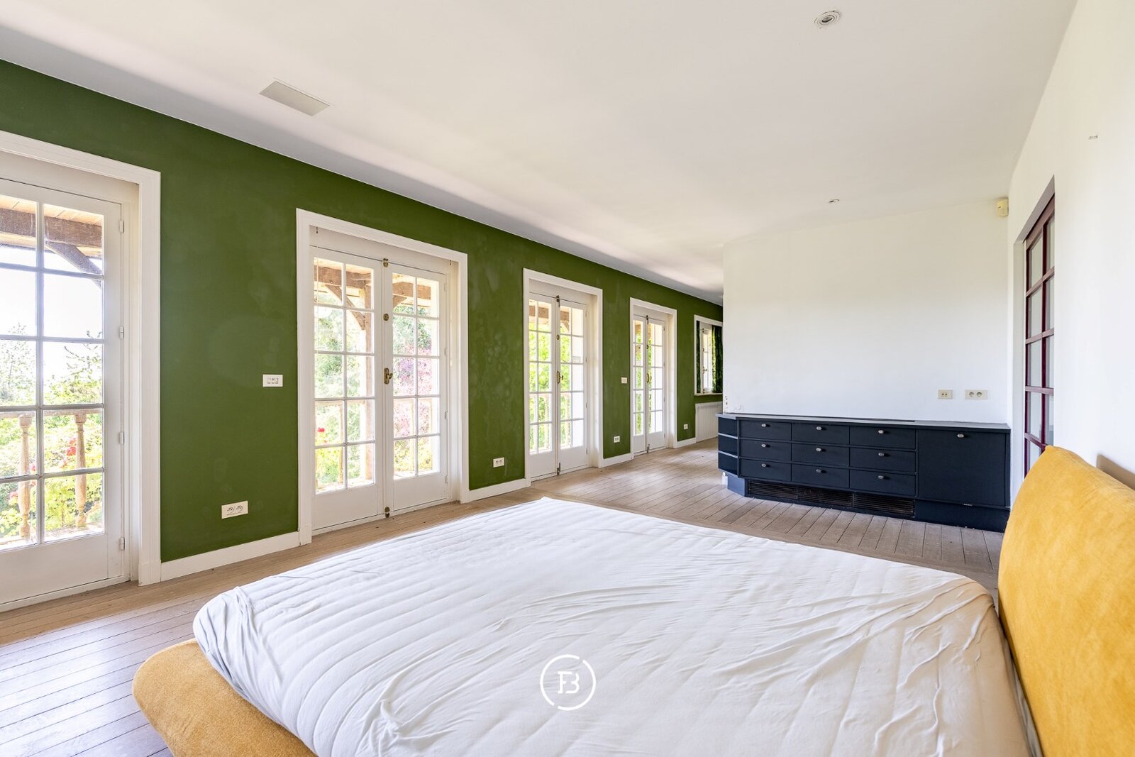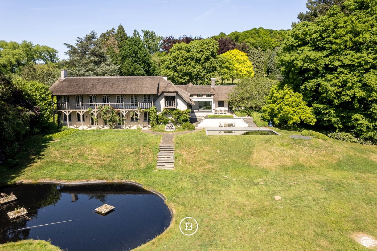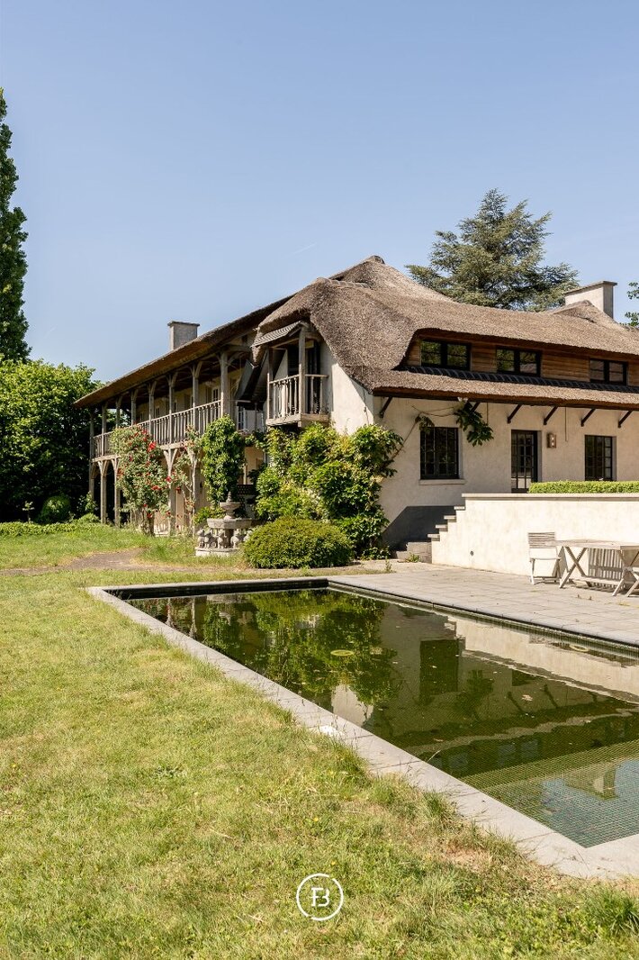De imposante inkomhal, afgewerkt met marmeren vloeren en een massief eiken trap, vormt het hart van de woning. Rechts leidt een open doorgang naar de eerste leefruimte met zicht op tuin en terras, met daaraan verbonden een vestiaire en gastentoilet. Verder op het gelijkvloers bevinden zich een kinderkamer of bureauruimte, een badkamer en een extra slaapkamer. Aan de linkerzijde van de inkom ligt de nieuwe keuken, naadloos verbonden met de eetplaats en een tweede, lichtrijke leefruimte met een charmante rondboogerker en uitzicht op de tuin. Een centrale houthaard scheidt eetplaats en salon op sfeervolle wijze. Zowel de keuken als eetruimte geven uit op het ruime terras en het zwembad, met prachtig zicht op de tuin.