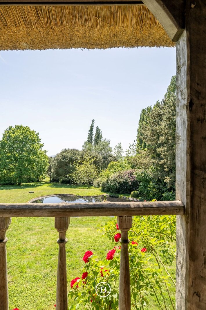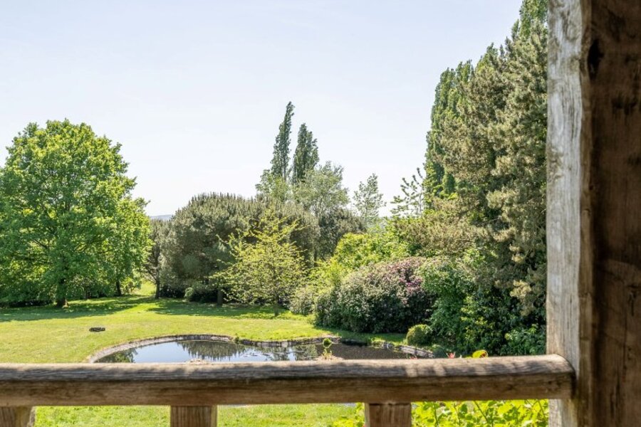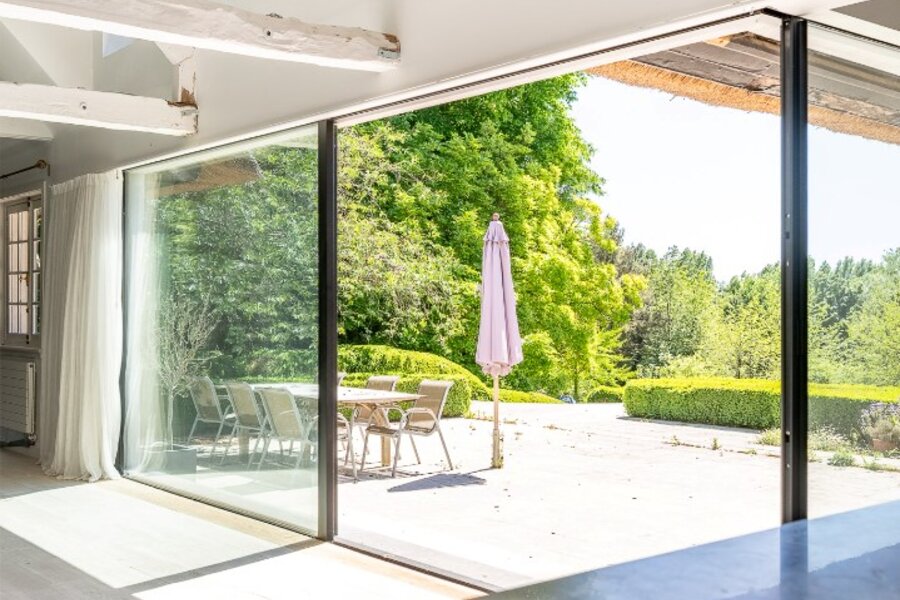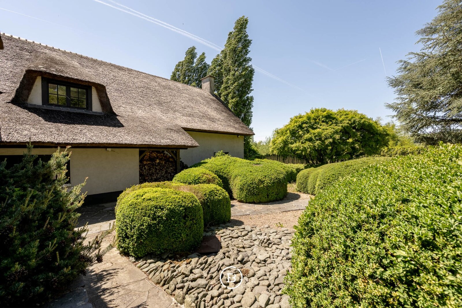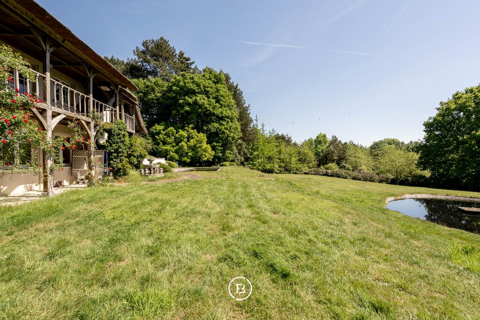 De imposante inkomhal, afgewerkt met marmeren vloeren en een massief eiken trap, vormt het hart van de woning. Rechts leidt een open doorgang naar de eerste leefruimte met zicht op tuin en terras, met daaraan verbonden een vestiaire en gastentoilet. Verder op het gelijkvloers bevinden zich een kinderkamer of bureauruimte, een badkamer en een extra slaapkamer. Aan de linkerzijde van de inkom ligt de nieuwe keuken, naadloos verbonden met de eetplaats en een tweede, lichtrijke leefruimte met een charmante rondboogerker en uitzicht op de tuin. Een centrale houthaard scheidt eetplaats en salon op sfeervolle wijze. Zowel de keuken als eetruimte geven uit op het ruime terras en het zwembad, met prachtig zicht op de tuin.