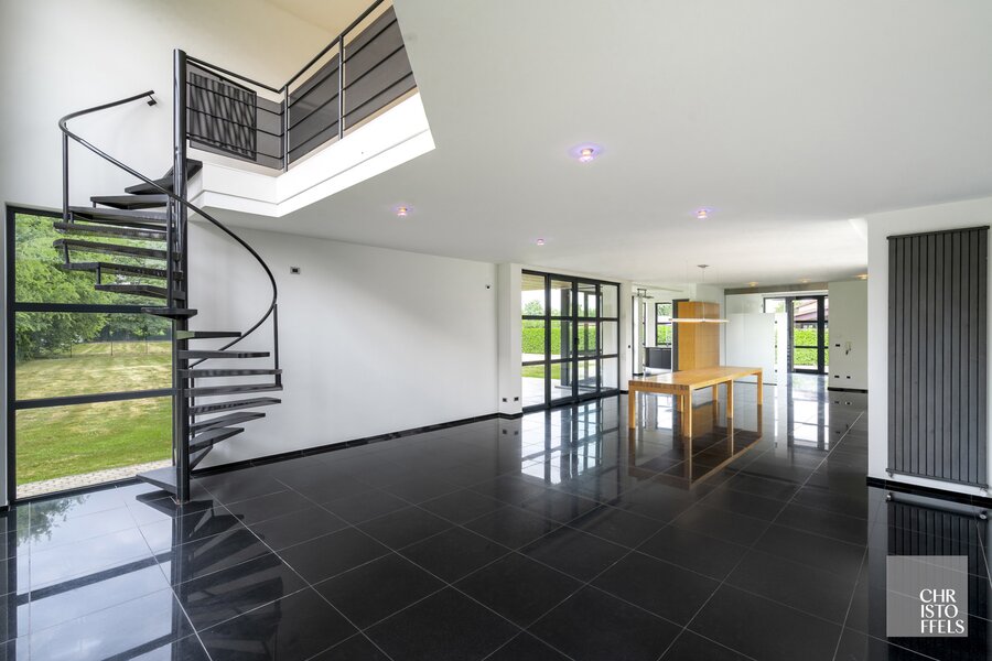 De woning verwelkomt u met een grote inkomhal met vestiaire en een gastentoilet. De lichtrijke woonkamer biedt zowel een gezellige zithoek als een eetruimte die uitgeven op het terras en direct aansluiten op de open keuken en het thuisbureau. Vanuit de keuken bereikt u een praktische berging en een aparte wasplaats. Bovendien beschikt de woning over een dubbele inpandige garage met extra bergruimte.