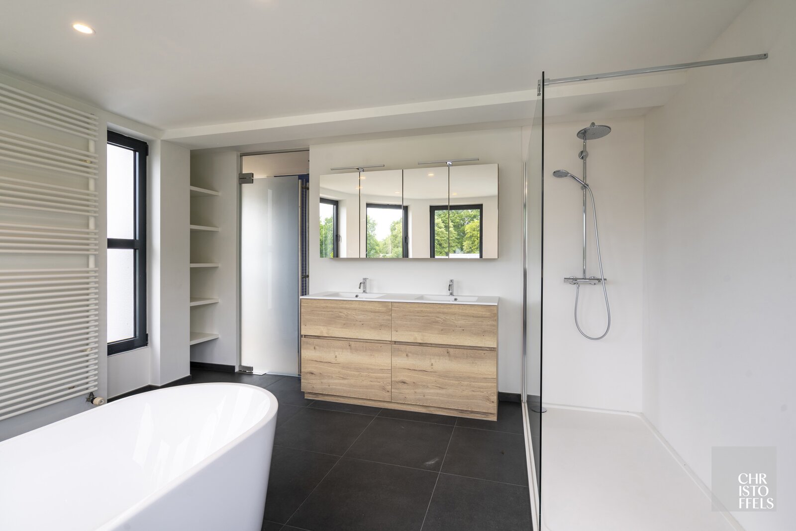 Beide badkamers beschikken over een dubbel wastafelmeubel, een douche en een ligbad.