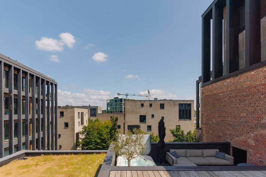 De loft is verdeeld over twee verdiepingen en biedt een praktische indeling met een open leefruimte met indrukwekkende plafondhoogte en een heerlijk terras. De op maat gemaakte keuken is hypergeïnstalleerd met o.a. Gaggenau toestellen en een tepanyaki plaat en een quooker kraan.