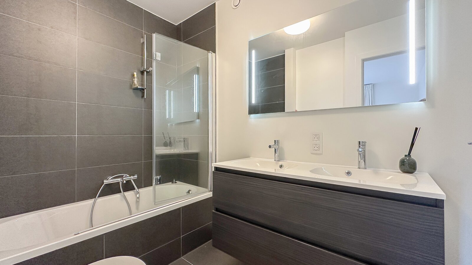 Achteraan bevinden er zich 3 slaapkamers. De master bedroom beschikt over een ensuite badkamer, bestaande uit een ligbad, dubbele lavabo en toilet. De 2e en 3e slaapkamer zijn eveneens volwaardige kamers en beschikken over ingemaakte kasten. Aparte douchekamer.