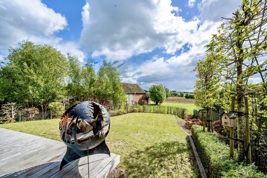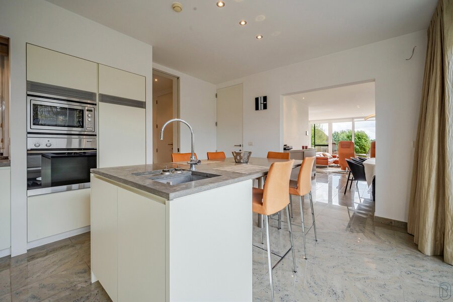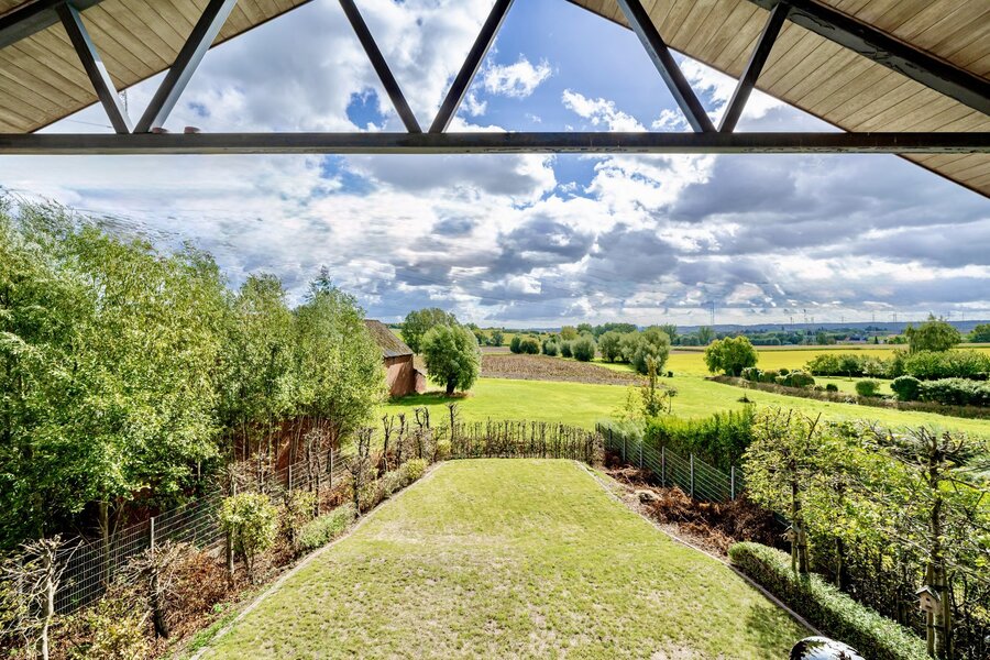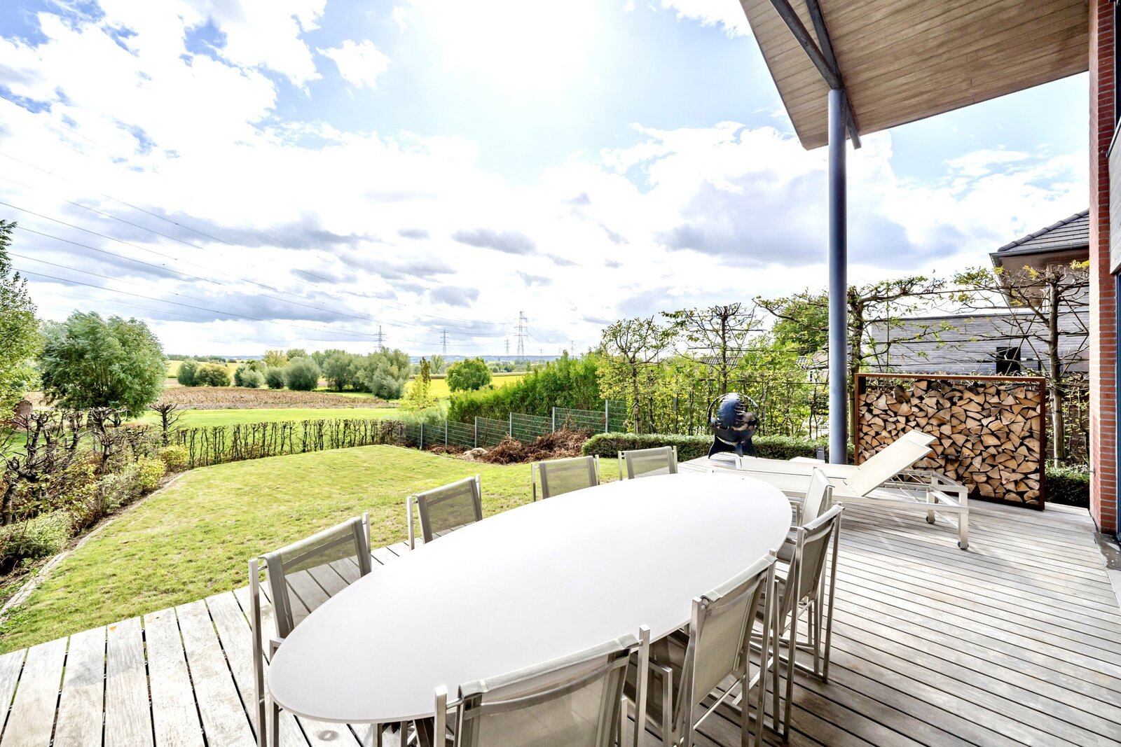 inkom en traphal, apart toilet, geïnstalleerde keuken met eiland (uitgevend op een gezellig terras), bijkeuken, leuke lichtrijke leefruimte (inbouwcassette), uitgevend op een 2de terras en tuin met prachtige zichten op groen. Op het verdiep bevinden zicht de overloop (kan tevens in een slaapkamer omgevormd worden), masterbedroom met ensuite badkamer, slaapkamer met dressing (kan ingericht worden in een douchekamer).
