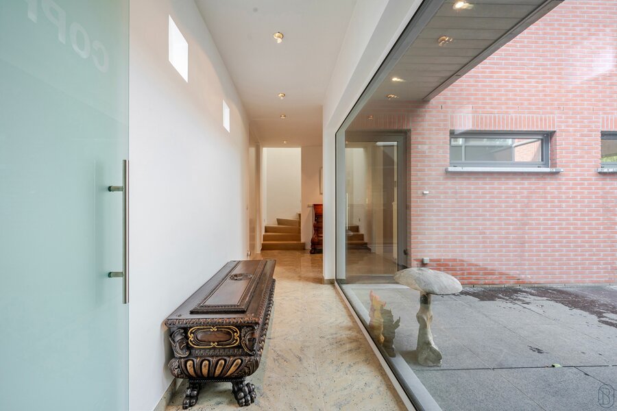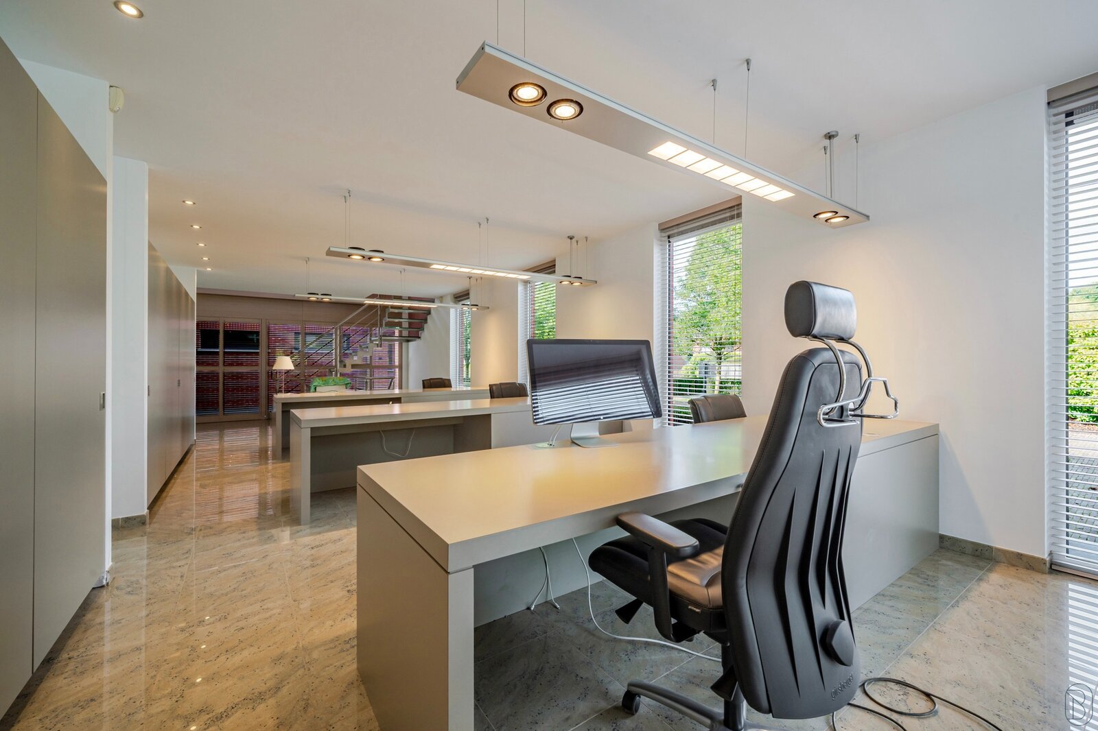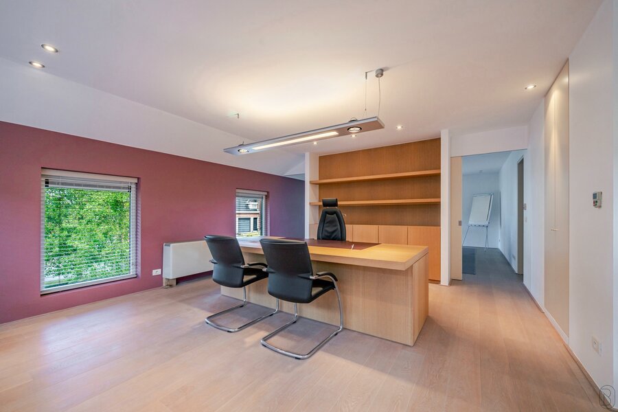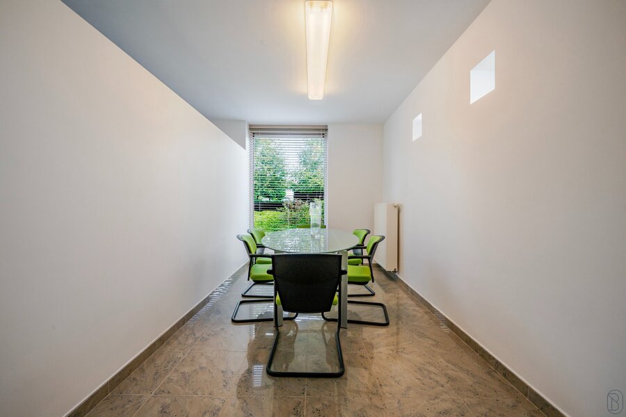 aparte inkom met wachtkamer, vestiaire en sanitaire voorzieningen (2 toiletten), leuke bureauruimte/praktijk, keuken met extra eetplaats, en op het verdiep: extra bureauruimtes, vergaderruimte, extra toilet en archief.
