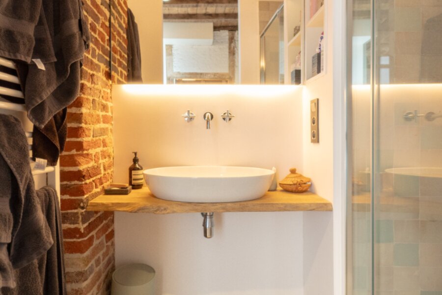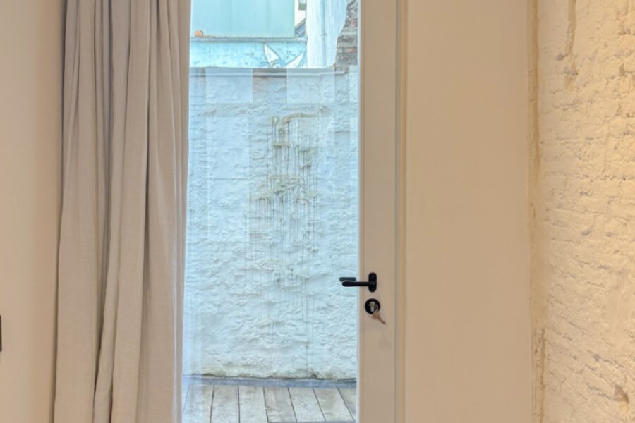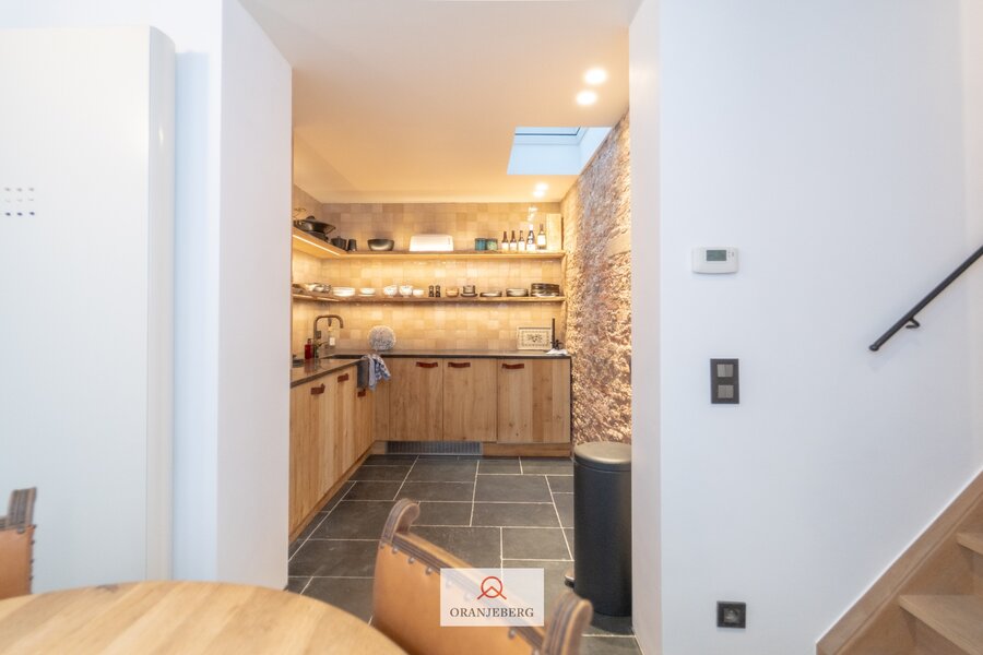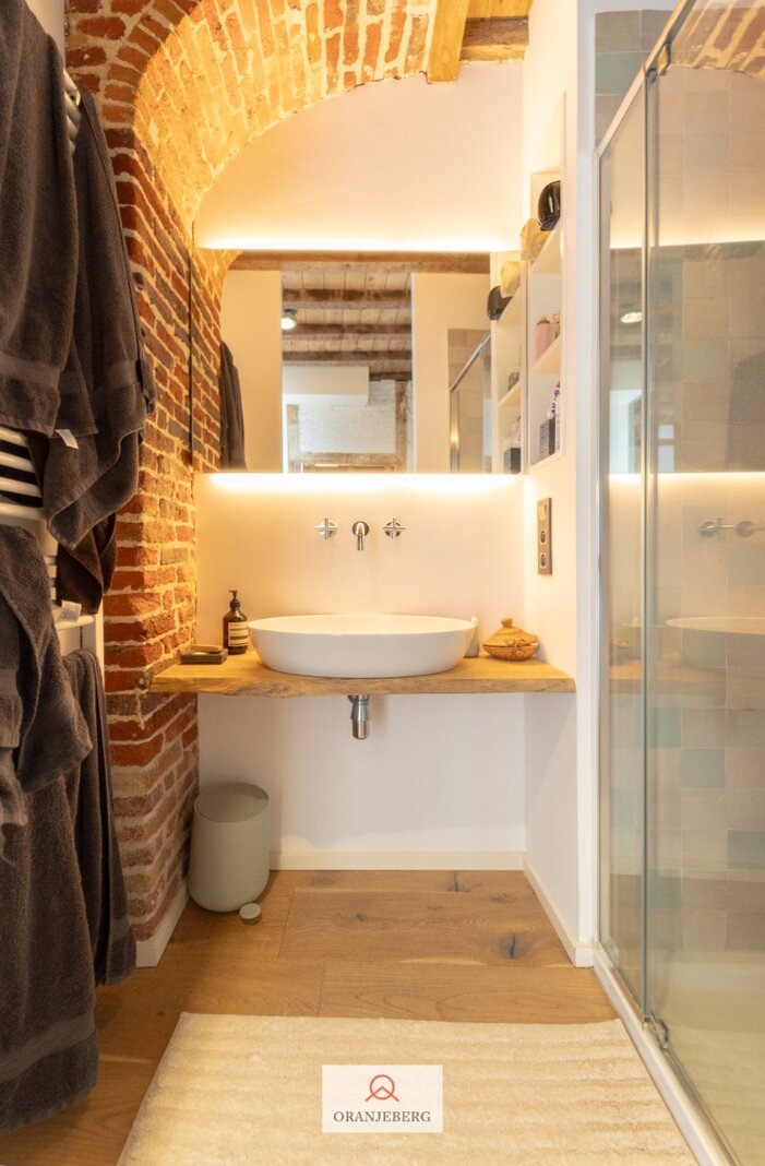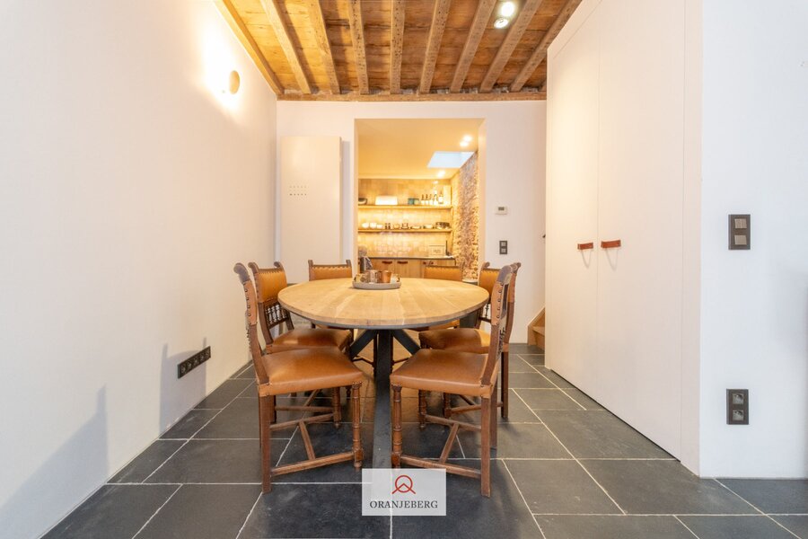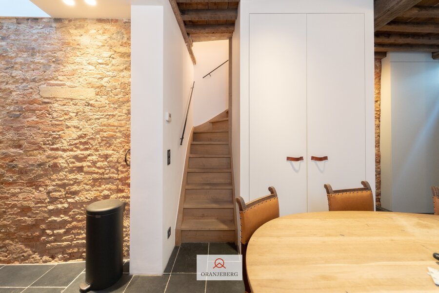De woning bestaat uit een inkomhal, gastentoilet, eetkamer voorzien van ingebouwde kasten, en een volledig geïnstalleerde, op maat gemaakte, charmante keuken. De gezellige zithoek bevindt zich in de sous-sol. Op de eerste verdieping is er een eerste slaapkamer (met kleine dressing) met aansluitend een eerste badkamer en toegang tot het terras. Op de bovenste verdieping bevindt zich de tweede slaapkamer met tweede badkamer en een tweede toilet. De woning straalt een aangename gezelligheid uit. De nog bestaande authentieke elementen, hoge plafonds, gewelven, authentieke trappen en deuren, houten balken, plankenvloeren, bakstenen muren…. zorgen voor een unieke charme en sfeer! Zeer mooie en kwalitatieve afwerking tot in de puntjes verzorgd en met oog voor detail. Gezelliger, knusser en mooier gelegen is moeilijk te vinden. Zeer laag KI (€427), EPC 216 kWh, asbestvrij, elektrische installatie conform. Ideale pied-à-terre in centrum Gent, luxueuze thuis voor de studerende kinderen, prachtige uitvalsbasis midden in de stad. Unieke aanrader!