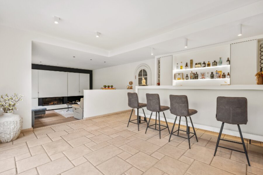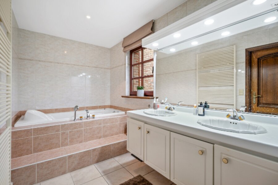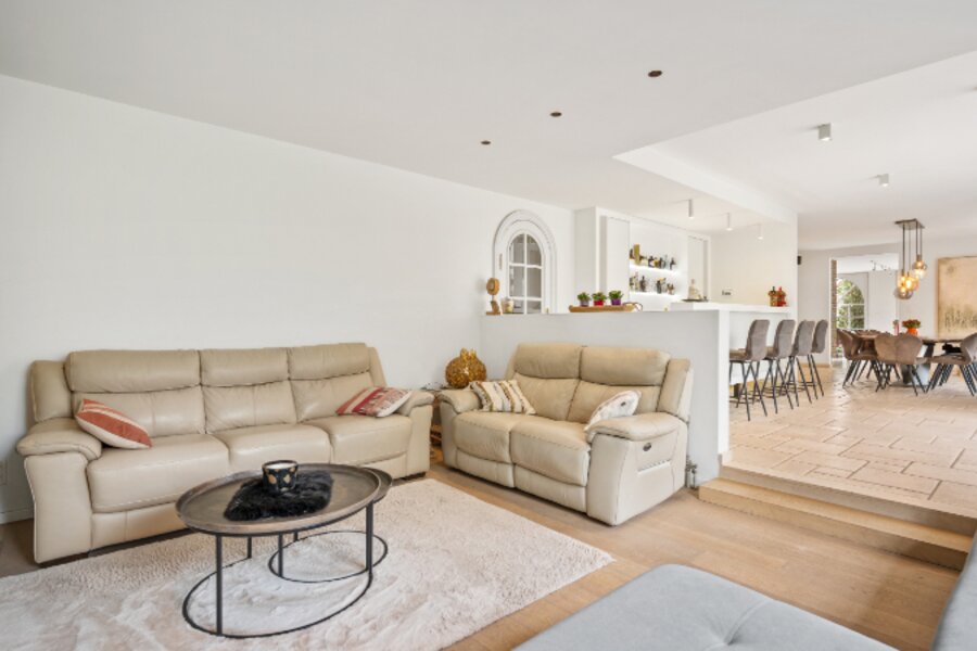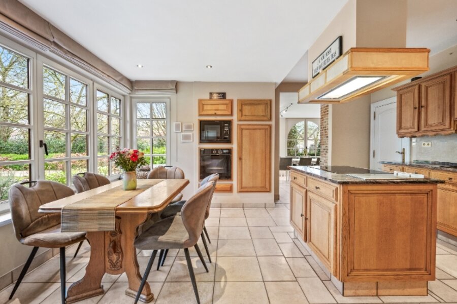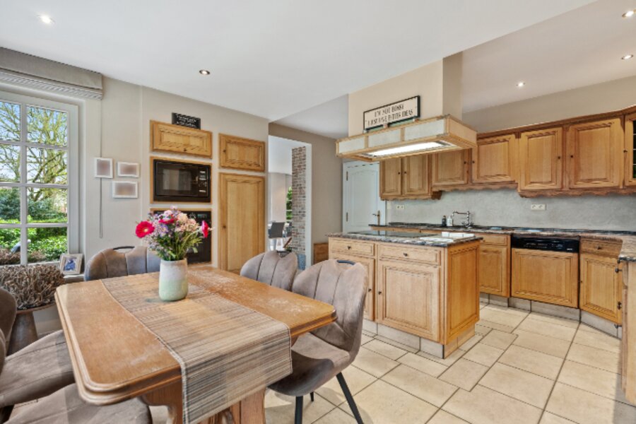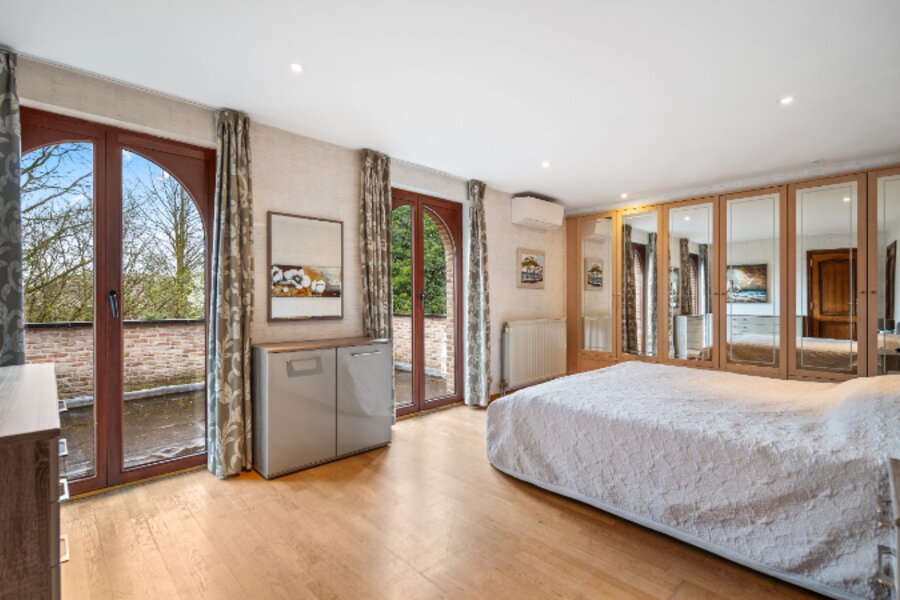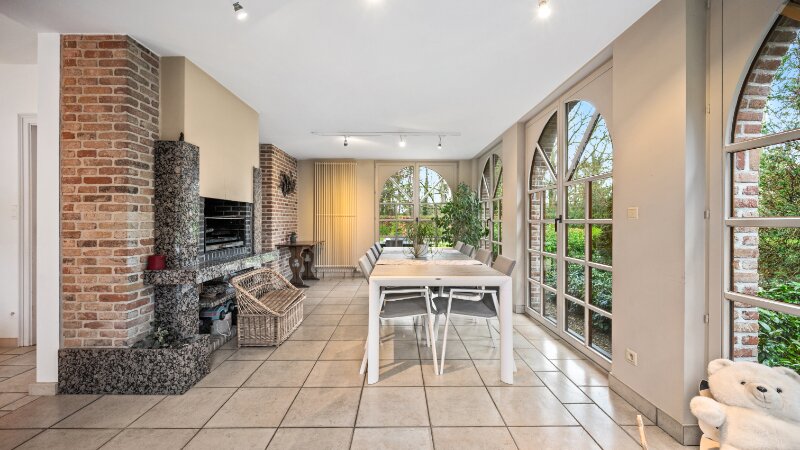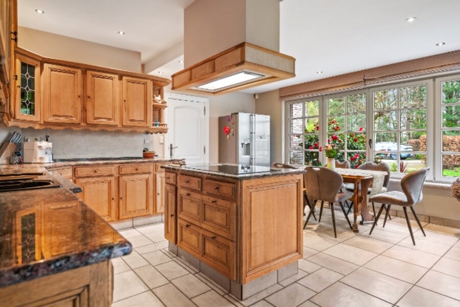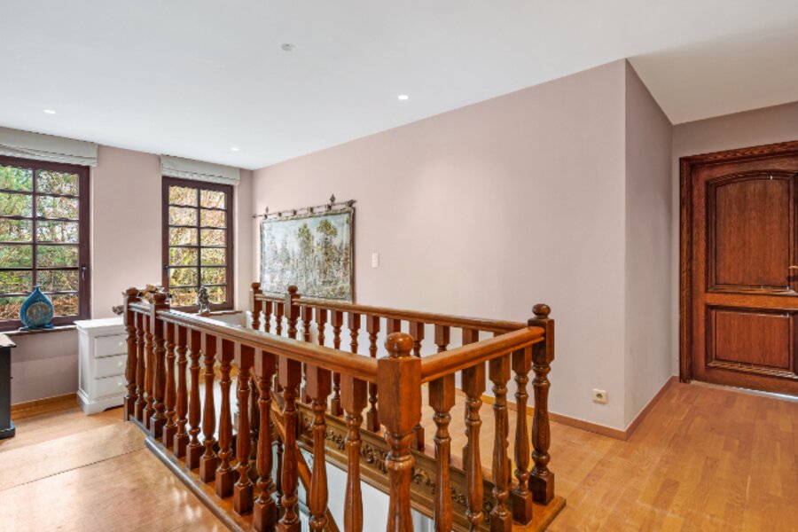 Omvat: kelder 44m², inkomhal met vestiaire, wc, bureel, living verdeeld in 4 aan elkaar palende ruimten met inbouwhaard, open haard en bar (totaal 93m²), volledig ingerichte keuken met eethoek, wasplaats-berging, nachthal met ingemaakte kast, 4 slaapkamers waarvan 1 slpk. met dressing en 1 slpk. met ingemaakte kast en aanpalende badkamer en toilet, douchekamer. Airco op 2 slaapkamers.