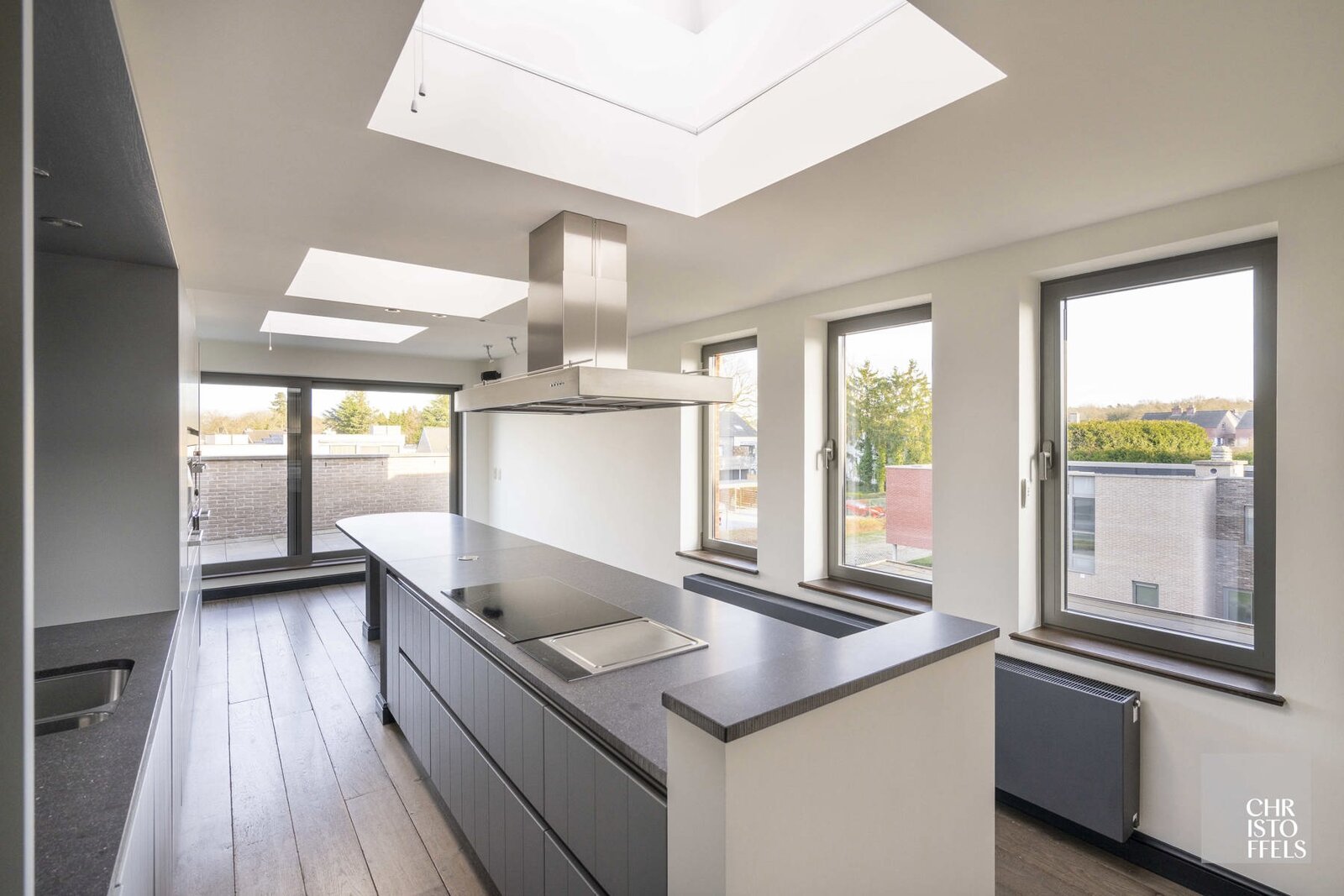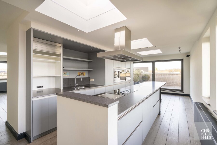 De keuken is hoogwaardig afgewerkt en uitgerust met Miele-toestellen, waaronder oven, combi-oven, stoomoven, teppanyaki en inductiekookplaat. Het kookeiland met natuurstenen werkblad en de geïntegreerde bar met koelkast en spoelbak benadrukken het luxueuze karakter.