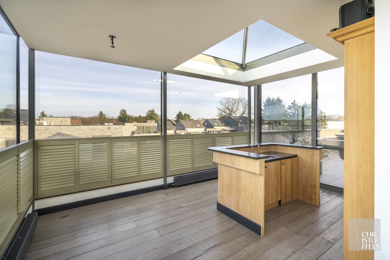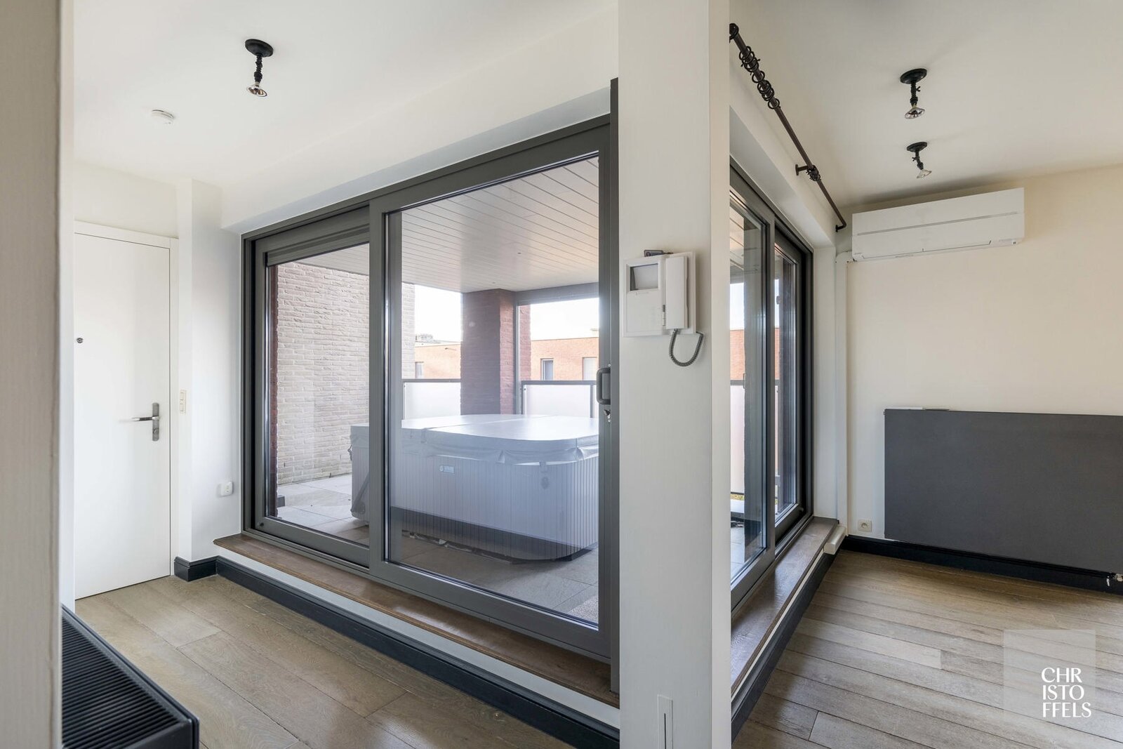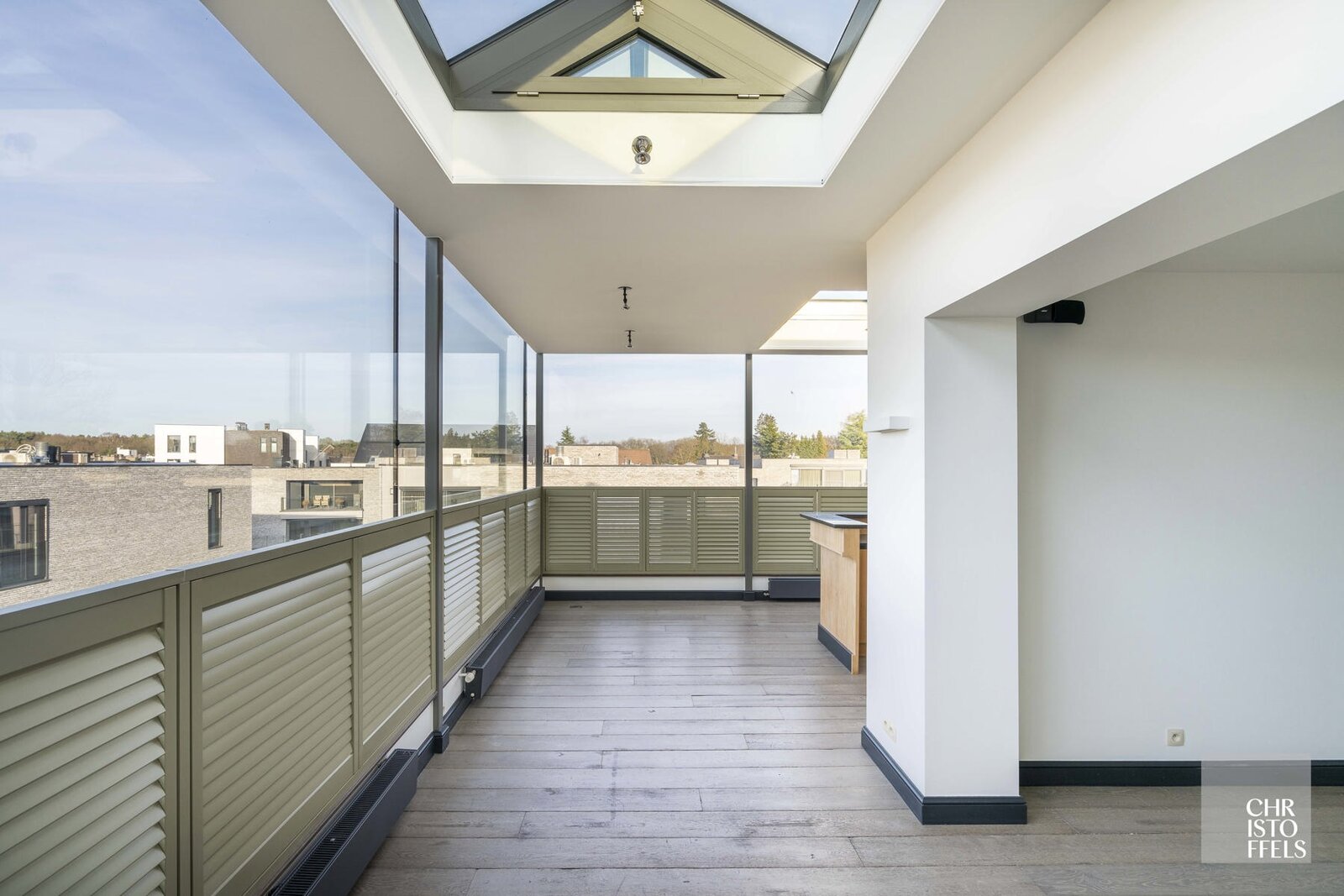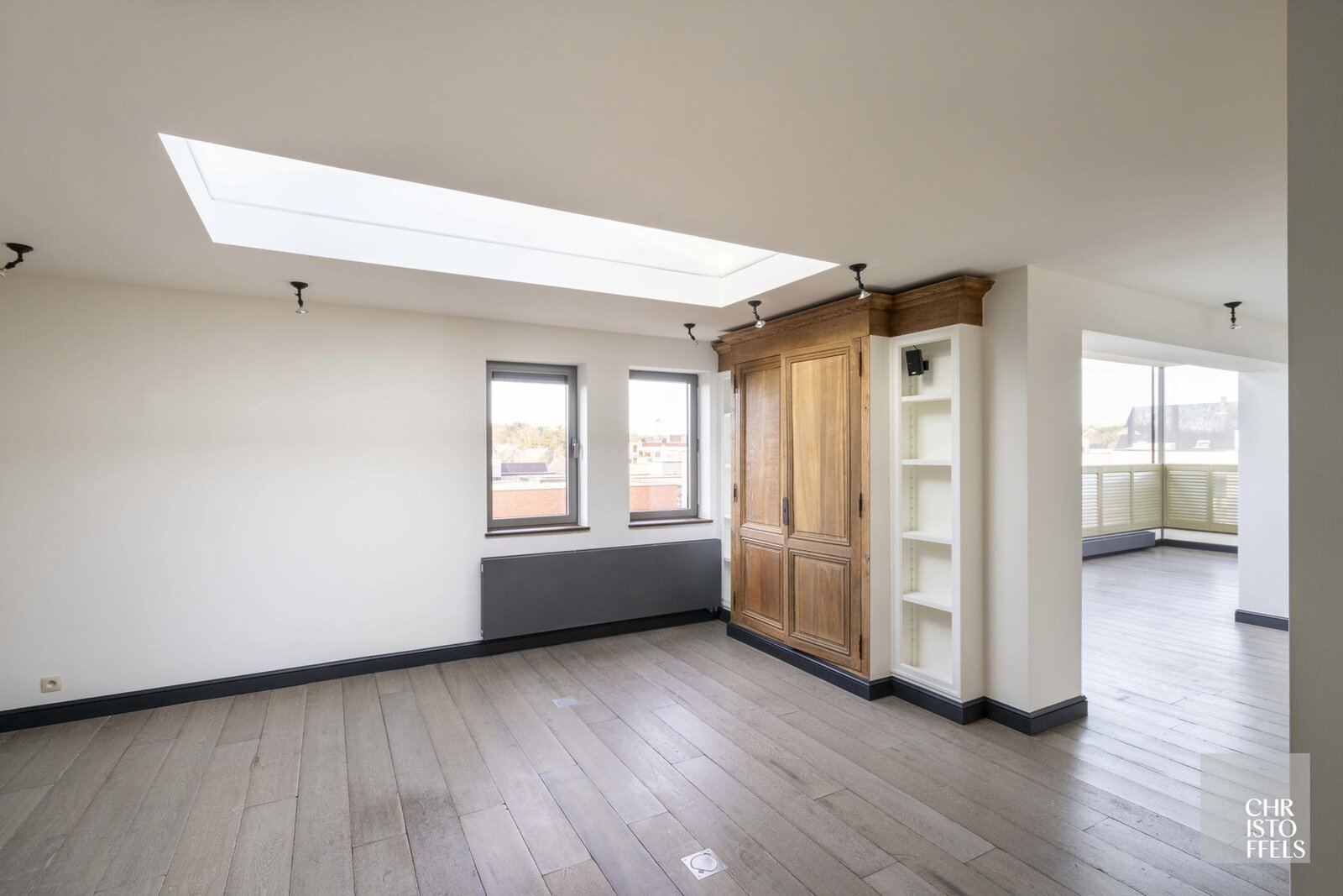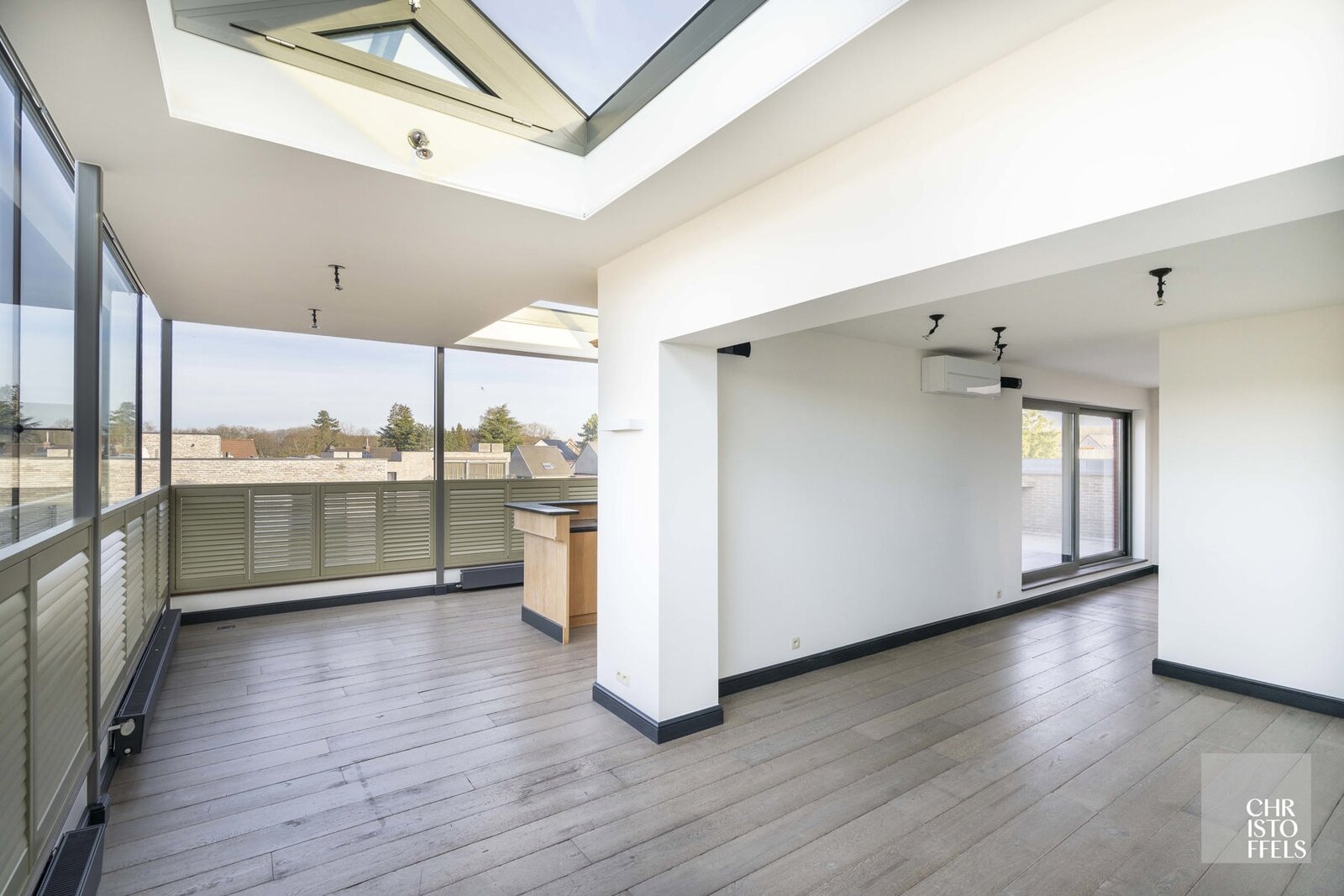 Het appartement is volledig afgewerkt met parketvloeren, maatwerk in eik en voorzien van screens, airconditioning en open dakkoepels voor extra ventilatie.