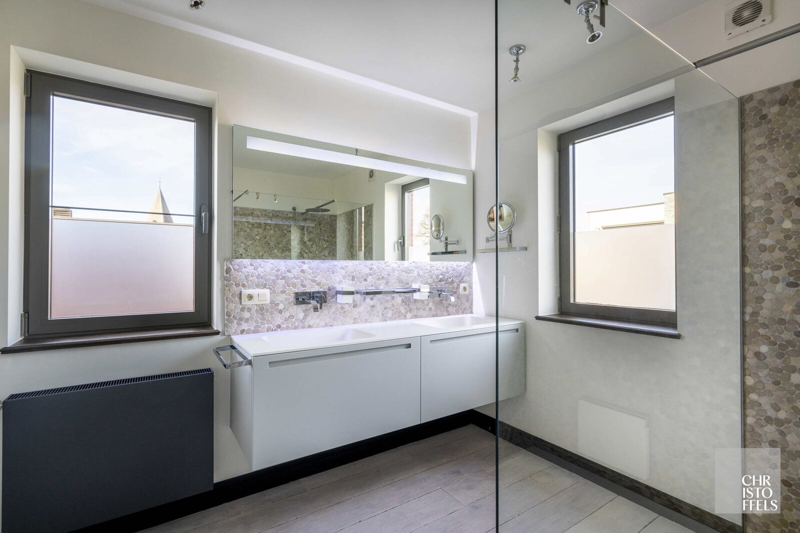 De masterbadkamer beschikt over een inloopregendouche en dubbele wastafel; de tweede badkamer is voorzien van een inloopdouche en enkele wastafel.