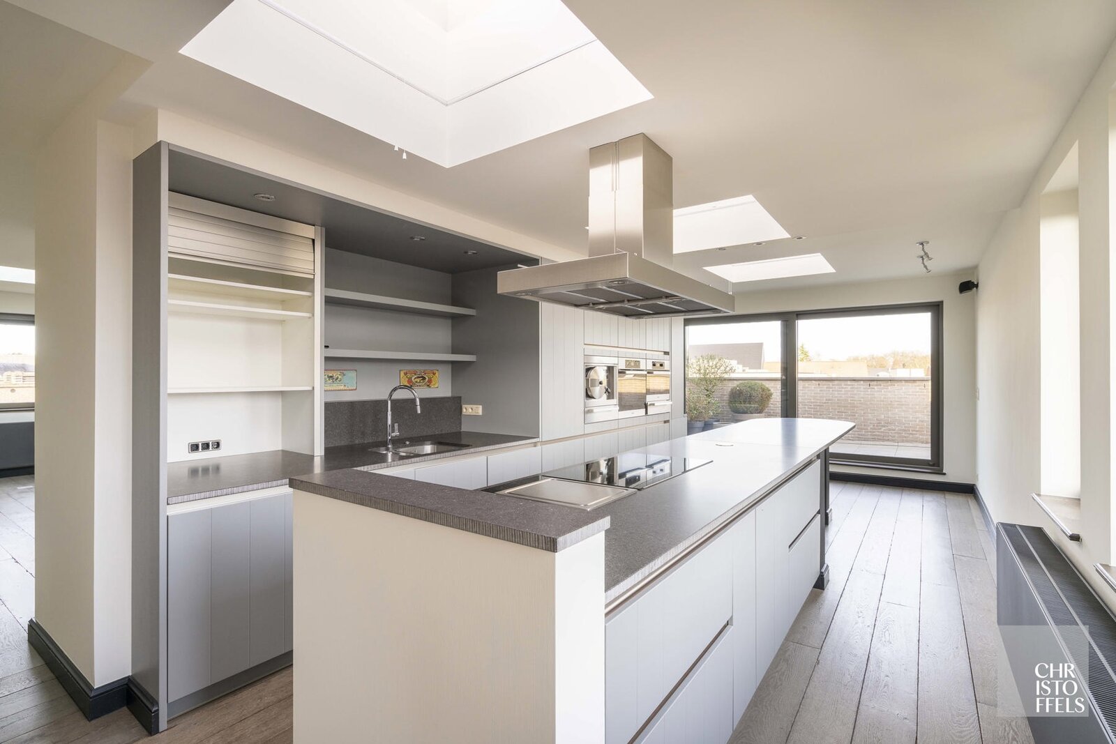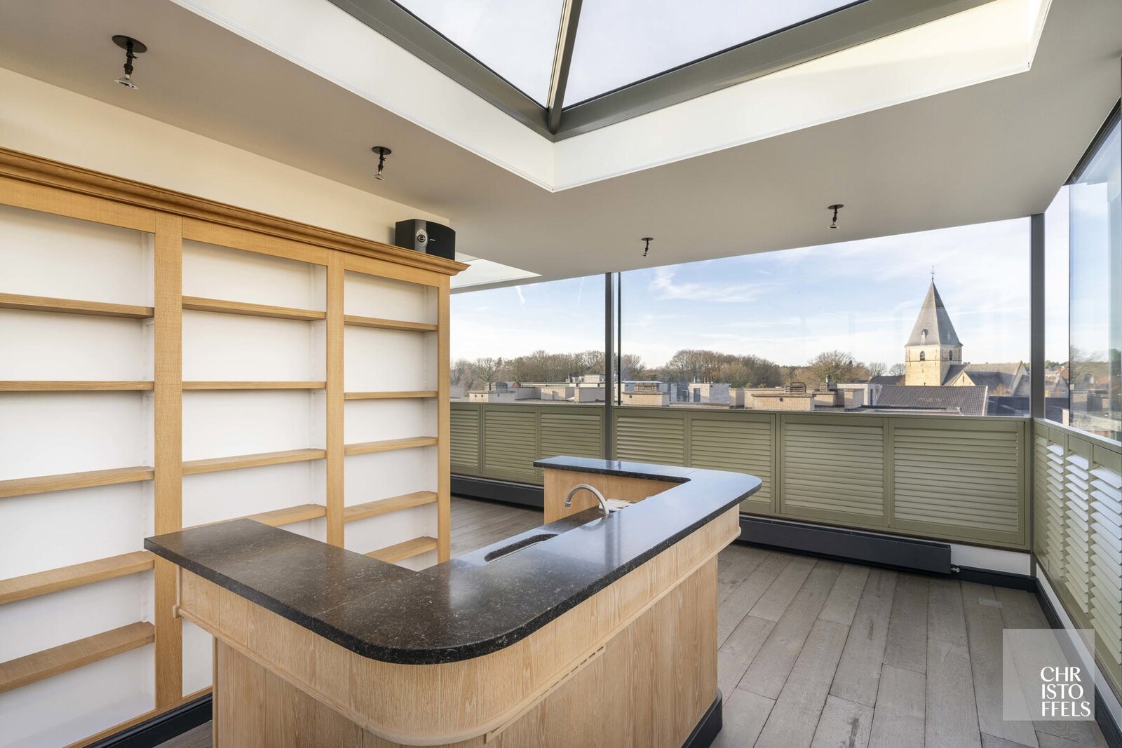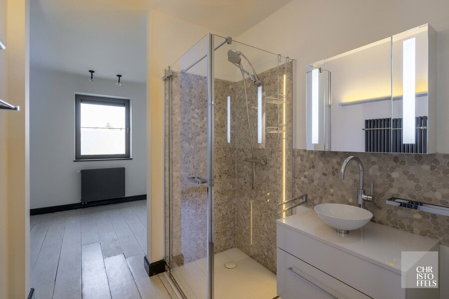 Via de royale inkomhal op de derde verdieping, voorzien van een gastentoilet en vestiaire, betreedt u de stijlvolle leefruimte. De woonkamer omvat een ruime zit- en eethoek en is afgewerkt met maatwerk, een bureauhoek en een elegante gashaard. Aansluitend bevindt zich de lichtrijke wintertuin met bar, die naadloos overgaat in het terras met zonneluifel en verwarming.