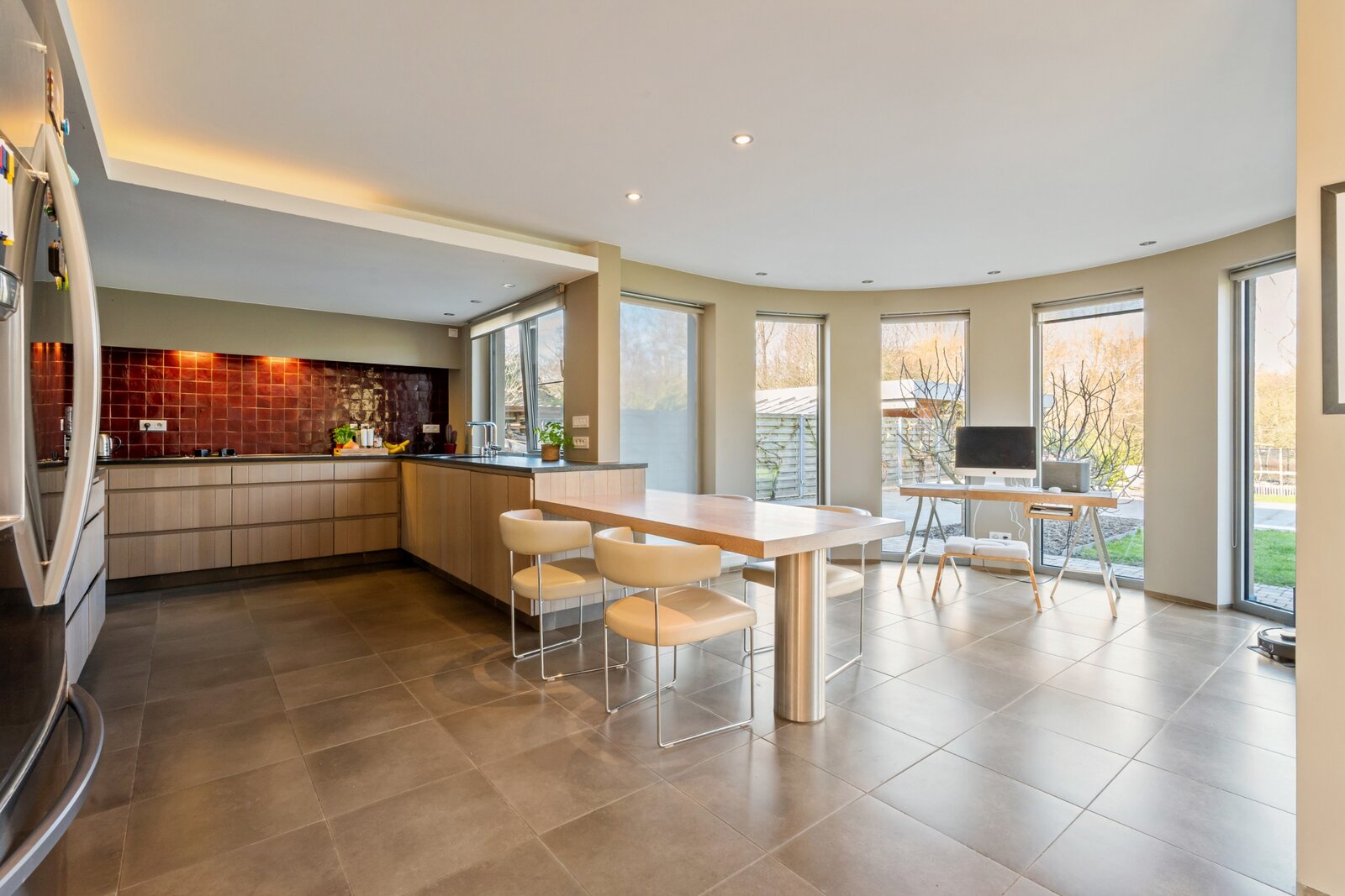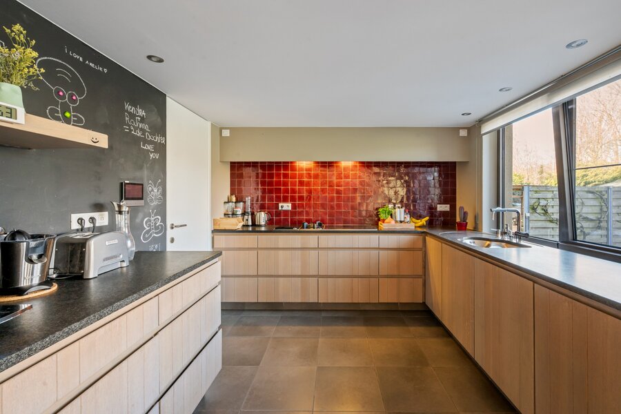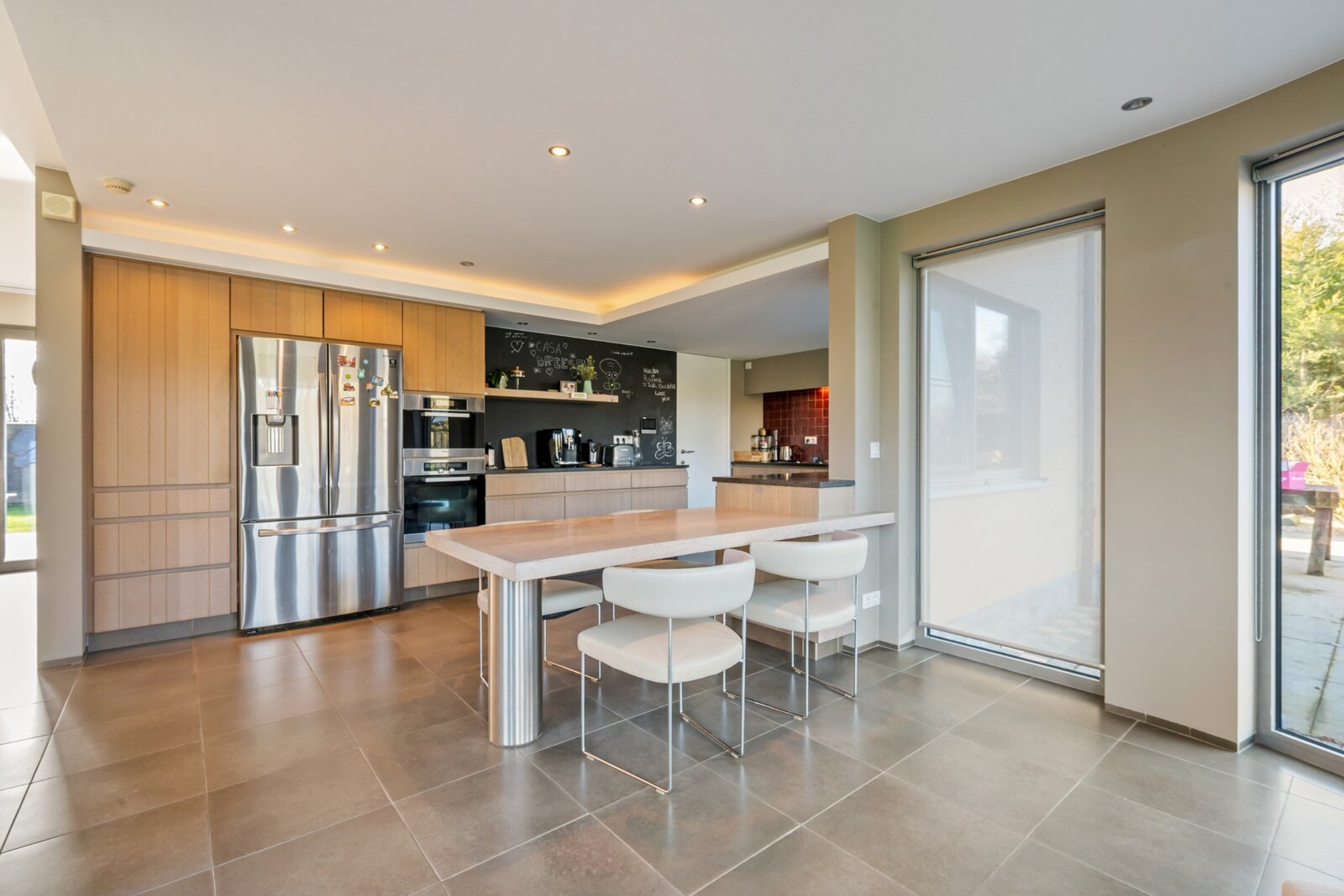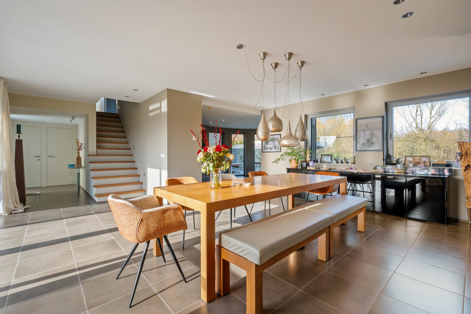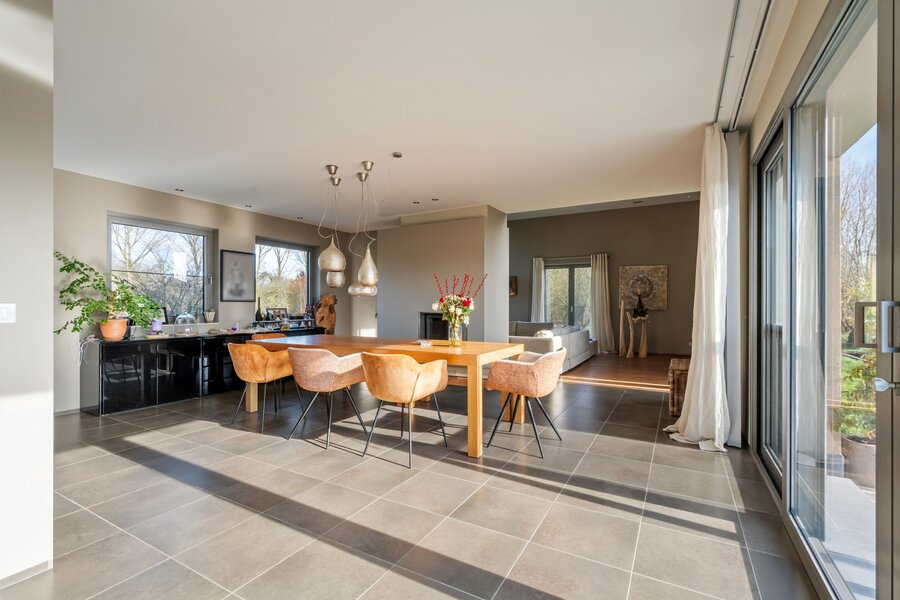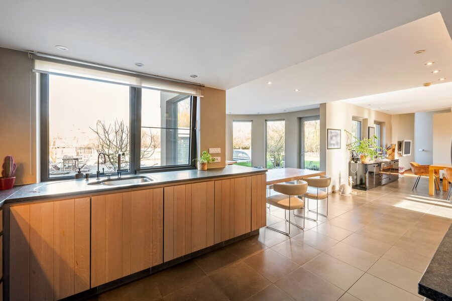 De ruime goed uitgeruste open keuken met prachtig zicht op de natuurlijke tuin en het omliggende groen. Hier kookt en leeft u met de seizoenen als decor. Open leefruimte met grote raampartijen en aan twee zijden zicht op de tuin en de terrassen, wat zorgt voor een uitzonderlijke connectie tussen binnen en buiten.Vooraan geniet u van een ommuurde, beschutte zone, ideaal voor extra privacy en geborgenheid. Praktische wasplaats/berging met voldoende opbergruimte.