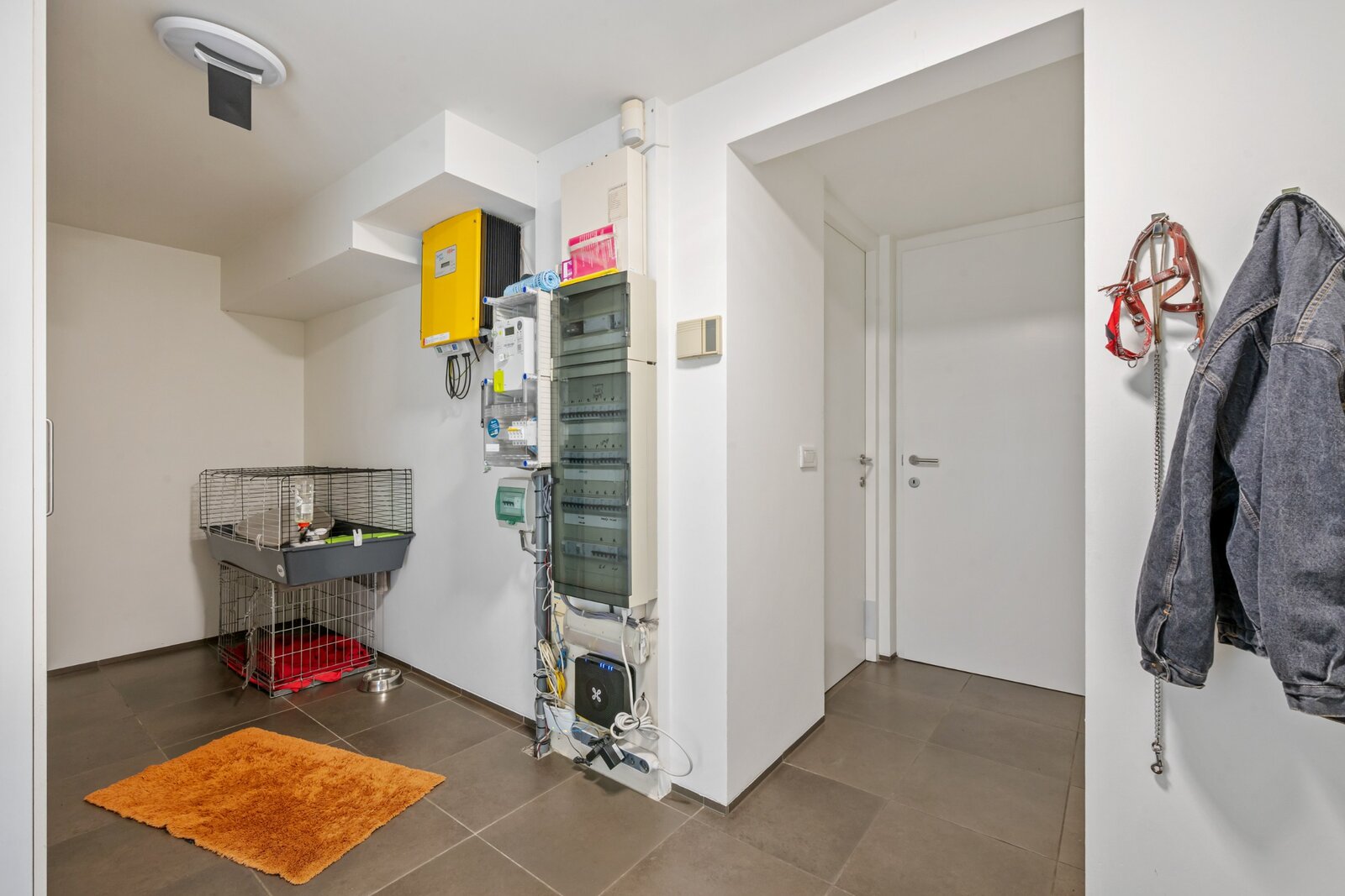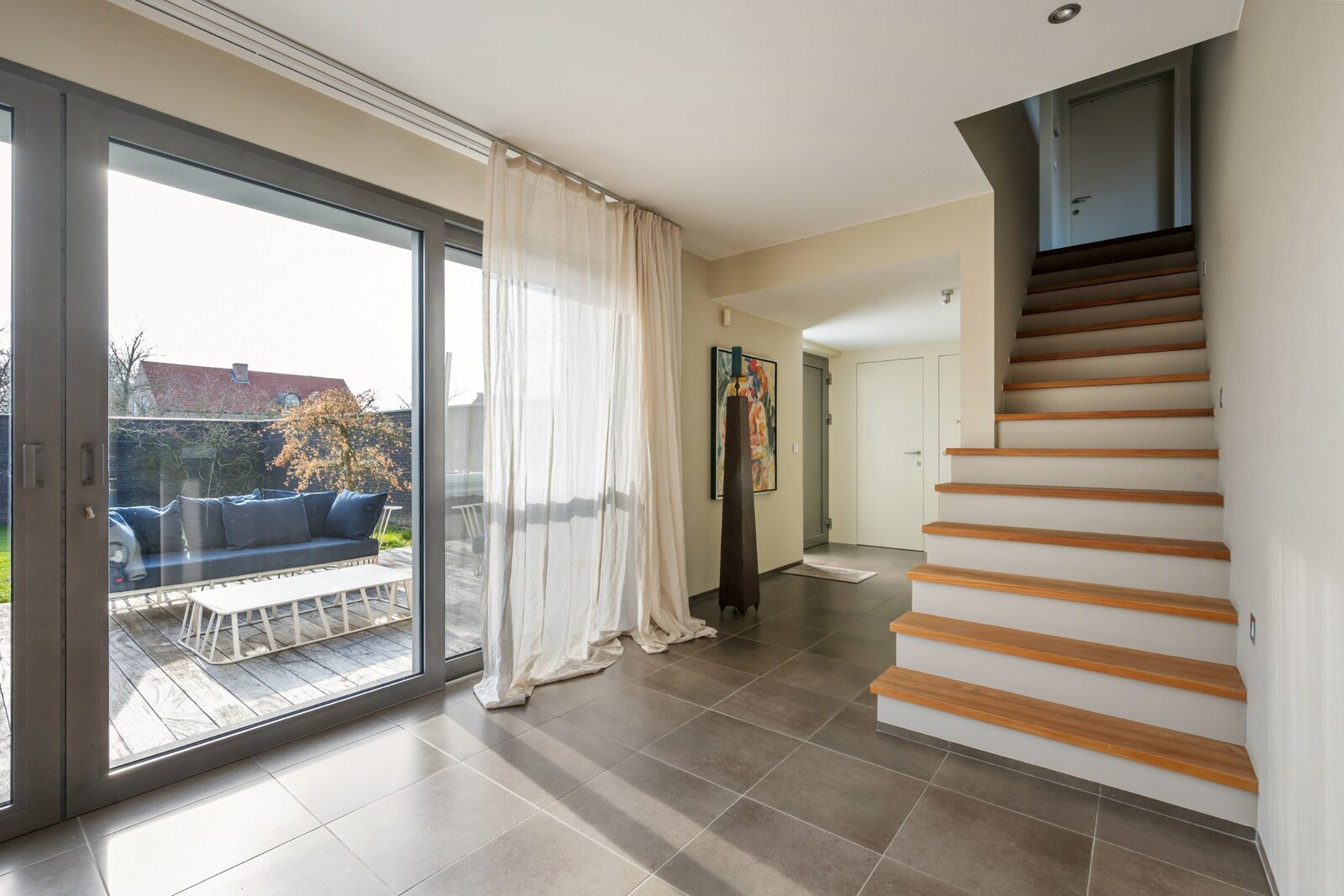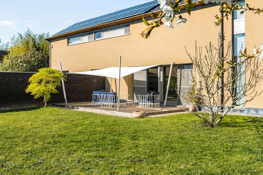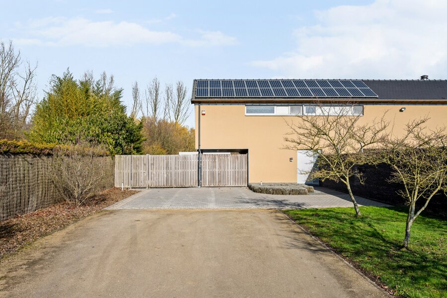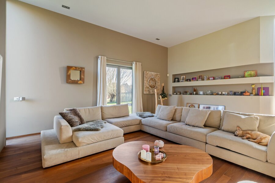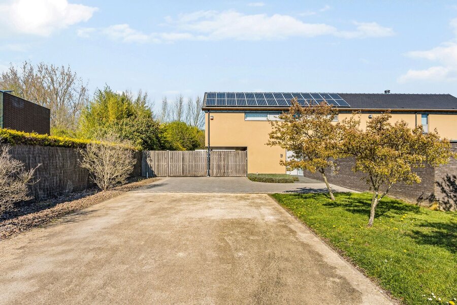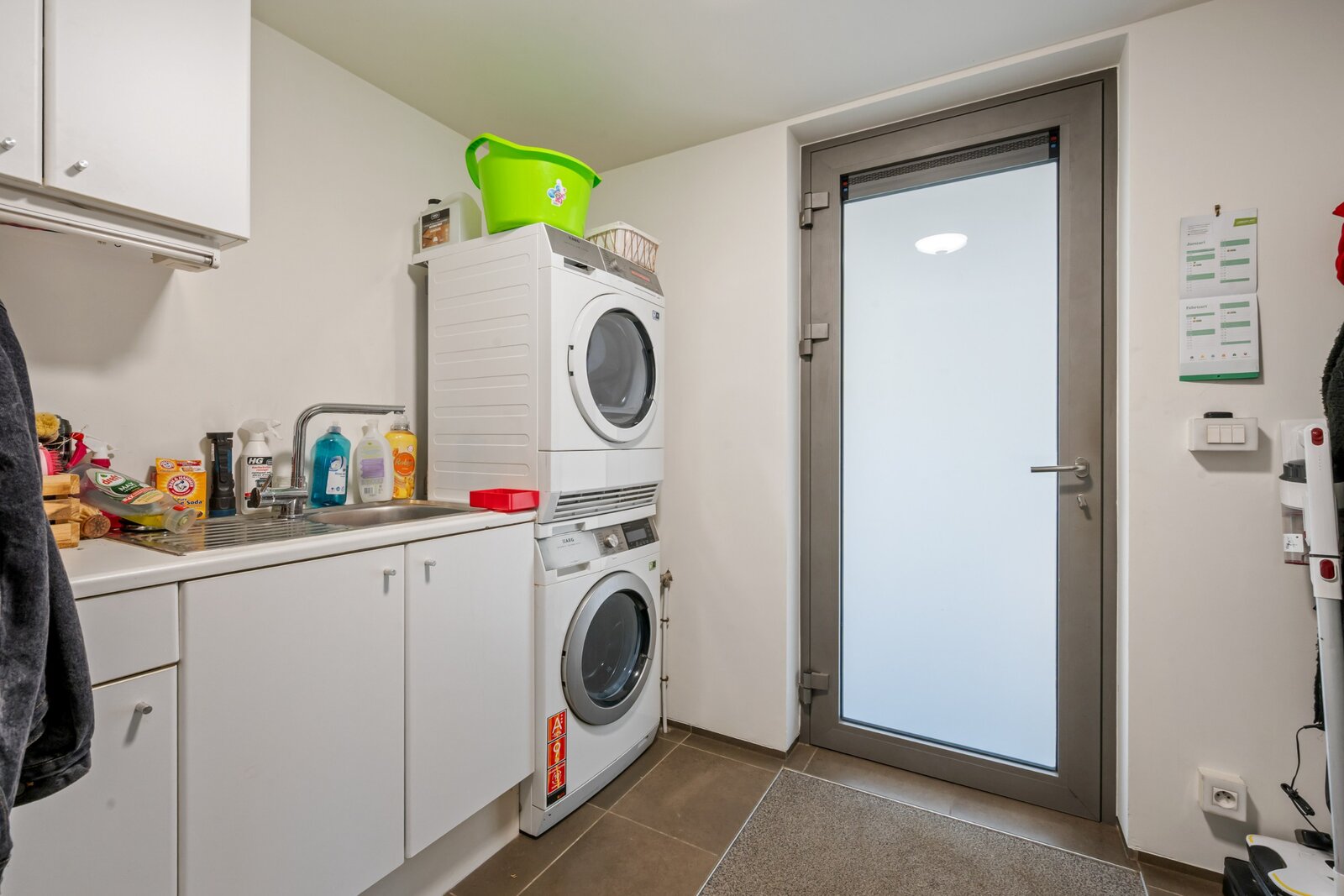 De ruime goed uitgeruste open keuken met prachtig zicht op de natuurlijke tuin en het omliggende groen. Hier kookt en leeft u met de seizoenen als decor. Open leefruimte met grote raampartijen en aan twee zijden zicht op de tuin en de terrassen, wat zorgt voor een uitzonderlijke connectie tussen binnen en buiten.Vooraan geniet u van een ommuurde, beschutte zone, ideaal voor extra privacy en geborgenheid. Praktische wasplaats/berging met voldoende opbergruimte.