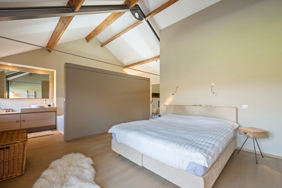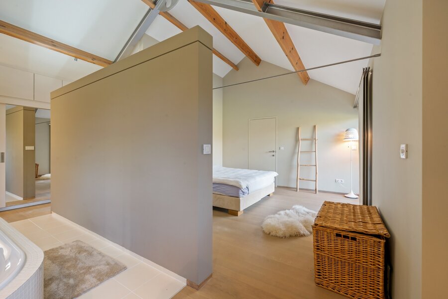 Masterbedroom met aansluitende badkamer en dressing – een volwaardige privésuite.