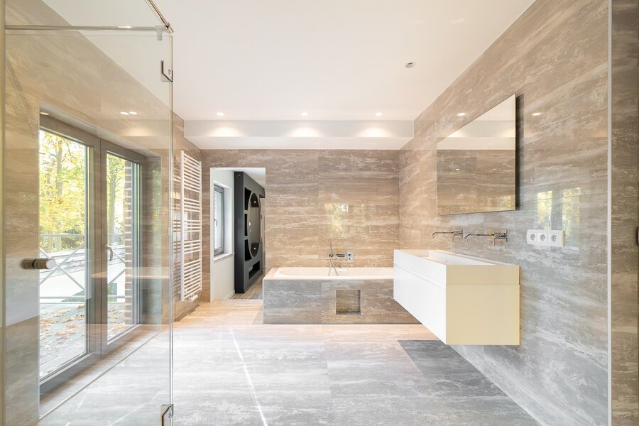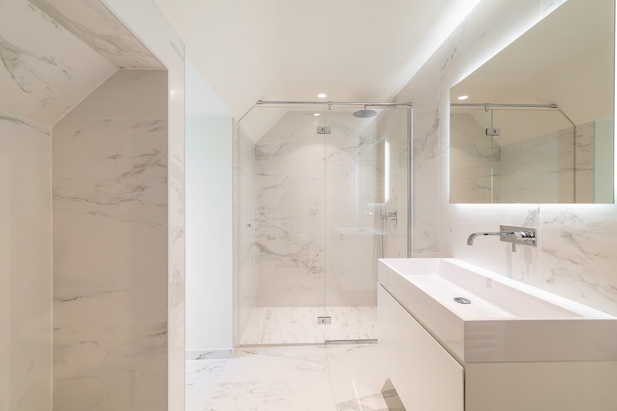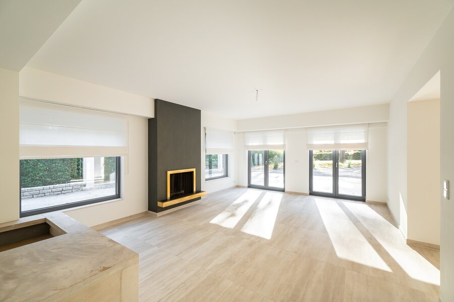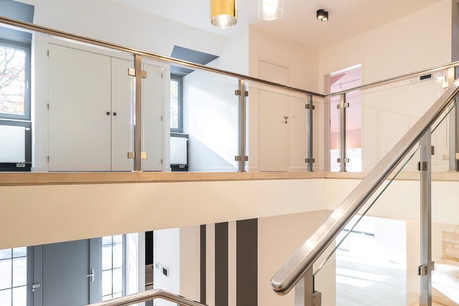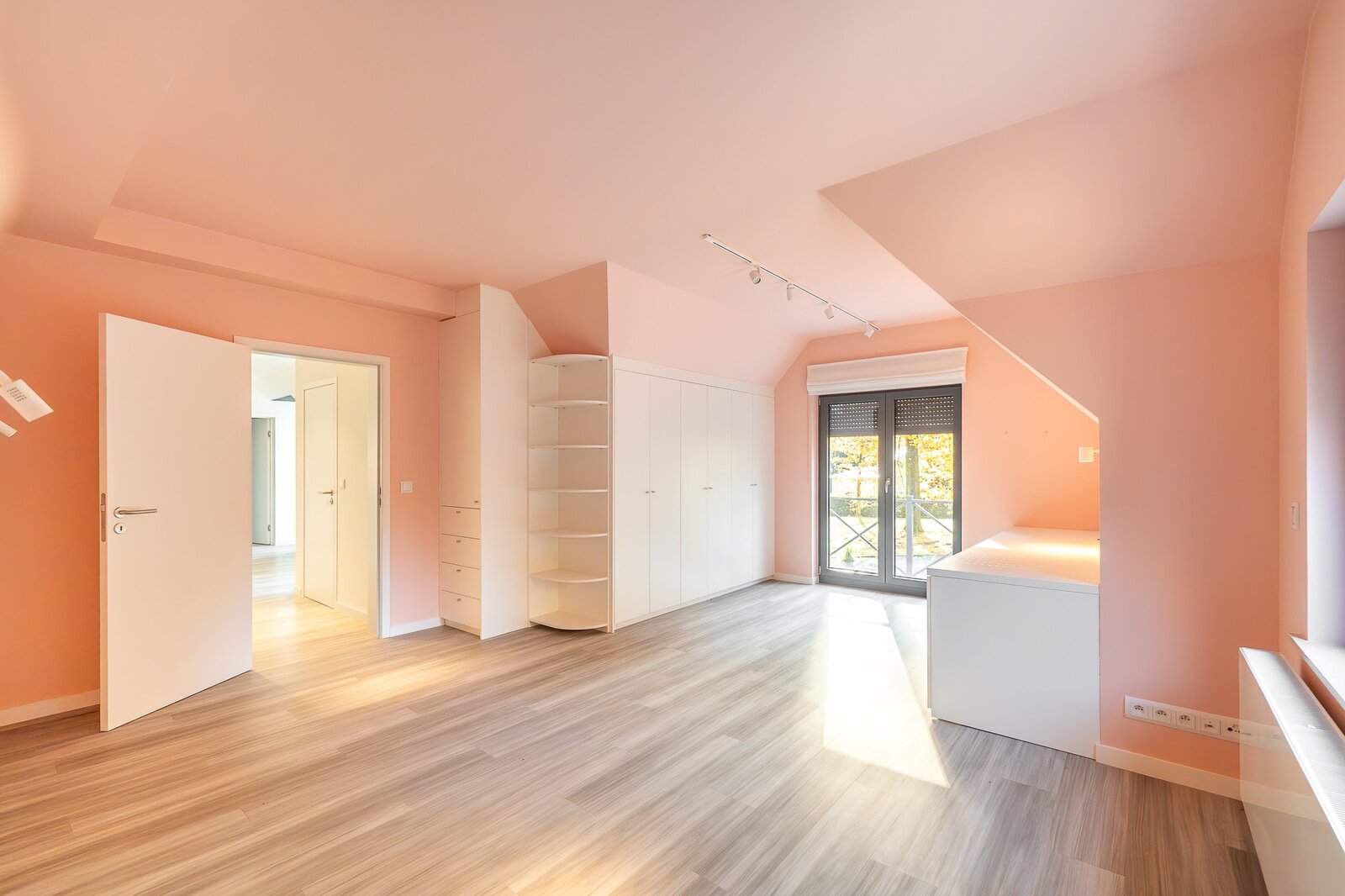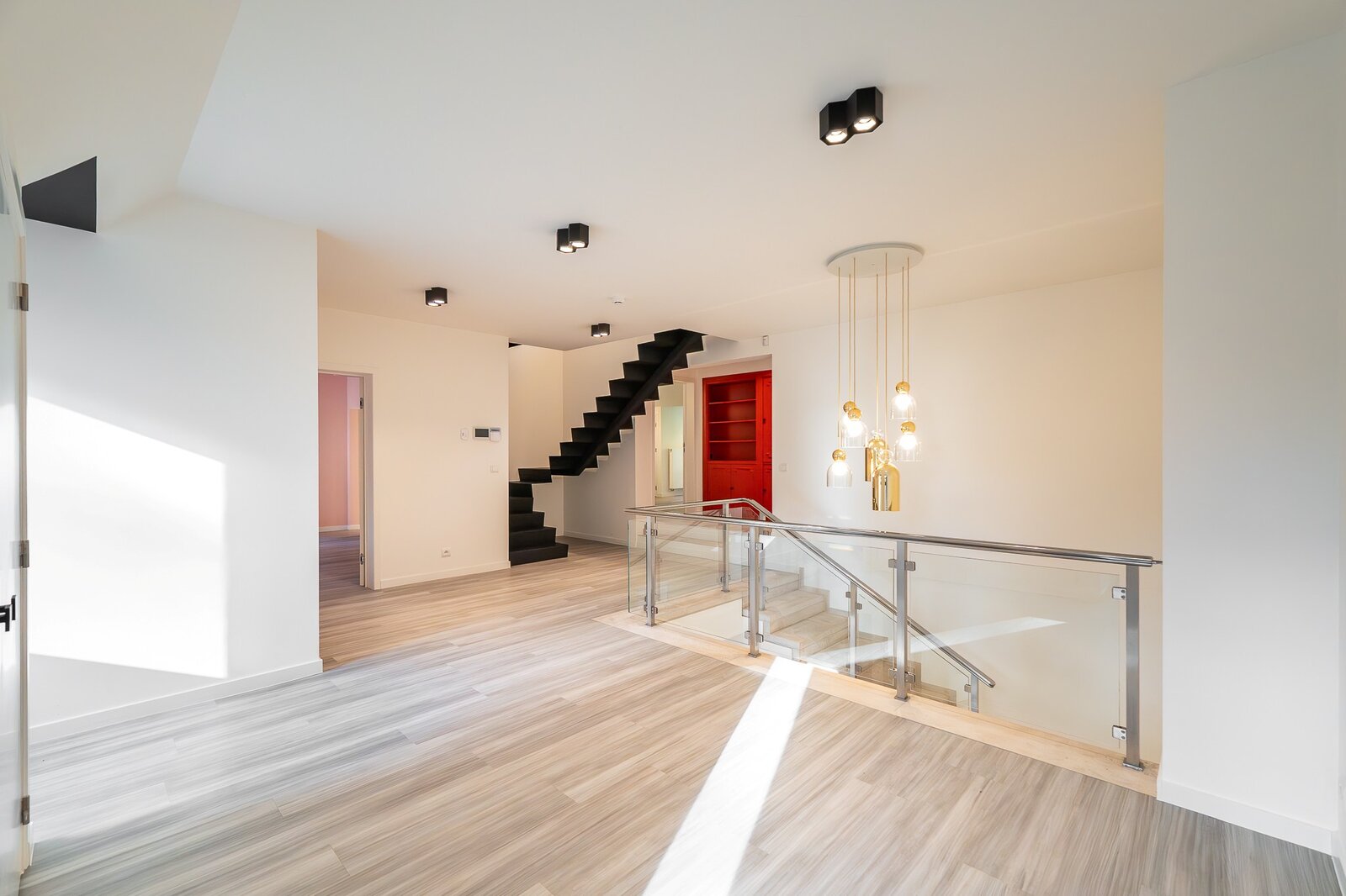 De begane grond heeft een ruime hal, lichte ontvangstruimtes en een gezellige, volledig uitgeruste keuken. De bovenverdieping heeft twee slaapkamers met badkamers en een ouderlijke suite met kleedkamer, eigen badkamer en terras. De tweede verdieping biedt een veelzijdige ruimte, een extra slaapkamer, een badkamer en een wasruimte. In de kelder is er een sportschool, speelkamer en veel opbergruimte.