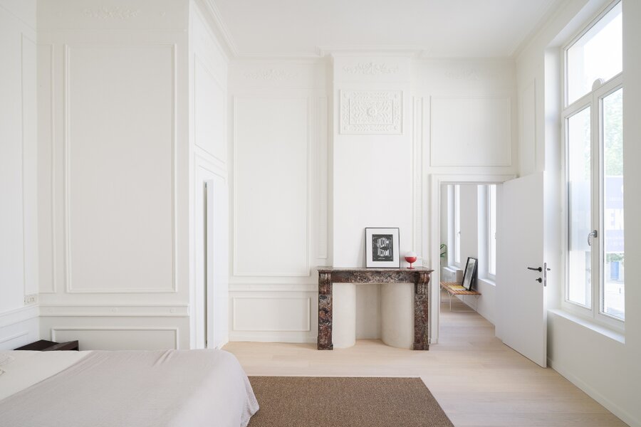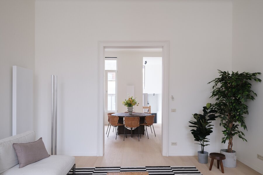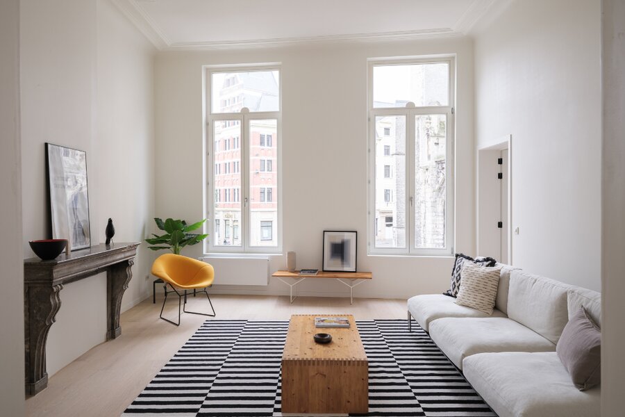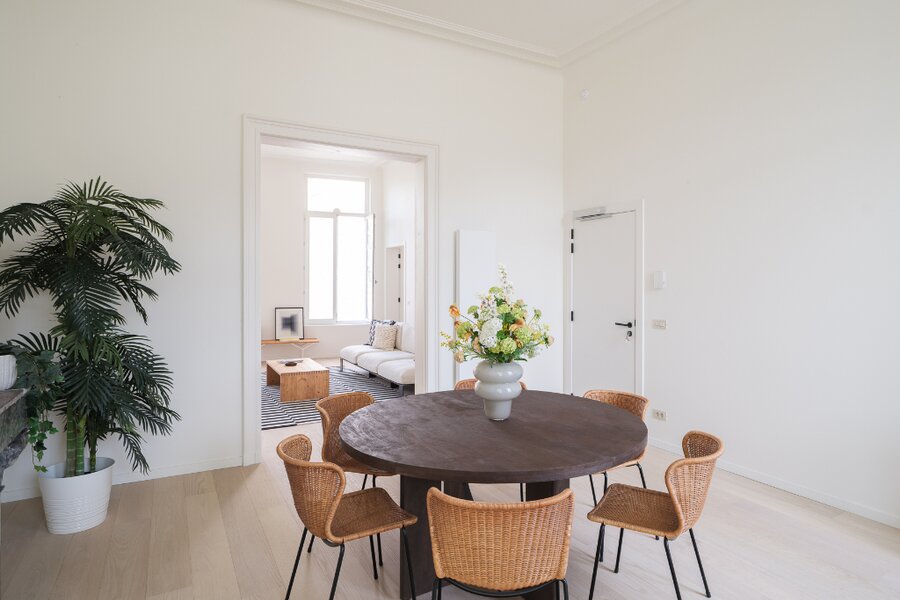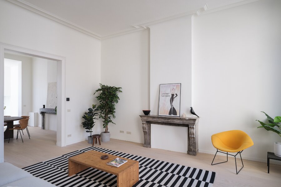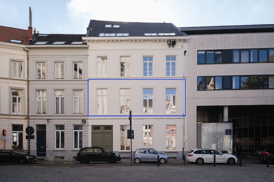 Het luxe appartement met herenhuis allures verdeelt zich over de volledige eerste verdieping en beschikt over enkele unieke elementen. De indrukwekkende plafondhoogtes, de authentieke sierlijsten en het imposant volume spreken tot de verbeelding.