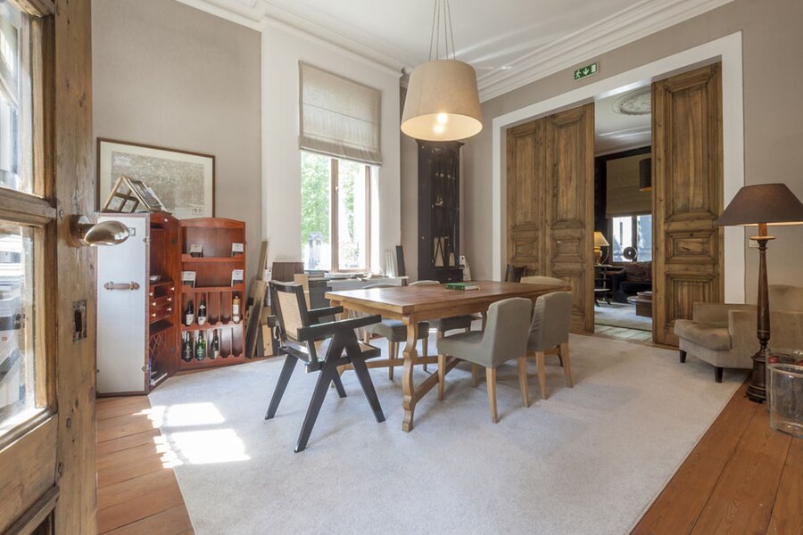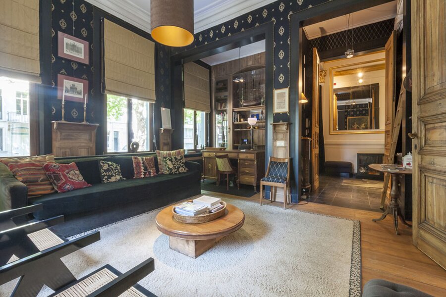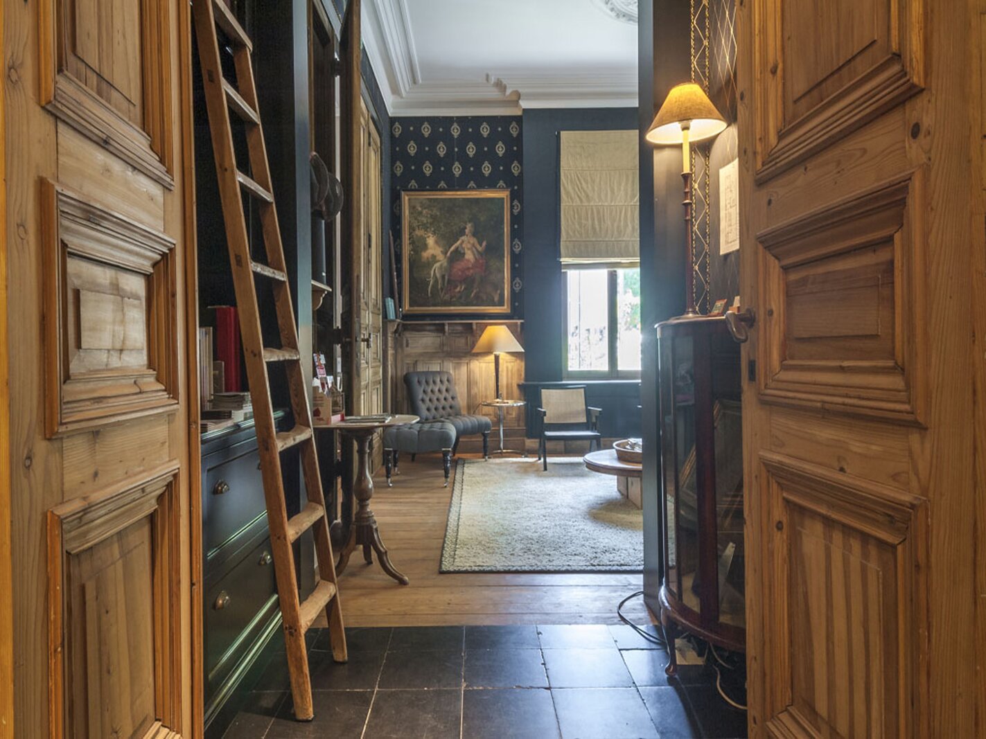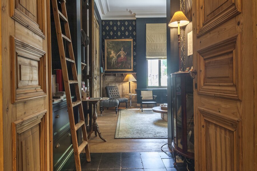 Via de inkomhal in zwarte natuursteen bereikt u de lichtrijke leefruimtes: salon met bibliotheek en eetkamer, beide met uitzicht op de tuin. Dankzij de drie gevels geniet de woning van veel natuurlijk licht. Hoge plafonds, houten lambriseringen en dubbele deuren zorgen voor een warme, huiselijke sfeer. De recent vernieuwde keuken sluit eveneens aan op de tuin.