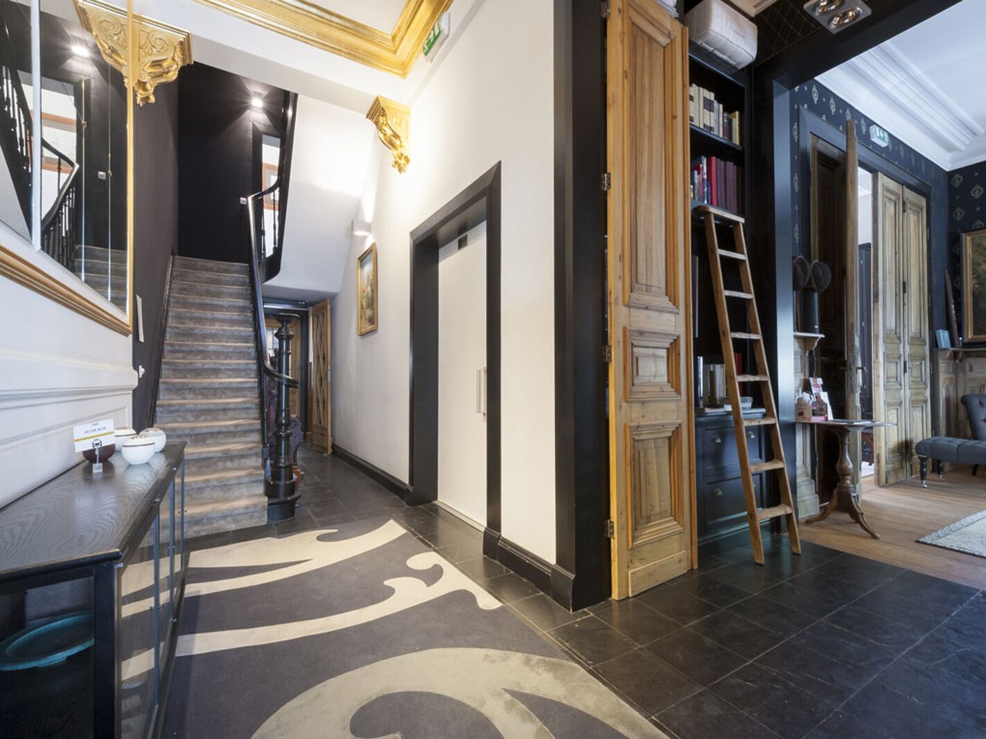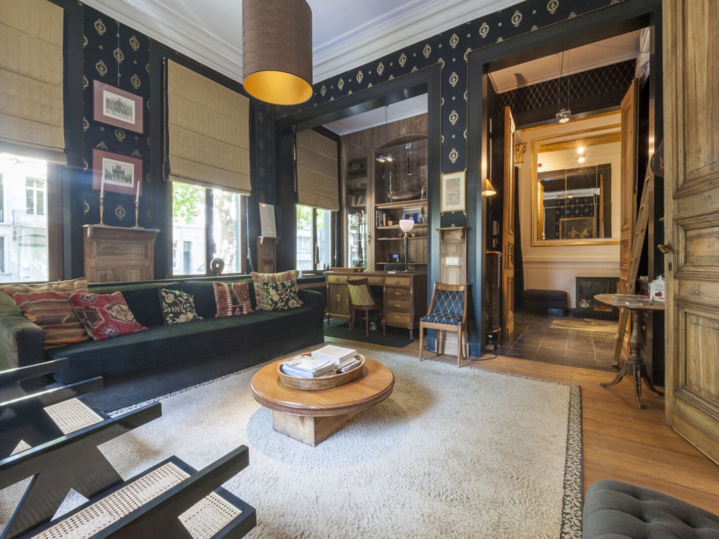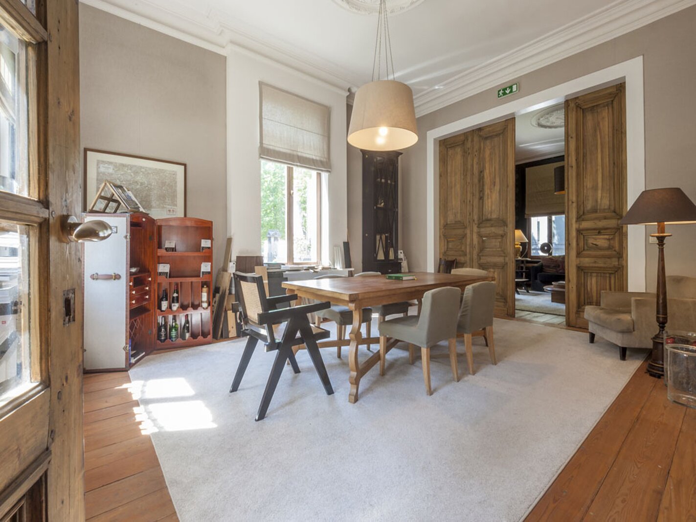 Via de inkomhal in zwarte natuursteen bereikt u de lichtrijke leefruimtes: salon met bibliotheek en eetkamer, beide met uitzicht op de tuin. Dankzij de drie gevels geniet de woning van veel natuurlijk licht. Hoge plafonds, houten lambriseringen en dubbele deuren zorgen voor een warme, huiselijke sfeer. De recent vernieuwde keuken sluit eveneens aan op de tuin.