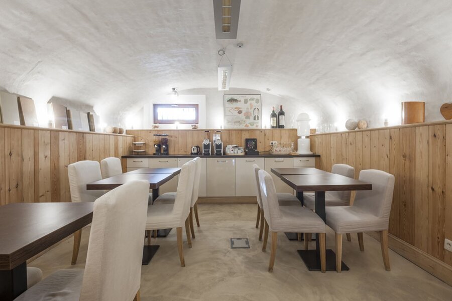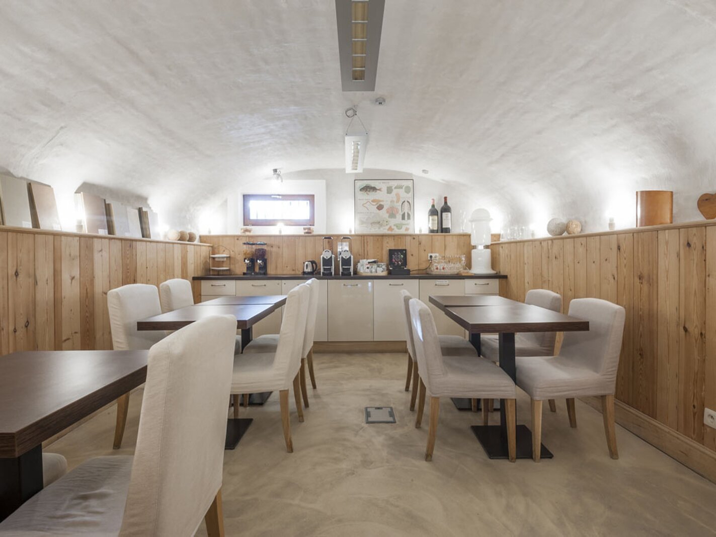 Het souterrain biedt gewelfde ruimtes ingericht als vergader- en ontbijtruimte, met toegang tot de tuin, plus technische ruimte en kitchenette.