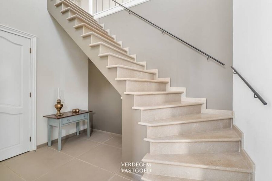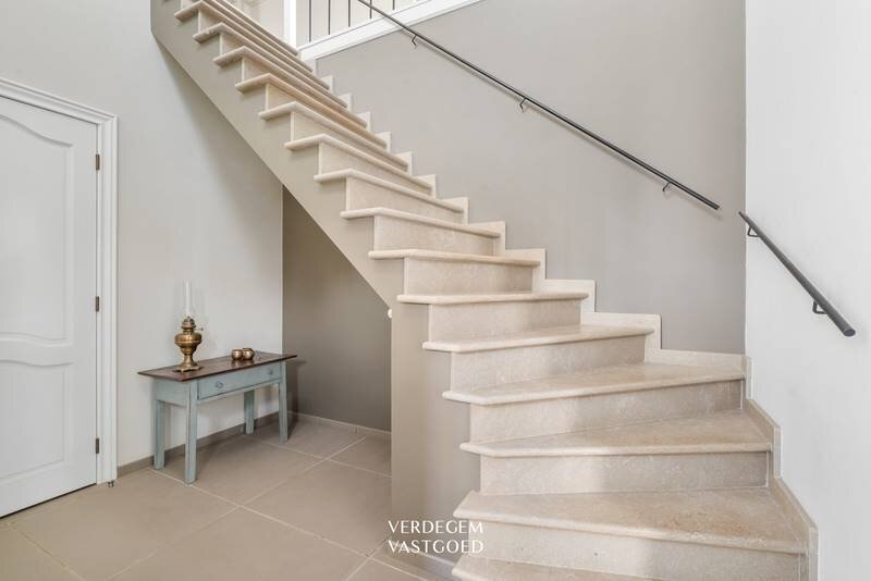 De prachtige voordeur brengt je naar de inkomhal met een statige trap en gastentoilet.