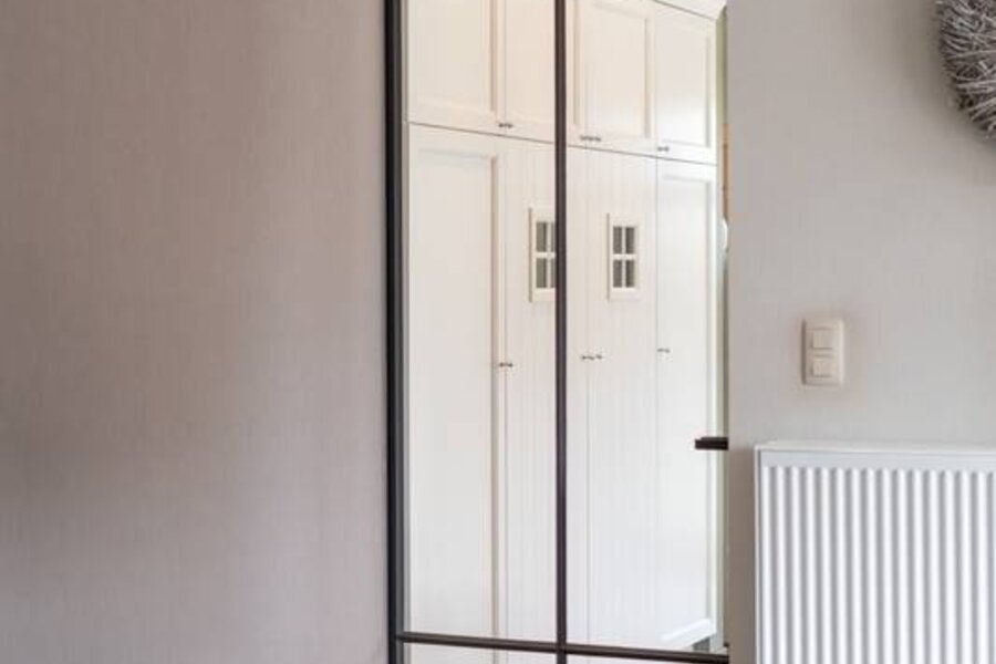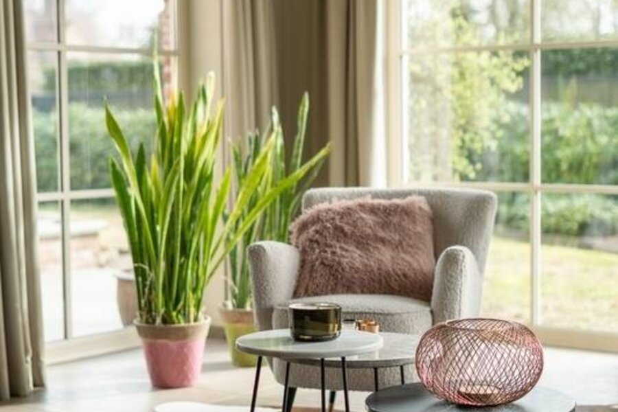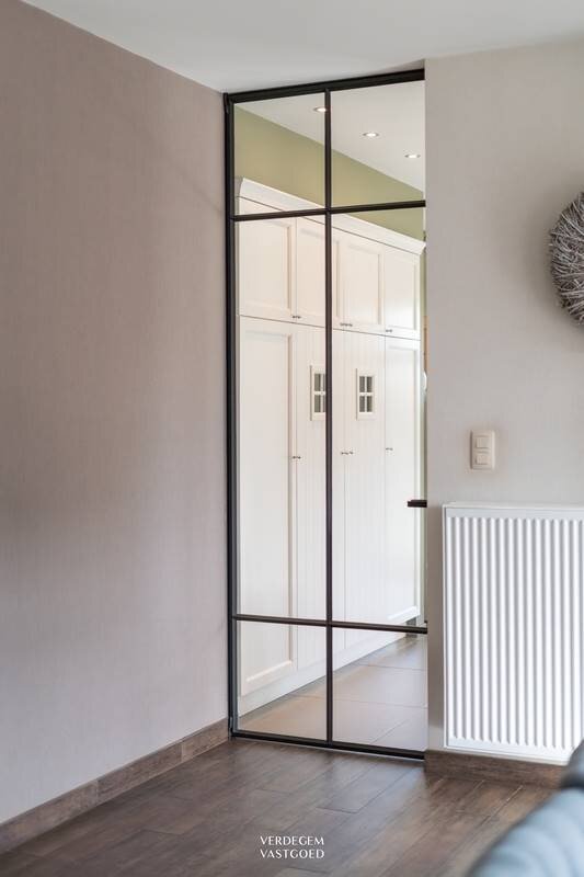 Een mooie glazen deur geeft toegang tot de ruime leefruimte.