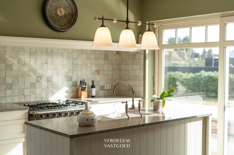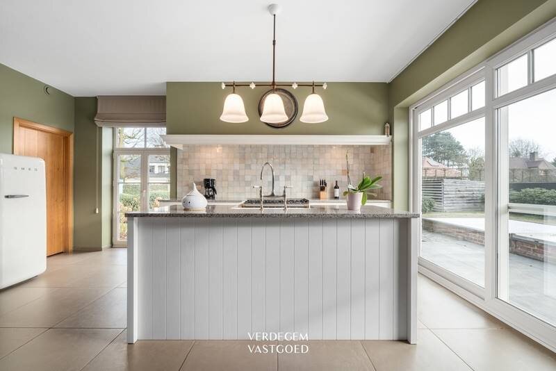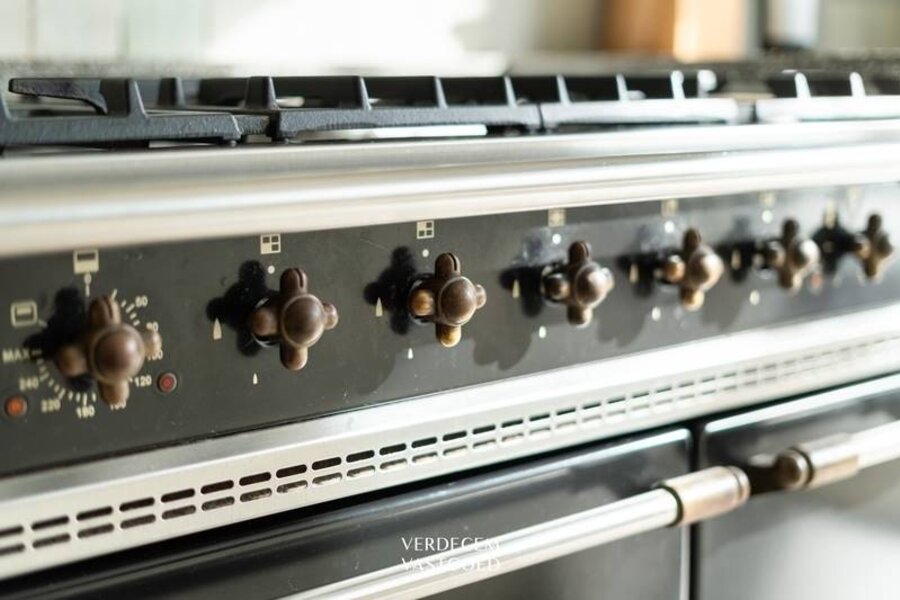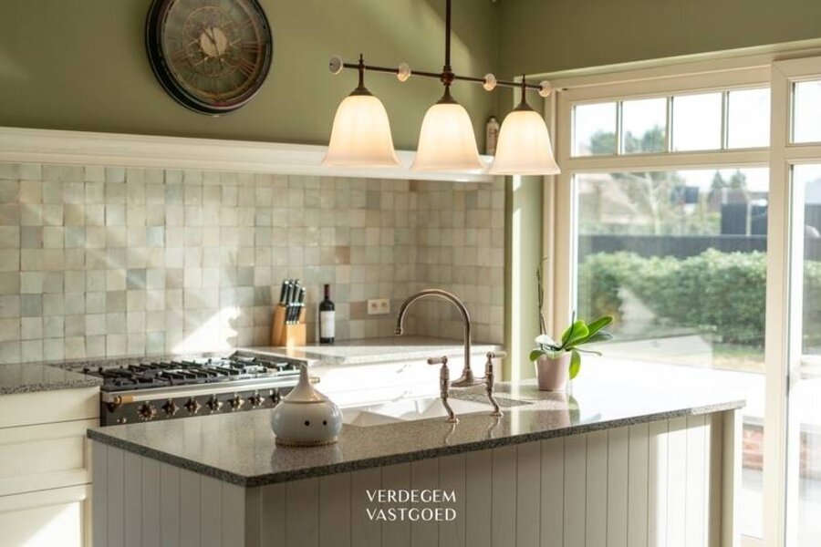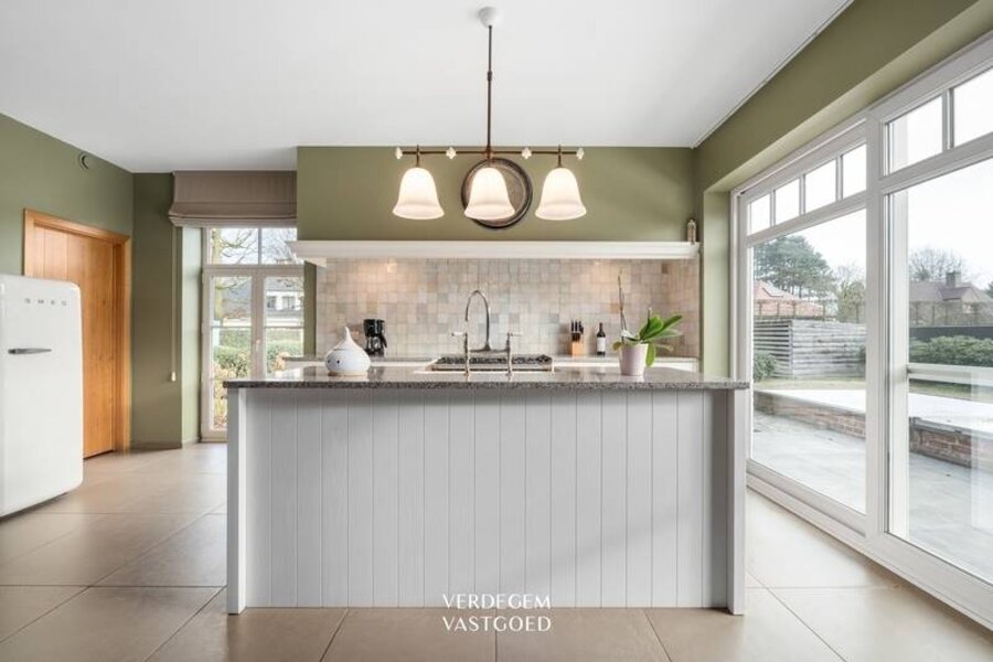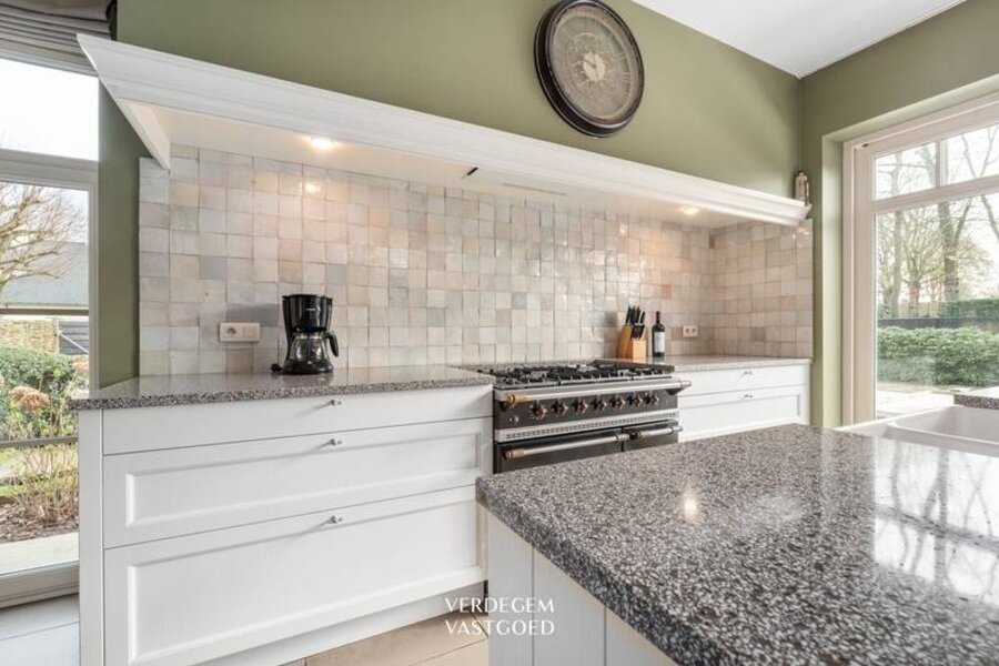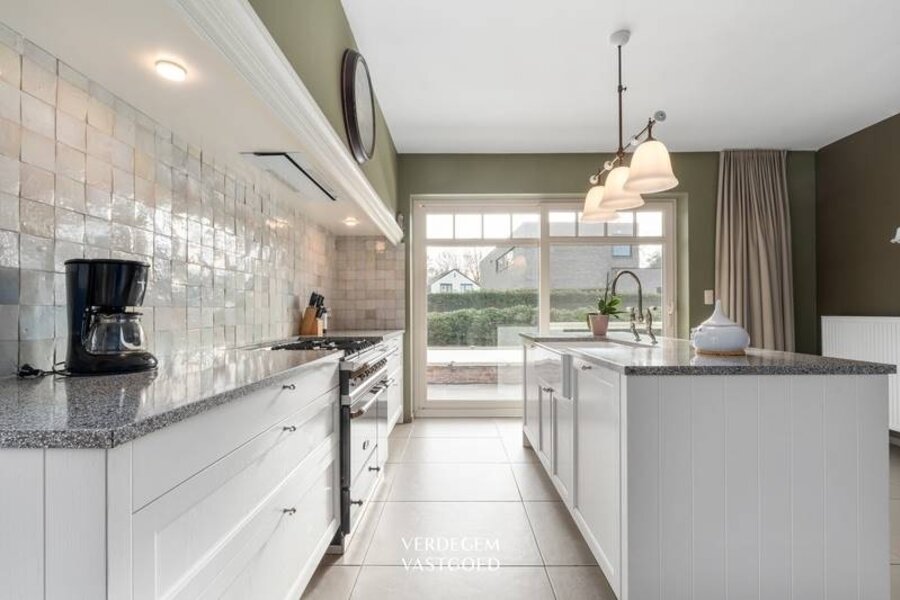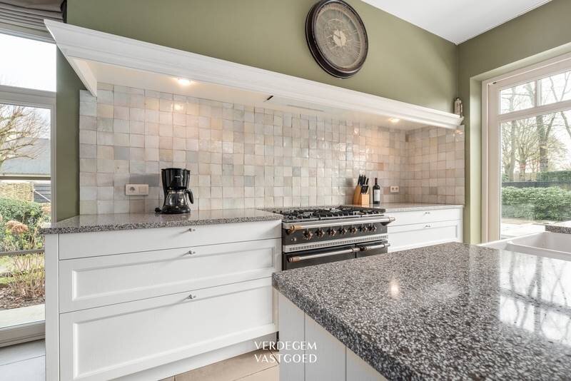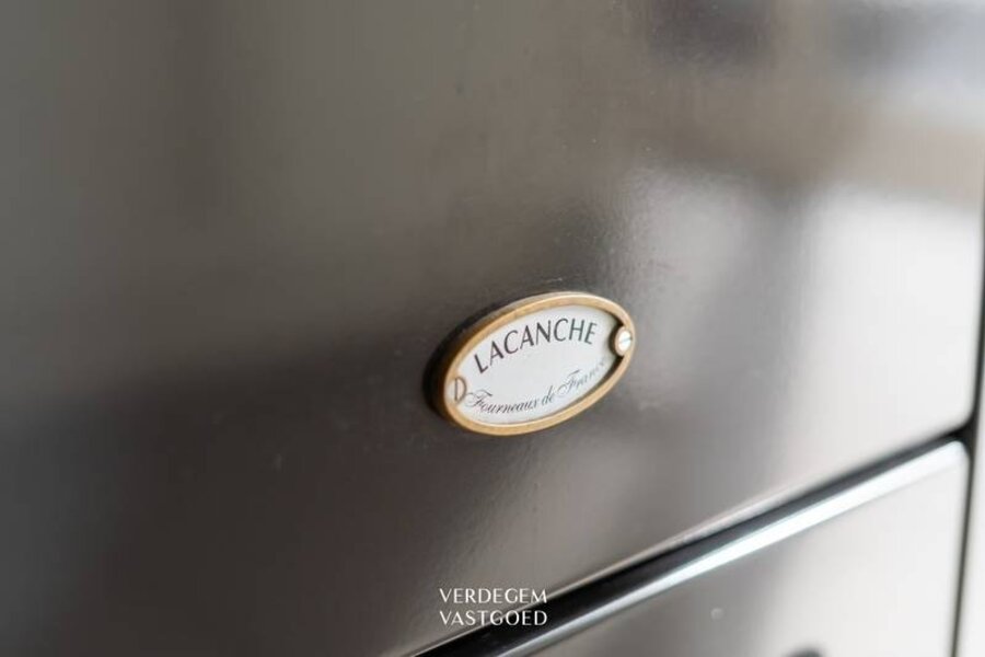 De semi-open keuken is ingericht in een elegante stijl en is uitgerust met kwalitatieve materialen, een composiet werkblad, zelliges, Lacanche vuur enz.